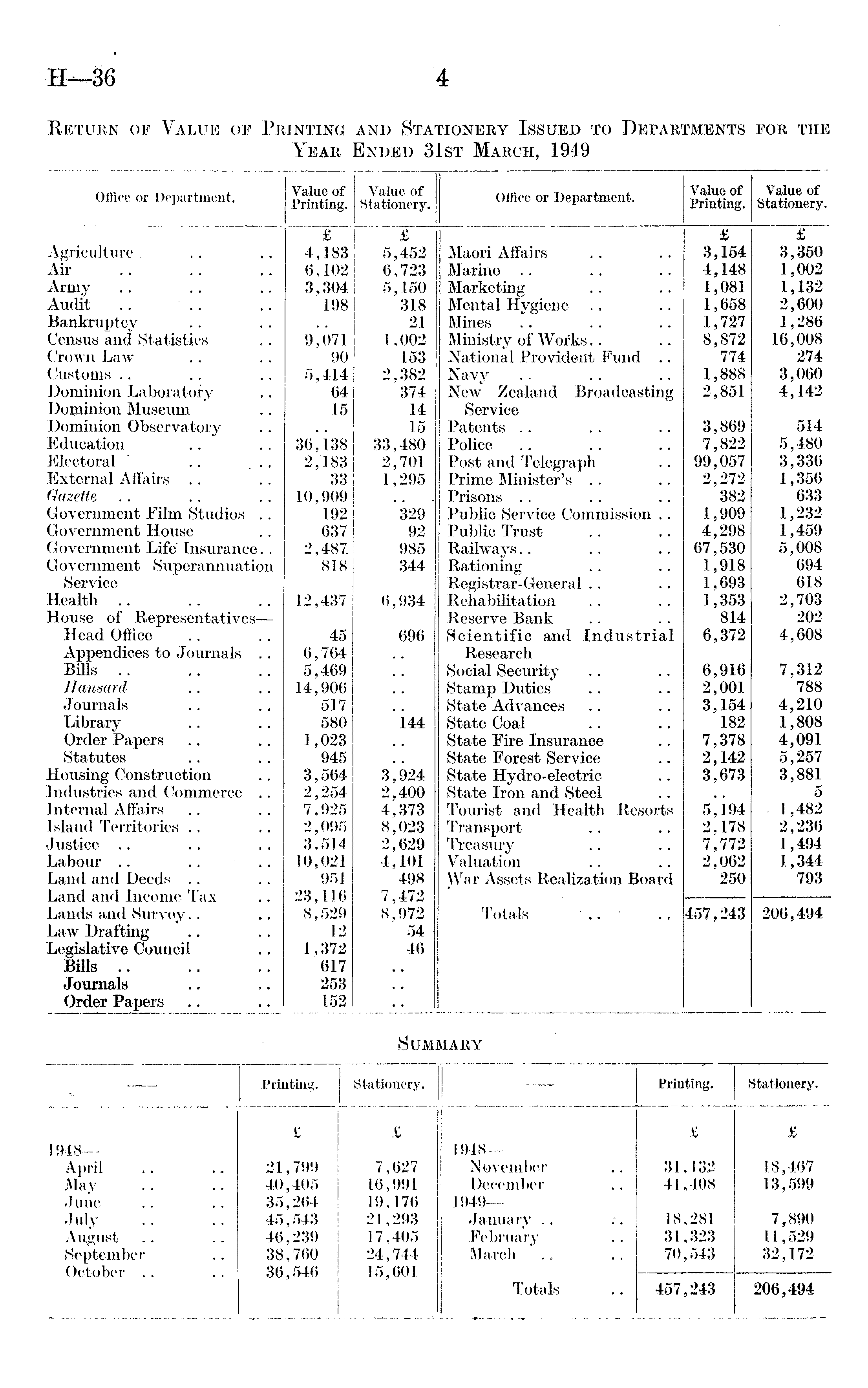 Return of Value of Printing and Stationery Issued to Departments for the Year Ended 31st March, 1949