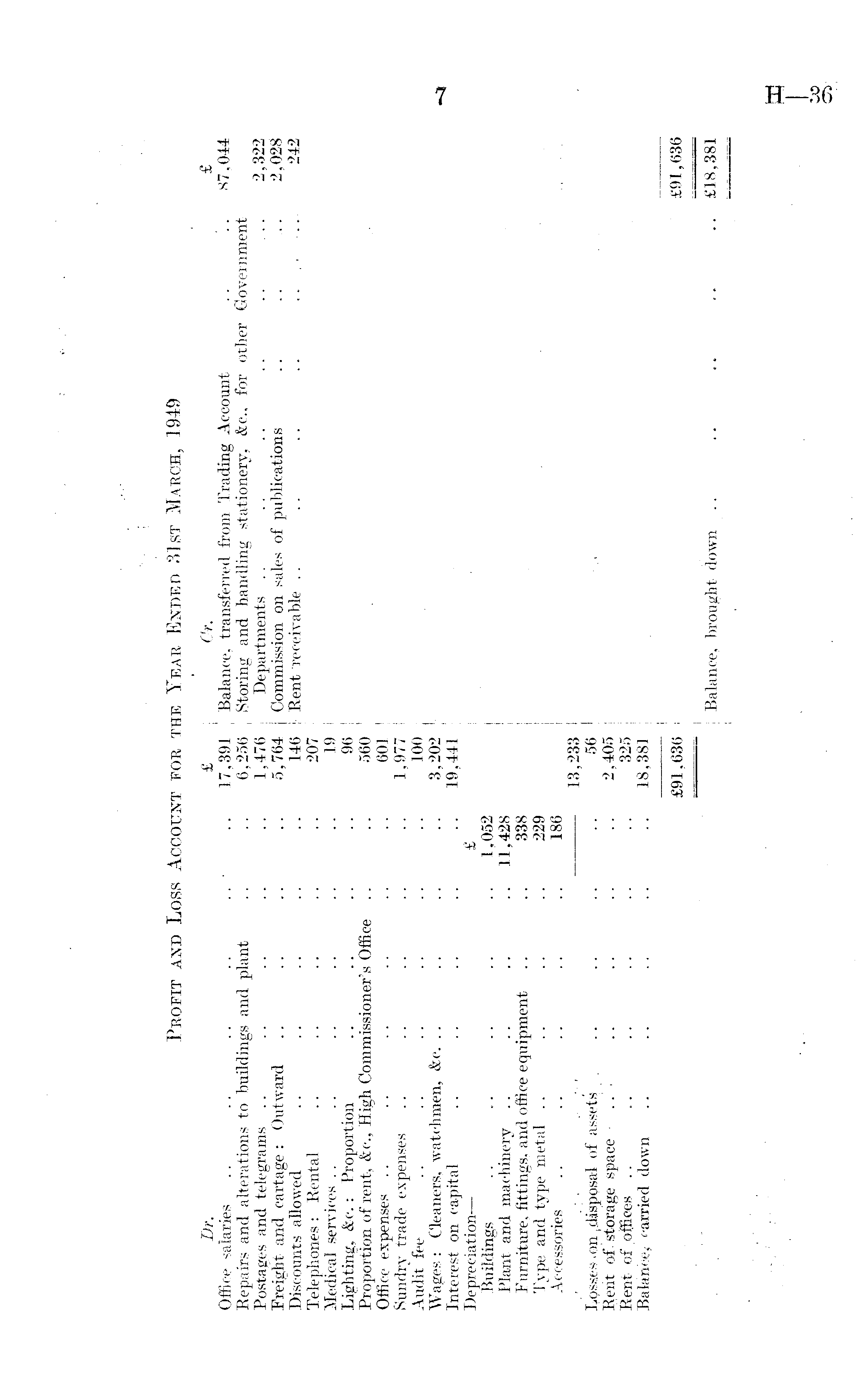 Profit and Loss Account for the Year Ended 31st March, 1949 Dr. £ Or. _ £ Office salaries .. .. .. .. .. • .. 17,391 Balance, transferred from Trading Account .. .. 87,044 Repairs and alterations to buildings "and plant .. .. 6,256 Storing and handling stationery, &c, for other Government Postages and telegrams .. . . .. .. .. 1,476 Departments . . . . . . .. .. ... 2,322 Freight and cartage: Outward .. .. .. .. 5,764 Commission on sales of publications .. .. ... 2,028 Discounts allowed .. . . .. .. .. 146 : Rent receivable . . . . .. .. ..,,.. 242 Telephones: Rental .. .. .. .. .. 207 Medical services . . .. .. .. . . .. 19 ■ Lighting, &c. : Proportion .. .. .. . . 96 Proportion of rent, &c., High Commissioner's Office .. .. 560 Office expenses . . .. .. .. . . .. 601 Sundry" trade expenses .. .. .. .. .. 1,977 Audit fee .. .. .. .. .. .. 100 Wages: Cleaners, watchmen, &c. .. .. .. .. 3,202 Interest on capital .. .. .. .. .. 19,441 Depreciation— £ Buildings .. .. ..' .. .. 1,052 Plant and machinery .. .. .. .. 11,428 Furniture, fittings, and office equipment .. .. 338 Type and tyj)e metal .. . . .. .. 229 Accessories .. .. .. .. .. 186 ..; . .: ~.. 13,233 Losses, on ~disposal of assets ■. ........ 56 Rent of. storage space - ..'. .. .. .. .. 2,405 Rent of offices .. .. . . .. .. .. 325 Balance,- carried down .. .. .. .. .. 18,381 £91,636 £91,636 Balance, brought down .. .. .. .... £18,381