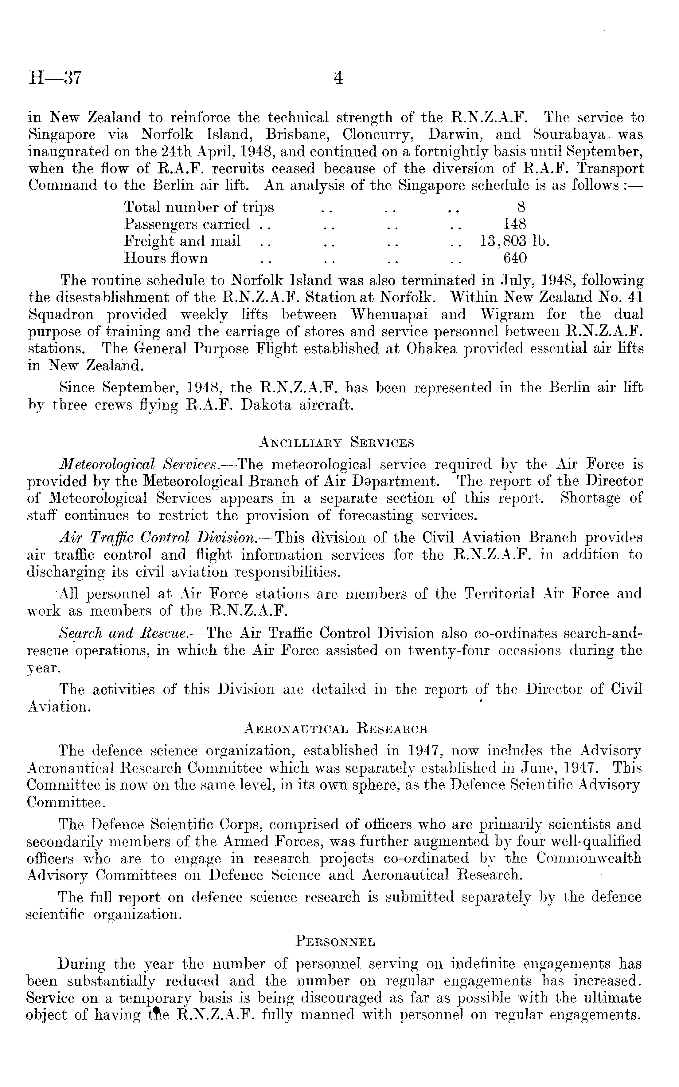 in New Zealand to reinforce the technical strength of the K.N.Z.A.F. The service to Singapore via Norfolk Island, Brisbane, Cloncurry, Darwin, and Sourabaya- was inaugurated on the 24th April, 1948, and continued on a fortnightly basis until September, when the flow of R.A.F. recruits ceased because of the diversion of R.A.F. Transport Command to the Berlin air lift. An analysis of the Singapore schedule is as follows : Total number of trips .. .. .. 8 Passengers carried .. .. .. .. 148 Freight and mail .-. .. .. ..13,803 Ib. Hours flown .. .. .. .. 640 The routine schedule to Norfolk Island was also terminated in July, 1948, following the disestablishment of the R.N.Z.A.F. Station at Norfolk. Within New Zealand No. 41 Squadron provided weekly lifts between Whenuapai and Wigram for the dual purpose of training and the carriage of stores and service personnel between R.N.Z.A.F. stations. The General Purpose Flight established at Ohakea provided essential air lifts in New Zealand. Since September, 1948, the R.N.Z.A.F. has been represented in the Berlin air lift by three crews flying R.A.F. Dakota aircraft. Ancilliary Services Meteorological Services. —The meteorological service required by the Air Force is provided by the Meteorological Branch of Air Department. The report of the Director of Meteorological Services appears in a separate section of this report. Shortage of staff continues to restrict the provision of forecasting services. Air Traffic Control Division. —This division of the Civil Aviation Branch provides air traffic control and flight information services for the R.N.Z.A.F. in addition to discharging its civil aviation responsibilities. All personnel at Air Force stations are members of the Territorial Air Force and work as members of the R.N.Z.A.F. Search and Rescue. —The Air Traffic Control Division also co-ordinates search-and-rescue operations, in which the Air Force assisted on twenty-four occasions during the year. The activities of this Division are detailed in the report of the Director of Civil Aviation. Aeronautical Research The defence science organization, established in 1947, now includes the Advisory Aeronautical Research Committee which was separately established in June, 1947. This Committee is now on the same level, in its own sphere, as the Defence Scientific Advisory Committee. The Defence Scientific Corps, comprised of officers who are primarily scientists and secondarily members of the Armed Forces, was further augmented by four well-qualified officers who are to engage in research projects co-ordinated by the Commonwealth Advisory Committees on Defence Science and Aeronautical Research. The full report on defence science research is submitted separately by the defence scientific organization. • . Personnel During the year the number of personnel serving on indefinite engagements has been substantially reduced and the number on regular engagements has increased. Service on a temporary basis is being discouraged as far as possible with the ultimate object of having R.N.Z.A.F. fully manned with personnel on regular engagements.
