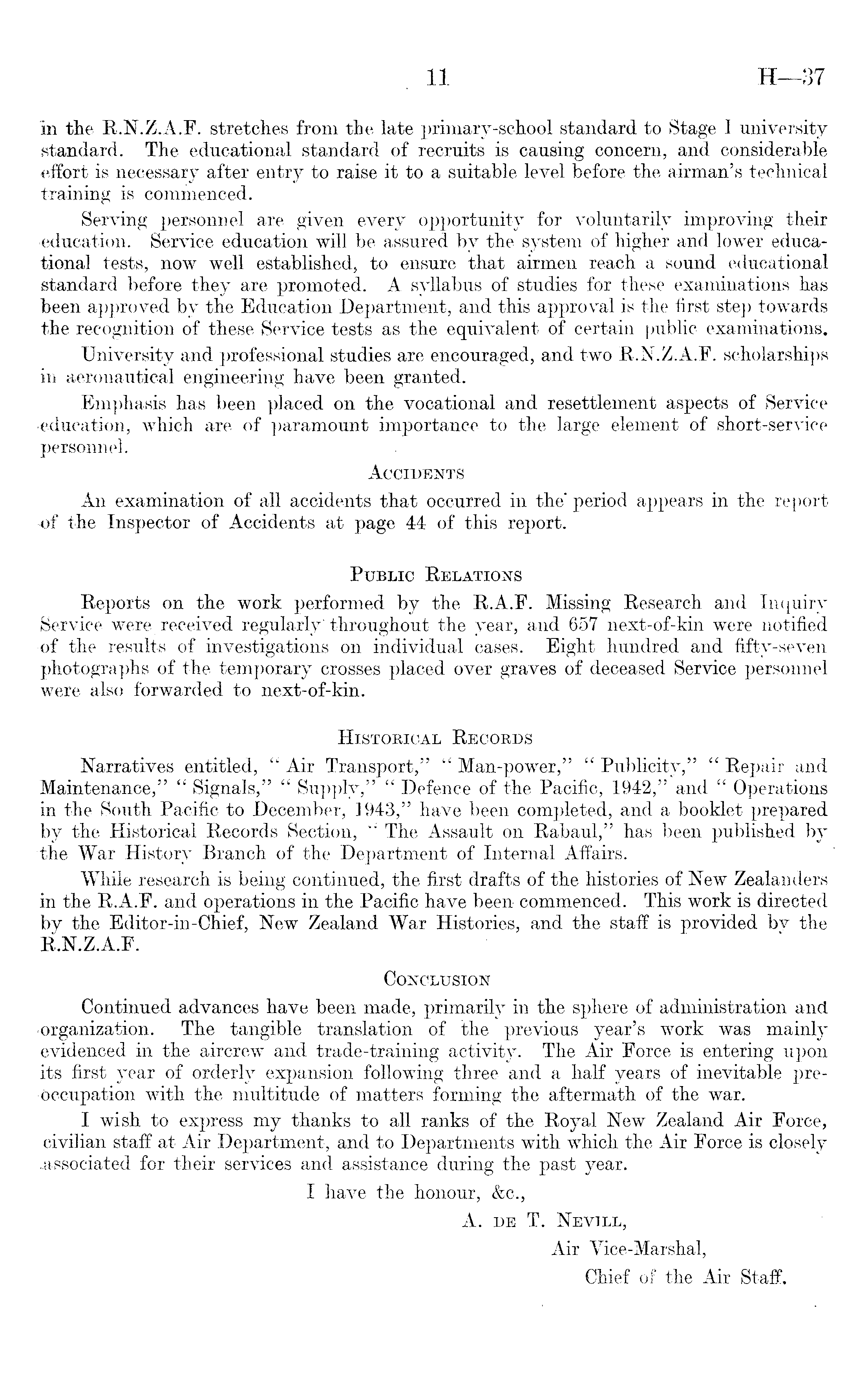 in the R.N.Z.A.F. stretches from the late primary-school standard to Stage I university standard. -The educational standard of recruits is causing concern, and considerable effort is necessary after entry to raise it to a suitable level before the airman's technical training is commenced. Serving personnel are given every opportunity for voluntarily improving their •education. Service education will be assured by the system of higher and lower educational tests, now well established, to ensure that airmen reach a sound educational standard before they are promoted. A syllabus of studies for these examinations has been approved by the Education Department, and this approval is the first step towards the recognition of these Service tests as the equivalent of certain public examinations. University and professional studies are encouraged, and two R.N.Z.A.F. scholarships in aeronautical engineering have been granted. Emphasis has been placed on the vocational and resettlement aspects of Service education, which are of paramount importance to the large element of short-service personnel. Accidents An examination of all accidents that occurred in the" period appears in the report •of the Inspector of Accidents at page 44 of this report. Public Relations Reports on the work performed by the R.A.E. Missing Research and Inquiry Service were received regularly throughout the year, and 657 next-of-kin were notified ■of the results of investigations on individual cases. Eight hundred and fifty-seven photographs of the temporary crosses placed over graves of deceased Service personnel were also forwarded to next-of-kin. Historical Records Narratives entitled, " Air Transport," " Man-power," " Publicity," " Repair and Maintenance," " Signals," " Supply," " Defence of the Pacific, 1942," and " Operations in the South Pacific to December, 1943," have been completed, and a booklet prepared by the Historical Records Section, " The Assault on Rabaul," has been published by the War History Branch of the Department of Internal Affairs. While research is being continued, the first drafts of the histories of New Zealanders in the R.A.E. and operations in the Pacific have been commenced. This work is directed by the Editor-in-Chief, New Zealand War Histories, and the staff is provided bv the R.N.Z.A.F. Conclusion Continued advances have been made, primarily in the sphere of administration and organization. The tangible translation of the previous year's work was mainly evidenced in the aircrew and trade-training activity. The Air Force is entering upon its first year of orderly expansion following three and a half years of inevitable preoccupation with the multitude of matters forming the aftermath of the war. I wish to express my thanks to all ranks of the Royal New Zealand Air Force, civilian staff at Air Department, and to Departments with which the Air Force is closely .associated for their services and assistance during the past year. I have the honour, &c, A. de T. Nevill, Air Vice-Marshal, Chief of the Air Staff.