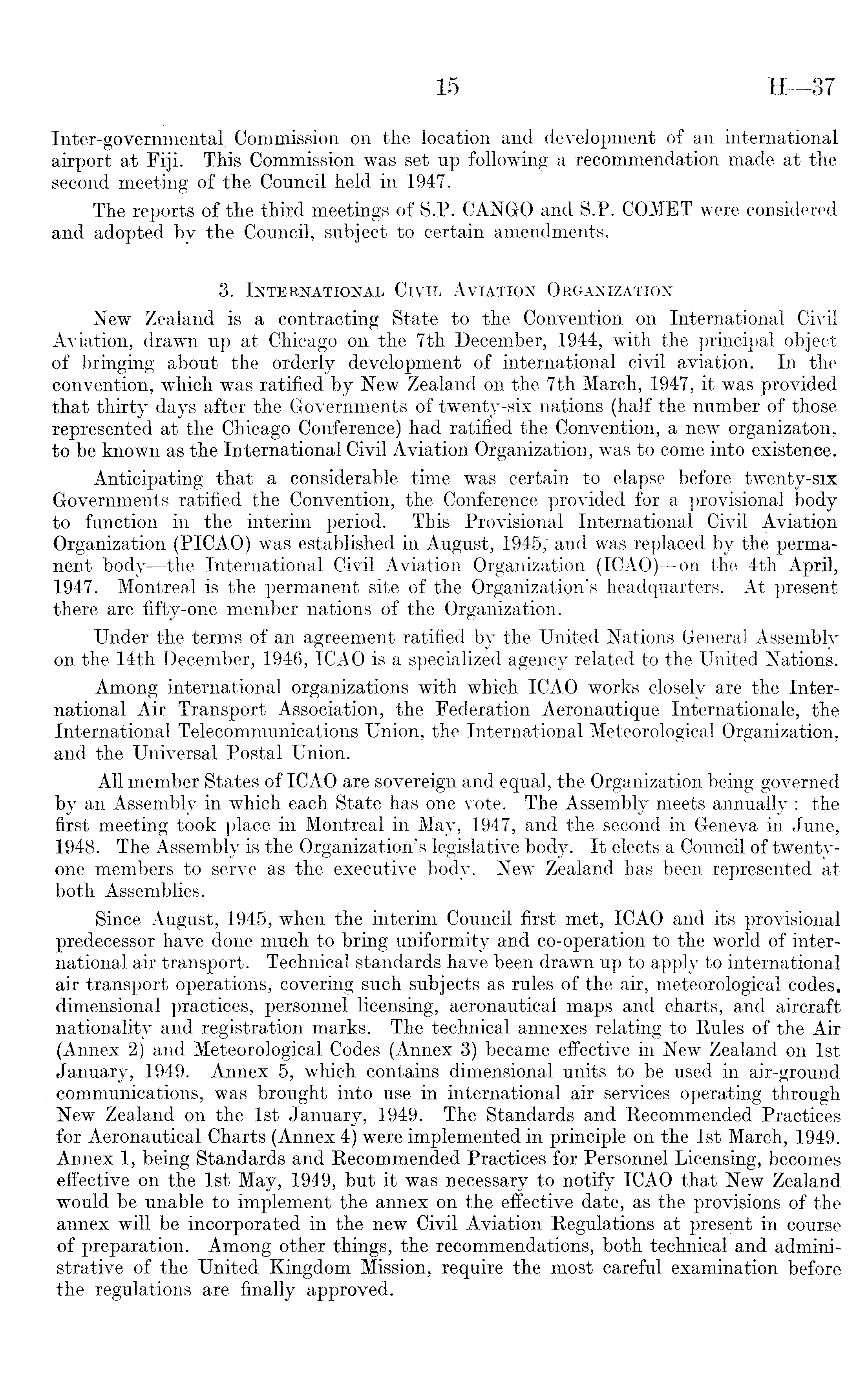 Inter-governmental Commission on the location and development of an international airport at Fiji. This Commission was set up following a recommendation made at the second meeting of the Council held in 1947. The reports of the third meetings of S.P. CANGO and S.P. COMET were considered and adopted by the Council, subject to certain amendments. 3. International Civil Aviation Organization New Zealand is a contracting State to the Convention on International Civil Aviation, drawn up at Chicago on' the 7th December, 1944, with the principal object of bringing about the orderly development of international civil aviation. In the convention, which was ratified by New Zealand on the 7th March, 1947, it was provided that thirty days after the Governments of twenty-six nations (half the number of those represented at the Chicago Conference) had ratified the Convention, a new organizaton, to be known as the International Civil Aviation Organization, was to come into existence. Anticipating that a considerable time was certain to elapse before twenty-six Governments ratified the Convention, the Conference provided for a provisional body to function in the interim period. This Provisional International Civil Aviation Organization (PICAO) was established in August, 1945, and was replaced by the permanent body—the International Civil Aviation Organization (ICAO) —on the 4th April, 1947. Montreal is the permanent site of the Organization's headquarters. At present there are fifty-one member nations of the Organization. Under the terms of an agreement ratified by the United Nations General Assembly on the 14th December, 1946, ICAO is a specialized agency related to the United Nations. Among international organizations with which ICAO works closely are the International Air Transport Association, the Federation Aeronautique Internationale, the International Telecommunications Union, the International Meteorological Organization, and the Universal Postal Union. All member States of ICAO are sovereign and equal, the Organization being governed by an Assembly in which each State has one vote. The Assembly meets annually ; the first meeting took place in Montreal in May, 1947, and the second in Geneva in June, 1948. The Assembly is the Organization's legislative body. It elects a Council of twentyone members to serve as the executive body. New Zealand has been represented at both Assemblies. Since August, 1945, when the interim Council first met, ICAO and its provisional predecessor have done much to bring uniformity and co-operation to the world of international air transport. Technical standards have been drawn up to apply to international air transport operations, covering such subjects as rules of the air, meteorological codes, dimensional practices, personnel licensing, aeronautical maps and charts, and aircraft nationality and registration marks. The technical annexes relating to Rules of the Air (Annex 2) and Meteorological Codes (Annex 3) became effective in New Zealand on Ist January, 1949. Annex 5, which contains dimensional units to be used in air-ground communications, was brought into use in international air services operating through" New Zealand on the Ist January, 1949. The Standards and Recommended Practices for Aeronautical Charts (Annex 4) were implemented in principle on the Ist March, 1949. Annex 1, being Standards and Recommended Practices for Personnel Licensing, becomes effective on the Ist May, 1949, but it was necessary to notify ICAO that New Zealand would be unable to implement the annex on the effective date, as the provisions of the annex will be incorporated in the new Civil Aviation Regulations at present in course of preparation. Among other things, the recommendations, both technical and administrative of the United Kingdom Mission, require the most careful examination before the regulations are finally approved.