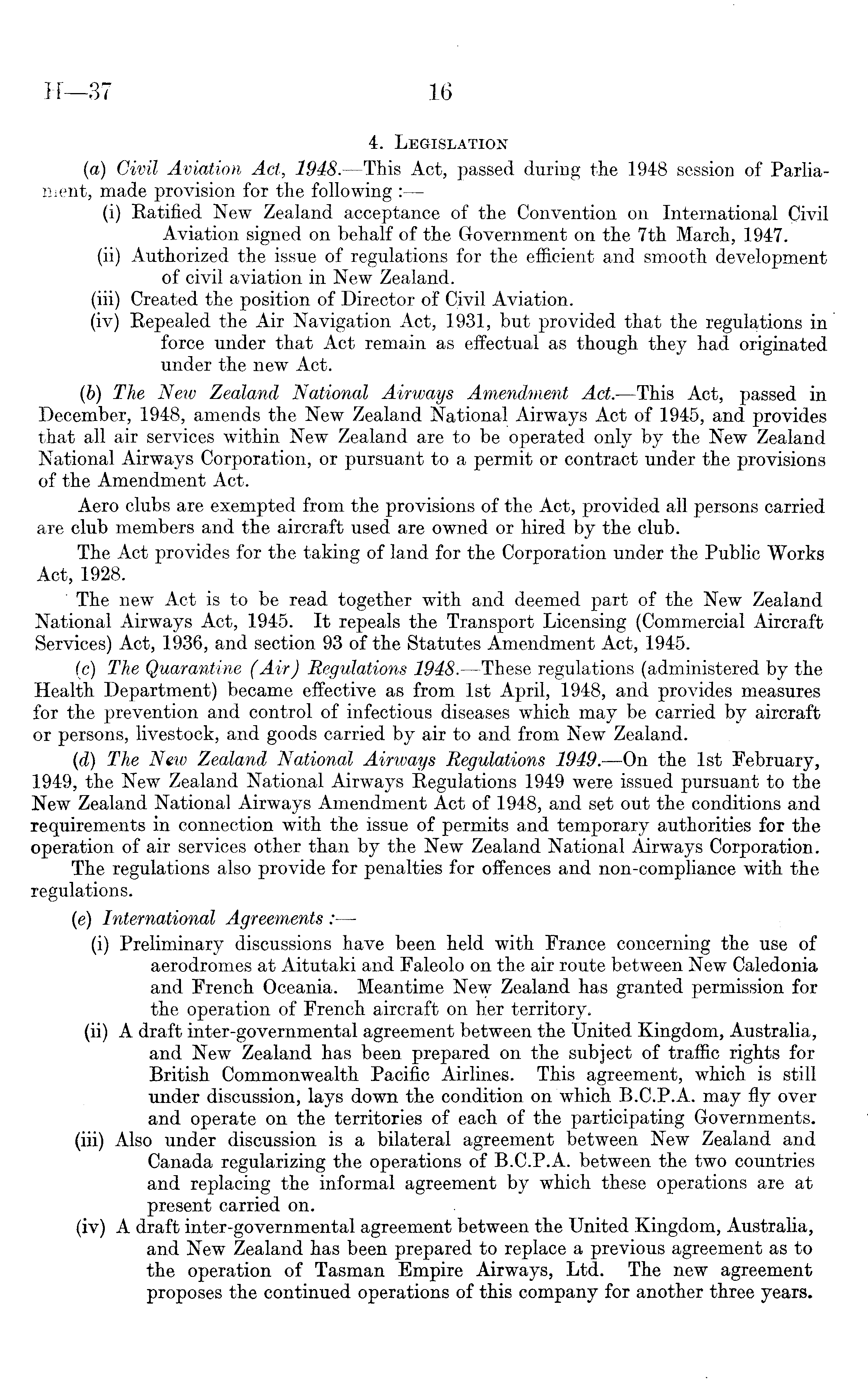 4. Legislation (a) Civil Aviation Act, 1948. —This Act, passed during the 1948 session of Parliament, made provision for the following : (i) Eatified New Zealand acceptance of the Convention on International Civil Aviation signed on behalf of the Government on the 7th March, 1947. (ii) Authorized the issue of regulations for the efficient and smooth development of civil aviation in New Zealand, (iii) Created the position of Director of Civil Aviation, (iv) Eepealed the Air Navigation Act, 1931, but provided that the regulations in force under that Act remain as effectual as though they had originated under the new Act. (b) The New Zealand National Airways Amendment Act. —This Act, passed in December, 1948, amends the New Zealand National Airways Act of 1945, and provides that all air services within New Zealand are to be operated only by the New Zealand National Airways Corporation, or pursuant to a permit or contract under the provisions of the Amendment Act. Aero clubs are exempted from the provisions of the Act, provided all persons carried are club members and the aircraft used are owned or hired by the club. The Act provides for the taking of land for the Corporation under the Public Works Act, 1928. The new Act is to be read together with and deemed part of the New Zealand National Airways Act, 1945. It repeals the Transport Licensing (Commercial Aircraft Services) Act, 1936, and section 93 of the Statutes Amendment Act, 1945. (c) The Quarantine (Air) Regulations 1948. —These regulations (administered by the Health Department) became effective as from Ist April, 1948, and provides measures for the prevention and control of infectious diseases which may be carried by aircraft or persons, livestock, and goods carried by air to and from New Zealand. (d) The New Zealand National Airways Regulations 1949. —0n the Ist February, 1949, the New Zealand National Airways Kegulations 1949 were issued pursuant to the New Zealand National Airways Amendment Act of 1948, and set out the conditions and requirements in connection with the issue of permits and temporary authorities for the operation of air services other than by the New Zealand National Airways Corporation. The regulations also provide for penalties for offences and non-compliance with the regulations. (e) International Agreements : (i) Preliminary discussions have been held with France concerning the use of aerodromes at Aitutaki and Faleolo on the air route between New Caledonia and French Oceania. Meantime New Zealand has granted permission for the operation of French aircraft on her territory, (ii) A draft inter-governmental agreement between the United Kingdom, Australia, and New Zealand has been prepared on the subject of traffic rights for British Commonwealth Pacific Airlines. This agreement, which is still under discussion, lays down the condition on which B.C.P.A. may fly over and operate on the territories of each of the participating Governments. (iii) Also under discussion is a bilateral agreement between New Zealand and Canada regularizing the operations of B.C.P.A. between the two countries and replacing the informal agreement by which these operations are at present carried on. (iv) A draft inter-governmental agreement between the United Kingdom, Australia, and New Zealand has been prepared to replace a previous agreement as to the operation of Tasman Empire Airways, Ltd. The new agreement proposes the continued operations of this company for another three years.