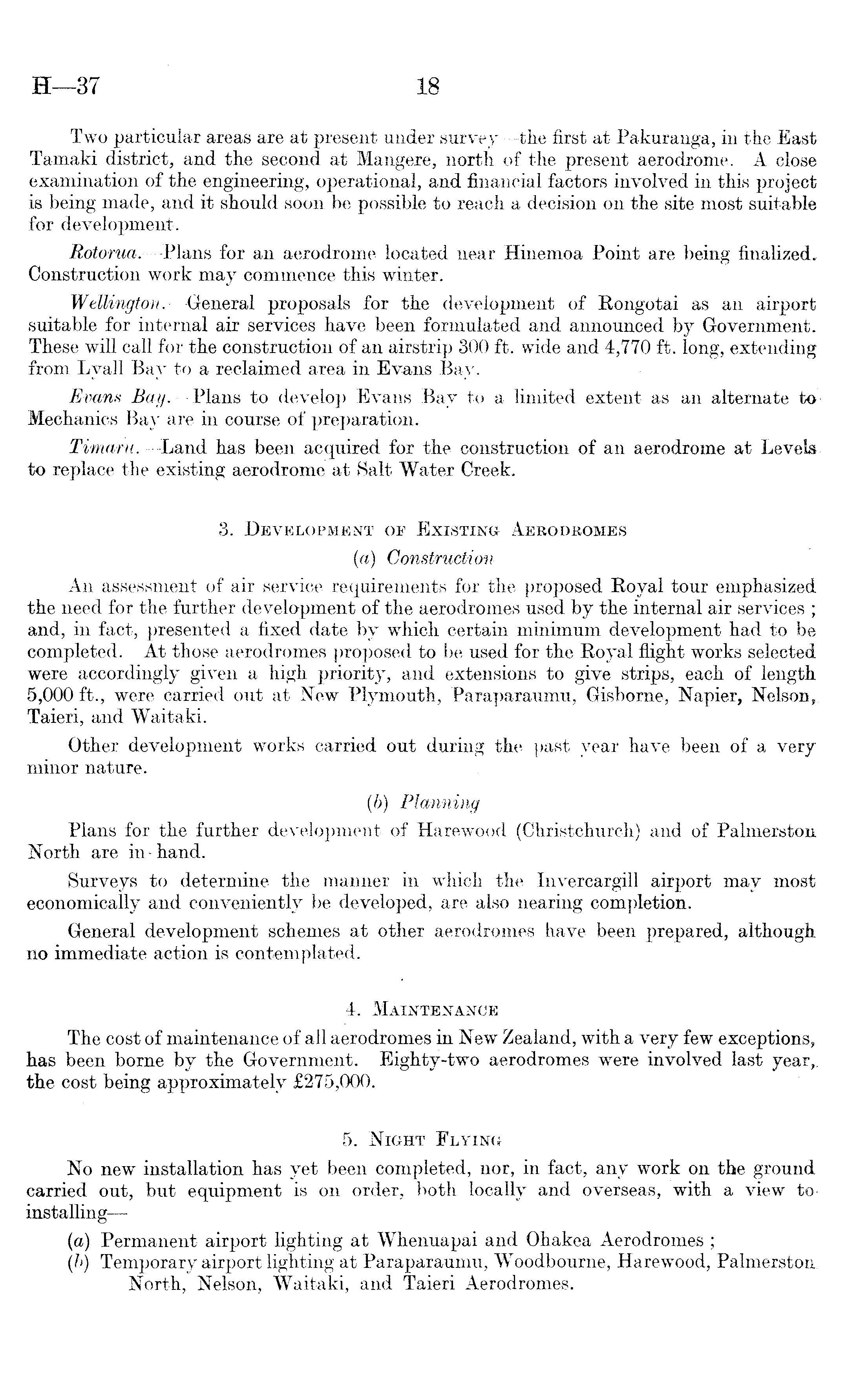 Two particular areas are at present under survey —the first at Pakuranga, in the East Tamaki district, and trie second at Mangere, north of the present aerodrome. A close examination of the engineering, operational, and financial factors involved in this project is being made, and it should soon be possible to reach a decision on the site most suitable for development. Rotorua. —Plans for an aerodrome located near Hinemoa Point are being finalized. Construction work may commence this winter. Wellington. -General proposals for the development of Rongotai as an airport suitable for internal air services have been formulated and announced by Government. These will call for the construction of an airstrip 300 ft. wide and 4,770 ft. long, extending from Lyall Bay to a reclaimed area in Evans Bay. Evans Bay. —Plans to develop Evans Bay to a limited extent as an alternate to Mechanics Bay are in course of preparation. Tiniaru. —Land has been acquired for the construction of an aerodrome at Levels to replace the existing aerodrome at Salt Water Creek. 3. Development op Existing Aerodromes (a) Construction An assessment of air service requirements for the proposed Royal tour emphasized the need for the further development of the aerodromes used by the internal air services ; and, in fact, presented a fixed date by which certain minimum development had to be completed. At those aerodromes proposed to be used for the Royal flight works selected were accordingly given a high priority, and extensions to give strips, each of length 5,000 ft., were carried out at New Plymouth, Paraparaumu, Gisborne, Napier, Nelson, Taieri, and Waitaki. Other development works carried out during the past year have been of a very minor nature. (b) Planning Plans for the further development of Harewood (Christchurch) and of Palmerston North are in-hand. Surveys to determine the manner in which the Invercargill airport may most economically and conveniently be developed, are also Hearing completion. General development schemes at other aerodromes have been prepared, although no immediate action is contemplated. 4. Maintenance The cost of maintenance of all aerodromes in New Zealand, with a very few exceptions, has been borne by the Government. Eighty-two aerodromes were involved last year,, the cost being approximately £275,000. 5. Night Flying No new installation has yet been completed, nor, in fact, any work on the ground carried out, but equipment is on order, both locally and overseas, with a view to installing — (a) Permanent airport lighting at Whenuapai and Ohakea Aerodromes ; (b) Temporary airport lighting at Paraparaumu, Woodbourne, Harewood, Palmerston. North, Nelson, Waitaki, and Taieri Aerodromes.