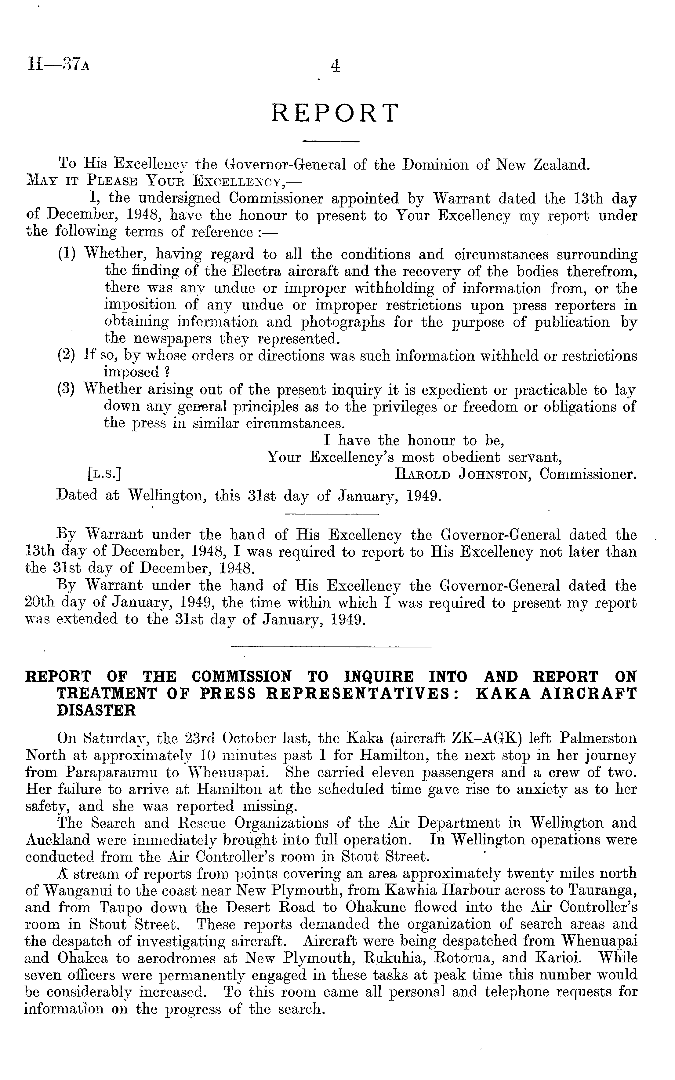REPORT To His Excellency the Governor-General of the Dominion of New Zealand. May it Please Your Excellency,— I, the undersigned Commissioner appointed by Warrant dated the 13th day of December, 1948, have the honour to present to Your Excellency my report under the following terms of reference : (1) Whether, having regard to all the conditions and circumstances surrounding the finding of the Electra aircraft and the recovery of the bodies therefrom, there was any undue or improper withholding of information from, or the imposition of any undue or improper restrictions upon press reporters in obtaining information and photographs for the purpose of publication by the newspapers they represented. (2) If so, by whose orders or directions was such information withheld or restrictions imposed ? (3) Whether arising out of the present inquiry it is expedient or practicable to lay down any general principles as to the privileges or freedom or obligations of the press in similar circumstances. I have the honour to be, Your Excellency's most obedient servant, [l.s.] Harold Johnston, Commissioner. Dated at Wellington, this 31st day of January, 1949. By Warrant under the hand of His Excellency the Governor-General dated the 13th day of December, 1948, I was required to report to His Excellency not later than the 31st day of December, 1948. By Warrant under the hand of His Excellency the Governor-General dated the 20th day.of January, 1949, the time within which I was required to present my report was extended to the 31st day of January, 1949.
