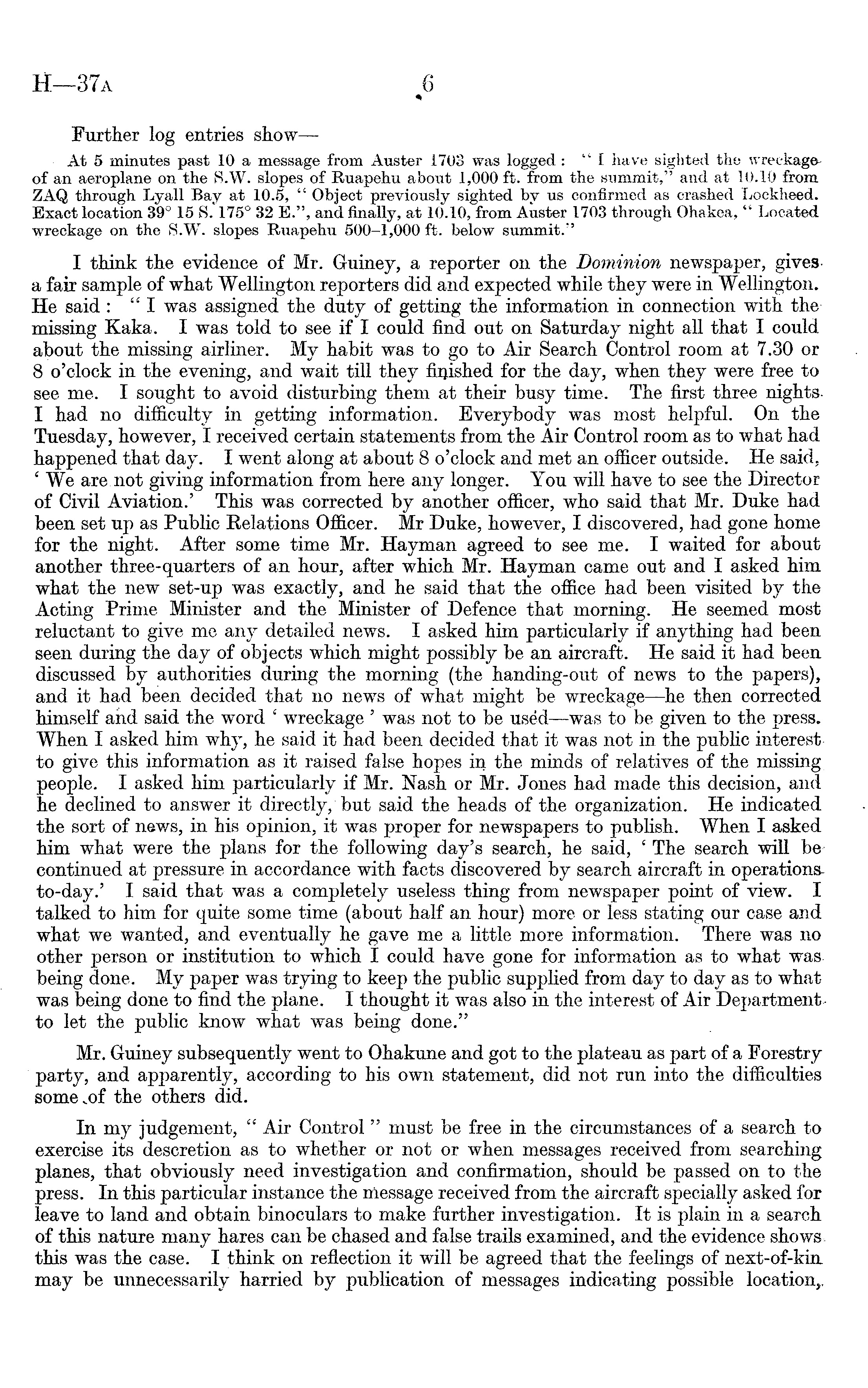Further log entries show — At 5 minutes past 10 a message from Auster 1703 was logged : " I have sighted the wreckageof an aeroplane on the S.W. slopes of Ruapehu about 1,000 ft. from the summit," and at 10.10 from ZAQ through Lyall Bay at 10.5, " Object previously sighted by us confirmed as crashed "Lockheed. Exact location 39° 15 S. 175° 32 E.", and finally, at 10.10, from Auster 1703 through Ohakea, " Located wreckage on the S.W. slopes Ruapehu 500-1,000 ft. below summit."' I think the evidence of Mr. Gruiney, a reporter on the Dominion newspaper, gives a fair sample of what Wellington reporters did and expected while they were in Wellington. He said : "I was assigned the duty of getting the information in connection with the missing Kaka. I was told to see if I could find out on Saturday night all that I could about the missing airliner. My habit was to go to Air Search Control room at 7.30 or 8 o'clock in the evening, and wait till they finished for the day, when they were free to see me. I sought to avoid disturbing them at their busy time. The first three nightsI had no difficulty in getting information. Everybody was most helpful. On the Tuesday, however, I received certain statements from the Air Control room as to what had happened that day. I went along at about 8 o'clock and met an officer outside. He said, £ We are not giving information from here any longer. You will have to see the Director of Civil Aviation.' This was corrected by another officer, who said that Mr. Duke had been set up as Public Relations Officer. Mr Duke, however, I discovered, had gone home for the night. After some time Mr. Hayman agreed to see me. I waited for about another three-quarters of an hour, after which Mr. Hayman came out and I asked him what the new set-up was exactly, and he said that the office had been visited by the Acting Prime Minister and the Minister of Defence that morning. He seemed most reluctant to give me any detailed news. I asked him particularly if anything had been seen during the day of objects which might possibly be an aircraft. He said it had been discussed by authorities during the morning (the handing-out of news to the papers), and it had been decided that no news of what might be wreckage—he then corrected himself and said the word ' wreckage ' was not to be used—was to be given to the press. When I asked him why, he said it had been decided that it was not in the public interest to give this information as it raised false hopes in the minds of relatives of the missing people. I asked him particularly if Mr. Nash or Mr. Jones had made this decision, and he declined to answer it directly, but said the heads of the organization. He indicated the sort of news, in his opinion, it was proper for newspapers to publish. When I asked him what were the plans for the following day's search, he said, ' The search will be continued at pressure in accordance with facts discovered by search aircraft in operations-to-day.' I said that was a completely useless thing from newspaper point of view. I talked to him for quite some time (about half an hour) more or less stating our case and what we wanted, and eventually he gave me a little more information. There was no other person or institution to which I could have gone for information as to what was being done. My paper was trying to keep the public supplied from day to day as to what was being done to find the plane. I thought it was also in the interest of Air Department to let the public know what was being done." Mr. Guiney subsequently went to Ohakune and got to the plateau as part of a Forestry party, and apparently, according to his own statement, did not run into the difficulties some .of the others did. In my judgement, " Air Control " must be free in the circumstances of a search to exercise its descretion as to whether or not or when messages received from searching planes, that obviously need investigation and confirmation, should be passed on to the press. In this particular instance the message received from the aircraft specially asked for leave to land and obtain binoculars to make further investigation. It is plain in a search of this nature many hares can be chased and false trails examined, and the evidence shows this was the case. I think on reflection it will be agreed that the feelings of next-of-kin may be unnecessarily harried by publication of messages indicating possible location,.