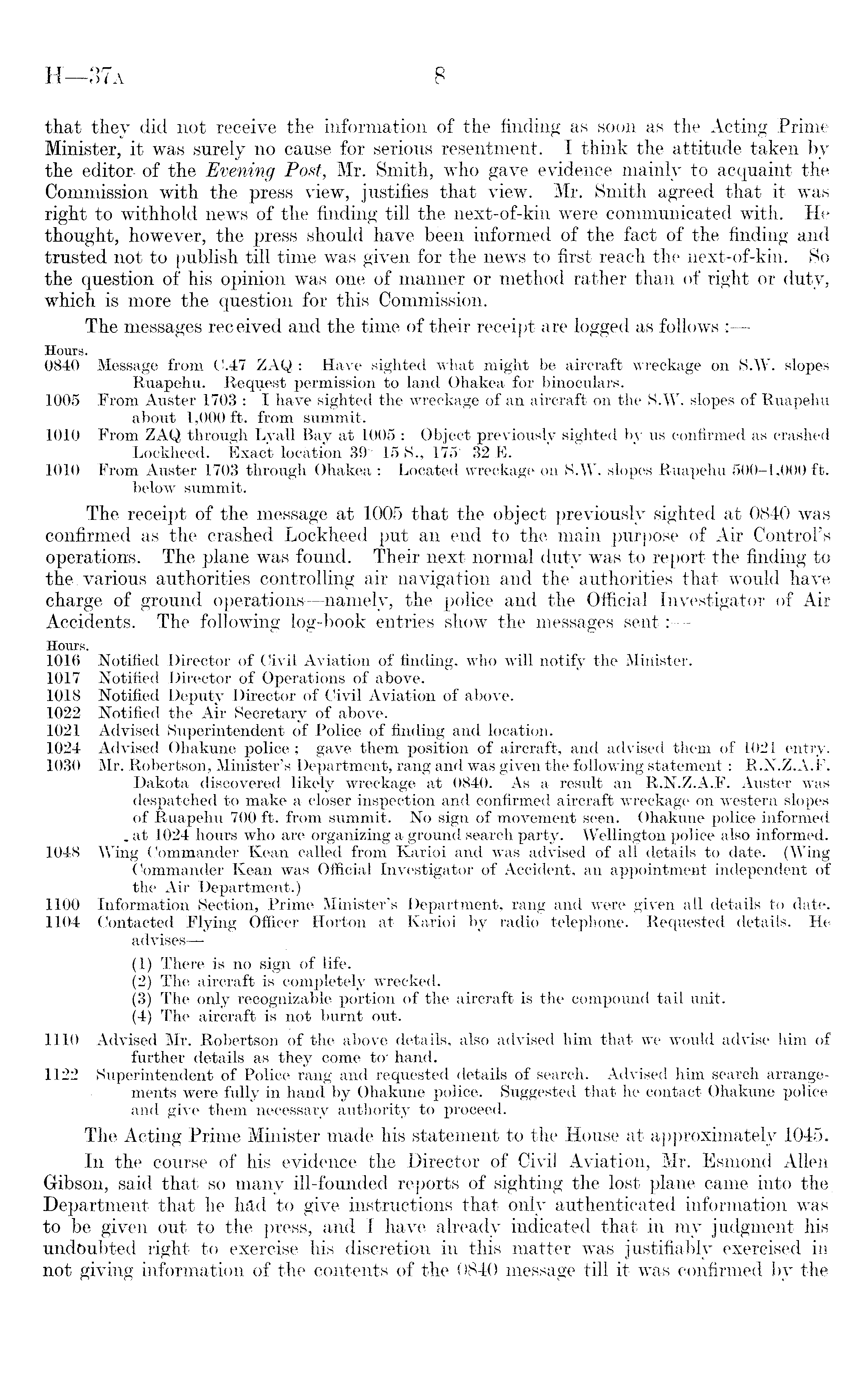 that they did not receive the information of the finding as soon as the Acting Prime Minister, it was surely no cause for serious resentment. I think the attitude taken by the editor- of the Evening Post, Mr. Smith, who gave evidence mainly to acquaint the Commission with the press view, justifies that view. Mr. Smith agreed that it was right to withhold news of the finding till the next-of-kin were communicated with. He thought, however, the press should have been informed of the fact of the finding and trusted not to publish till time was given for the news to first reach the next-of-kin. So the question of his opinion was one of manner or method rather than of right or duty, which is more the question for this Commission. The messages received and the time of their receipt are logged as follows Hours. 0840 Message from 0.47 ZAQ : Have sighted what might be aircraft wreckage on S.W. slopes Ruapehu. Request permission to land Ohakea for binoculars. 1005 From Auster 1703 : I have sighted the wreckage of an aircraft on the S.W. slopes of Ruapehu about 1,000 ft. from summit. 1010 From ZAQ through Lvall Bay at 1005 : Object previously sighted by us confirmed as crashed Lockheed. Exact location 39° 15 S., 175° 32 E. 1010 From Auster 1703 through Ohakea : Located wreckage on S.W. slopes Ruapehu 500-1,000 ft. below summit. The receipt of the message at 1005 that the object previously sighted at 0840 was confirmed as the crashed Lockheed put an end to the main purpose of Air Control's operations. The plane was found. Their next normal duty was to report the finding to the. various authorities controlling air navigation and the authorities that would have charge of ground operations —namely, the police and the Official Investigator of Air Accidents. The following log-book entries show the messages sent: — Hours. 1016 Notified Director of Civil Aviation of finding, who will notify the Minister. 1017 Notified Director of Operations of above. 1018 Notified Deputy Director of Civil Aviation of above. 1022 Notified the Air Secretary of above. 1021 Advised Superintendent of Police of finding and location. 1024 Advised Ohakune police; gave them position of aircraft, and advised them of 1021 entry. 1030 Mr. Robertson, Minister's Department, rang and was given the following statement: R.N.Z.A.F. Dakota discovered likely wreckage at 0840. As a result an R.N.Z.A.F. Auster was despatched to make a closer inspection and confirmed aircraft wreckage on western slopes of Ruapehu 700 ft. from summit. No sign of movement seen. Ohakune police informed .at 1024 hours who are organizing a ground search party. Wellington police also informed. 1048 Wing Commander Kean called from Karioi and was advised of all details to date. (Wing Commander Kean was Official Investigator of Accident, an appointment independent of the Air Department.) 1100 Information Section, Prime Minister's Department, rang and were given all details to date. 1104 Contacted Flying Officer Horton at Karioi by radio telephone. Requested details. He advises — (1) There is no sign of life. (2) The aircraft is completely wrecked. (3) The only recognizable portion of the aircraft is the compound tail unit. (4) The aircraft is not burnt out. 1110 Advised Mr. Robertson of the above details, also advised him that we would advise him of further details as they come to' hand. 1122 Superintendent of Police rang and requested details of search. Advised him search arrangements were fully in hand by Ohakune police. Suggested that he contact Ohakune police and give them necessary authority to proceed. The Acting Prime Minister made his statement to the House at approximately 1045. In the course of his evidence the Director of Civil Aviation, Mr. Esmond Allen Gibson, said that so many ill-founded reports of sighting the lost plane came into the. Department that he had to give instructions that only authenticated information was to be given out to the press, and I have already indicated that in my judgment his undoubted right to exercise his discretion in this matter was justifiably exercised in not giving information of the contents of the 0840 message till it was confirmed by the