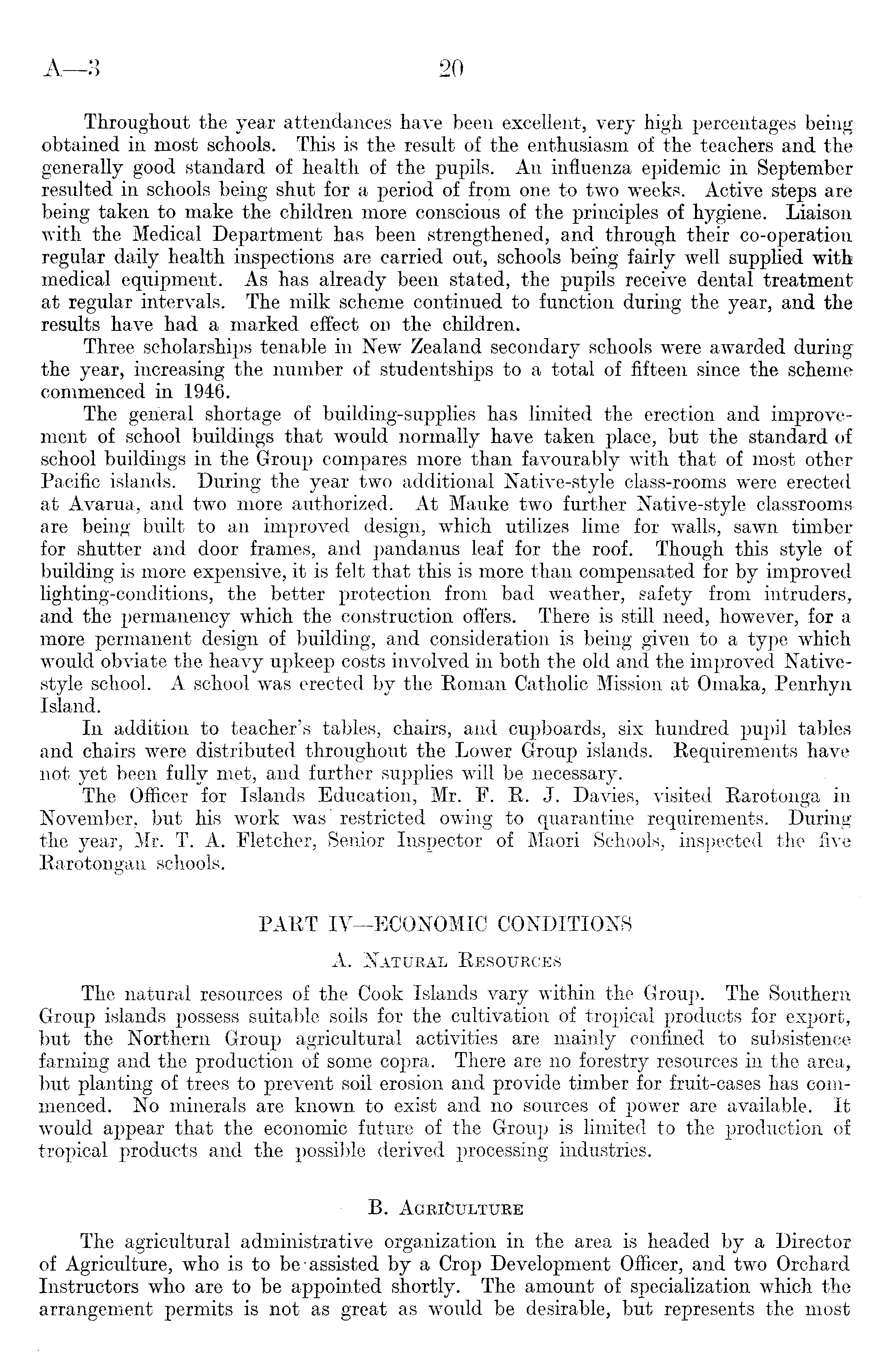 Throughout the year attendances have been excellent, very high percentages being obtained in most schools. This is the result of the enthusiasm of the teachers and the generally good standard of health of the pupils. An influenza epidemic in September resulted in schools being shut for a period of from one to two weeks. Active steps are being taken to make the children more conscious of the principles of hygiene. Liaison with the Medical Department has been strengthened, and through their co-operation regular daily health inspections are carried out, schools being fairly well supplied with medical equipment. As has already been stated, the pupils receive dental treatment at regular intervals. The milk scheme continued to function during the year, and the results have had a marked effect on the children. Three scholarships tenable in New Zealand secondary schools were awarded during the year, increasing the number of studentships to a total of fifteen since the scheme commenced in 1946. The general shortage of building-supplies has limited the erection and improvement of school buildings that would normally have taken place, but the standard of school buildings in the Group compares more than favourably with that of most other Pacific islands. During the year two additional Native-style class-rooms were erected at Avarua, and two more authorized. At Mauke two further Native-style classrooms are being built to an improved design, which utilizes lime for walls, sawn timber for shutter and door frames, and pandanus leaf for the roof. Though this style of building is more expensive, it is felt that this is more than compensated for by improved lighting-conditions, the better protection from bad weather, safety from intruders, and the permanency which the construction offers. There is still need, however, for a more permanent design of building, and consideration is being given to a type which would obviate the heavy upkeep costs involved in both the old and the improved Nativestyle school. A school was erected by the Roman Catholic Mission at Omaka, Penrhyn Island. In addition to teacher's tables, chairs, and cupboards, six hundred pupil tables and chairs were distributed throughout the Lower Group islands." Requirements have not yet been fully met, and further supplies will be necessary. The Officer for Islands Education, Mr. F. R. J. Davies, visited Rarotonga in November, but his work was restricted owing to quarantine requirements. During the year, Mr. T. A. Fletcher, Senior Inspector of Maori Schools, inspected the five Rarotongan schools. PART IV—ECONOMIC CONDITIONS A. Natural Resources The natural resources of the Cook Islands vary within the Group. The Southern Group islands possess suitable soils for the cultivation of tropical products for export, but the Northern Group agricultural activities are mainly confined to subsistence farming and the production of some copra. There are no forestry resources in the area, but planting of trees to prevent soil erosion and provide timber for fruit-cases has commenced. No minerals are known to exist and no sources of power are available. It would appear that the economic future of the Group is limited to the production of tropical products and the possible derived processing industries. B. Agriculture The agricultural administrative organization in the area is headed by a Director of Agriculture, who is to be assisted by a Crop Development Officer, and two Orchard Instructors who are to be appointed shortly. The amount of specialization which the arrangement permits is not as great as would be desirable, but represents the most