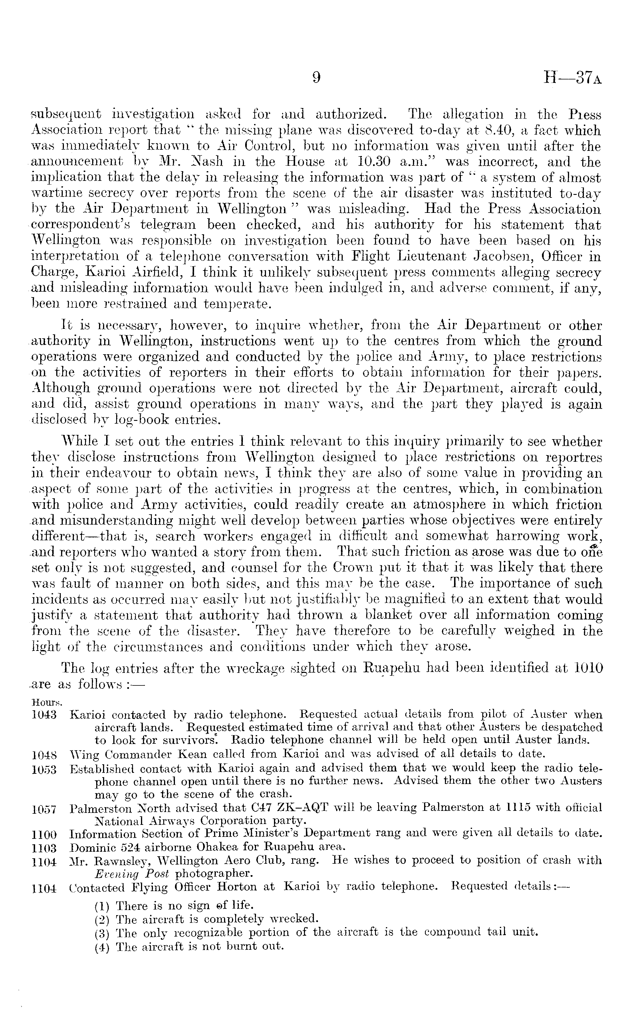 subsequent investigation asked for and authorized. The allegation in the Piess Association report that " the missing plane was discovered to-day at 8.40, a fact which was immediately known to "Air Control, but no information was given until after the announcement by Mr. Nash in the House at 10.30 a.m." was incorrect, and the implication that the delay in releasing the information was part of " a system of almost wartime secrecy over reports from the scene of the air disaster was instituted to-day by the Air Department in Wellington " was misleading. Had the Press Association correspondent's telegram been checked, and his authority for his statement that Wellington was responsible on investigation been found to have been based on his interpretation of a telephone conversation with Flight Lieutenant Jacobsen, Officer in Charge, Karioi Airfield, I think it unlikely subsequent press comments alleging secrecy and misleading information would have been indulged in, and adverse comment, if any, been more restrained and temperate. It is necessary, however, to inquire whether, from the Air Department or other authority in Wellington, instructions went up to the centres from which the ground operations were organized and conducted by the police and Army, to place restrictions on the activities of reporters in their efforts to obtain information for their papers. Although ground operations were not directed by the Air Department, aircraft could, .and did, assist ground operations in many ways, and the part they played is again disclosed by log-book entries. While I set out the entries I think relevant to this inquiry primarily to see whether they disclose instructions from Wellington designed to place restrictions on reportres in their endeavour to obtain news, I think they are also of some value in providing an .aspect of some part of the activities in progress at the centres, which, in combination with police and Army activities, could readily create an atmosphere in which friction and misunderstanding might well develop between parties whose objectives were entirely different —that is, search workers engaged in difficult and somewhat harrowing work, .and reporters who wanted a story from them. That such friction as arose was due to one set only is not suggested, and counsel for the Crown put it that it was likely that there was fault of manner on both sides, and this may be the case. The importance of such incidents as occurred may easily but not justifiably be magnified to an extent that would justify a statement that authority had thrown a blanket over all information coming from the scene of the disaster. They have therefore to be carefully weighed in the light of the circumstances and conditions under which they arose. The log entries after the wreckage sighted on Ruapehu had been identified at 1010 .are as follows : Hours. 1043 Karioi contacted by radio telephone. Requested actual details from pilot of Auster when aircraft lands. Requested estimated time of arrival and that other Austers be despatched to look for survivors". Radio telephone channel will be held open until Auster lands. 1048 Wing Commander Kean called from Karioi and was advised of all details to date. 1053 Established contact with Karioi again and advised them that we would keep the radio telephone channel open until there is no further news. Advised them the other two Austers may go to the scene of the crash. 1057 Palmerston North advised that C 47 ZK-AQT will be leaving Palmerston at 1115 with official National Airways Corporation party. 1100 Information Section'of Prime Minister's Department rang and were given all details to date. 1103 Dominic 524 airborne Ohakea for Ruapehu area. 1104 Mr. Rawnsley, Wellington Aero Club, rang. He wishes to proceed to position of crash with Evening Post photographer. 1104 Contacted Flying Officer Horton at Karioi by radio telephone. Requested details:— (1) There is no sign ©f life. (2) The aircraft is completely wrecked. (3) The only recognizable portion of the aircraft is the compound tail unit. (4) The aircraft is not burnt out.