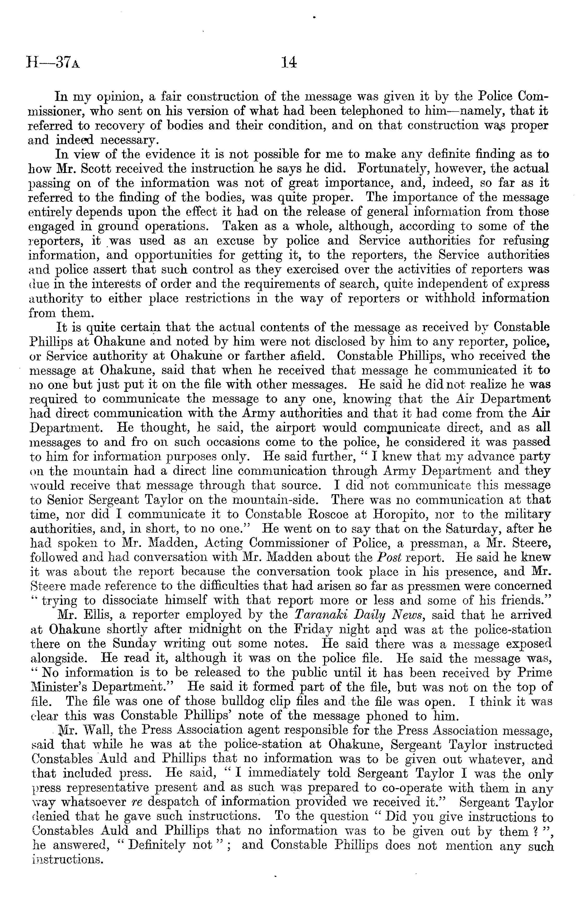 In my opinion, a fair construction of the message was given it by the Police Commissioner, who sent on his version of what had been telephoned to him—namely, that it referred to recovery of bodies and their condition, and on that construction was proper and indeed necessary. In view of the evidence it is not possible for me to make any definite finding as to how Mr. Scott received the instruction he says he did. Fortunately, however, the actual passing on of the information was not of great importance, and, indeed, so far as it referred to the finding of the bodies, was quite proper. The importance of the message entirely depends upon the effect it had on the release of general information from those engaged in ground operations. Taken as a whole, although, according to some of the reporters, it was used as an excuse by police and Service authorities for refusing information, and opportunities for getting it, to the reporters, the Service authorities and police assert that such control as they exercised over the activities of reporters was due in the interests of order and the requirements of search, quite independent of express authority to either place restrictions in the way of reporters or withhold information from them. It is quite certain that the actual contents of the message as received by Constable Phillips at Ohakune and noted by him were not disclosed by him to any reporter, police, or Service authority at Ohakune or farther afield. Constable Phillips, who received the message at Ohakune, said that when he received that message he communicated it to 110 one but just put it on the file with other messages. He said he did not realize he was required to communicate the message to any one, knowing that the Air Department had direct communication with the Army authorities and that it had come from the Air Department. He thought, he said, the airport would comjnunicate direct, and as all messages to and fro on such occasions come to the police, he considered it was passed to him for information purposes only. He said further, " I knew that my advance party on the mountain had a direct line communication through Army Department and they would receive that message through that source. I did not communicate this message to Senior Sergeant Taylor on the mountain-side. There was no communication at that time, nor did I communicate it to Constable Roscoe at Horopito, nor to the military authorities, and, in short, to no one." He went on to say that on the Saturday, after he had spoken to Mr. Madden, Acting Commissioner of Police, a pressman, a Mr. Steere, followed and had conversation with Mr. Madden about the Post report. He said he knew it was about the report because the conversation took place in his presence, and Mr. Steere made reference to the difficulties that had arisen so far as pressmen were concerned " trying to dissociate himself with that report more or less and some of his friends." Mr. Ellis, a reporter employed by the Tardnaki Daily News, said that he arrived at Ohakune shortly after midnight on the Friday night and was at the police-station there on the Sunday writing out some notes. He said there was a message exposed alongside. He read it, although it was on the police file. He said the message was, "No information is to be released to the public until it has been received by Prime Minister's Department." He said it formed part of the file, but was not on the top of file. The file was one of those bulldog clip files and the file was open. I think it was clear this was Constable Phillips' note of the message phoned to him. Mr. Wall, the Press Association agent responsible for the Press Association message, said that while he was at the police-station at Ohakune, Sergeant Taylor instructed Constables Auld and Phillips that no information was to be given out whatever, and that included press. He said, " I immediately told Sergeant Taylor I was the only press representative present and as such was prepared to co-operate with them in any way whatsoever re despatch of information provided we received it." Sergeant Taylor denied that he gave such instructions. To the question " Did you give instructions to Constables Auld and Phillips that no information was to be given out by them ? , he answered, " Definitely not" ; and Constable Phillips does not mention any such instructions.