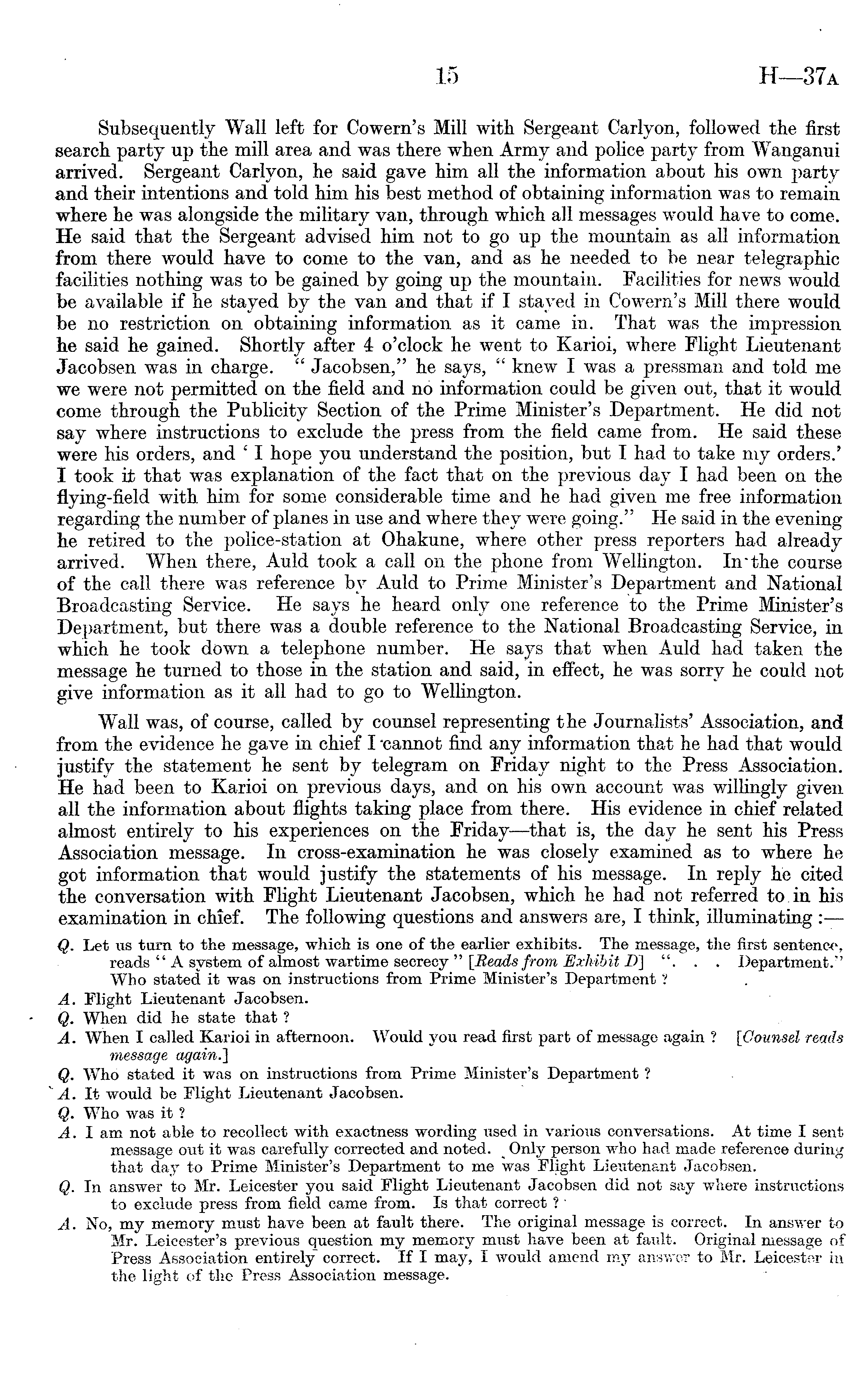 Subsequently Wall left for Cowern's Mill with Sergeant Carlyon, followed the first search party up the mill area and was there when Army and police party from Wanganui arrived. Sergeant Carlyon, he said gave him all the information about his own party and their intentions and told him his best method of obtaining information was to remain where he was alongside the military van, through which all messages would have to come. He said that the Sergeant advised him not to go up the mountain as all information from there would have to come to the van, and as he needed to be near telegraphic facilities nothing was to be gained by going up the mountain. Facilities for news would be available if he stayed by the van and that if I stayed in Cowern's Mill there would be no restriction on obtaining information as it came in. That was the impression he said he gained. Shortly after 4 o'clock he went to Karioi, where Flight Lieutenant Jacobsen was in charge. " Jacobsen," he says, " knew I was a pressman and told me we were not permitted on the field and no information could be given out, that it would come through the Publicity Section of the Prime Minister's Department. He did not say where instructions to exclude the press from the field came from. He said these were his orders, and ' I hope you understand the position, but I had to take my orders.' I took it that was explanation of the fact that on the previous day I had been on the flying-field with him for some considerable time and he had given me free information regarding the number of planes in use and where they were going." He said in the evening he retired to the police-station at Ohakune, where other press reporters had already arrived. When there, Auld took a call on the phone from Wellington. In "the course of the call there was reference by Auld to Prime Minister's Department and National Broadcasting Service. He says he heard only one reference to the Prime Minister's Department, but there was a double reference to the National Broadcasting Service, in which he took down a telephone number. He says that when Auld had taken the message he turned to those in the station and said, in effect, he was sorry he could not give information as it all had to go to Wellington. Wall was, of course, called by counsel representing the Journalists' Association, and from the evidence he gave in chief I "cannot find any information that he had that would justify the statement he sent by telegram on Friday night to the Press Association. He had been to Karioi on previous days, and on his own account was willingly given all the information about flights taking place from there. His evidence in chief related almost entirely to his experiences on the Friday—that is, the day he sent his Press Association message. In cross-examination he was closely examined as to where he got information that would justify the statements of his message. In reply he cited the conversation with Flight Lieutenant Jacobsen, which he had not referred to in his examination in chief. The following questions and answers are, I think, illuminating Q. Let us turn to the message, which is one of the earlier exhibits. The message, the first sentence, reads " A system of almost wartime secrecy " [Reads from Exhibit D] . . Department/' Who stated it was on instructions from Prime Minister's Department V A. Flight Lieutenant Jacobsen. Q. When did he state that ? A. When I called Karioi in afternoon. Would you read first part of message again ? [Counsel reads message again.] Q. Who stated it was on instructions from Prime Minister's Department ? A. It would be Flight Lieutenant Jacobsen. Q. Who was it ? A. lam not able to recollect with exactness wording used in various conversations. At time I sent message out it was carefully corrected and noted. Only person who had made reference during that day to Prime Minister's Department to me was Flight Lieutenant Jacobsen. Q. In answer to Mr. Leicester you said Flight Lieutenant Jacobsen did not say where instructions to exclude press from field came from. Is that correct ? ' A. No, my memory must have been at fault there. The original message is correct. In answer to Mr. Leicester's previous question my memory must have been at fault. Original message of Press Association entirely correct. If I may, I would amend my answer to Mr. Leicester in the light of the Press Association message.