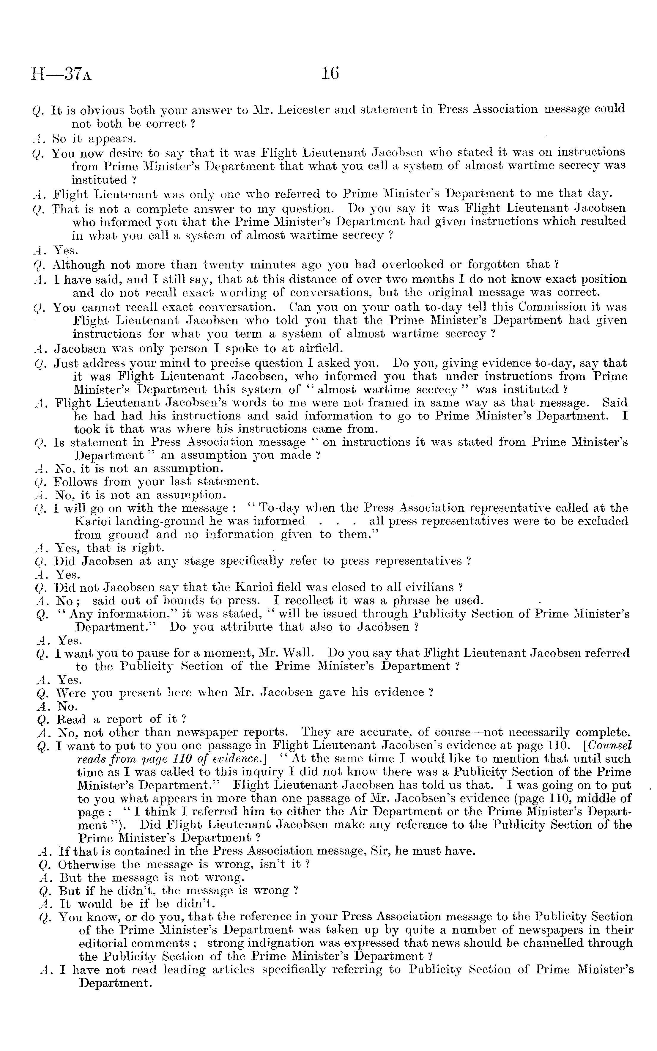 Q. It is obvious both your answer to Mr. Leicester and statement in Press Association message could not both be correct ? A. So it appears. Q. You now desire to say that it was Plight Lieutenant Jacobsen who stated it was on instructions from Prime Minister's Department that what you call a system of almost wartime secrecy was instituted ? .4. Flight Lieutenant was only one who referred to Prime Minister's Department to me that day. Q. That is not a complete answer to my question. Do you say it was Flight Lieutenant Jacobsen who informed you that the Prime Minister's Department had given instructions which resulted in what you call a system of almost wartime secrecy ? A. Yes. Q. Although not more than twenty minutes ago you had overlooked or forgotten that ? A. I have said, and I still say, that at this distance of over two months I do not know exact position and do not recall exact wording of conversations, but the original message was correct. Q. You cannot recall exact conversation. Can you on your oath to-day tell this Commission it was Flight Lieutenant Jacobsen who told you that the Prime Minister's Department had given instructions for what you term a system of almost wartime secrecy ? A. Jacobsen was only person I spoke to at airfield. Q. Just address your mind to precise question I asked you. Do you, giving evidence to-day, say that it was Flight Lieutenant Jacobsen, who informed you that under instructions from Prime Minister's Department this system of " almost wartime secrecy " was instituted ? A. Flight Lieutenant Jacobsen's words to me were not framed in same way as that message. Said he had had his instructions and said information to go to Prime Minister's Department. I took it that was where his instructions came from. Q. Is statement in Press Association message " on instructions it was stated from Prime Minister's Department " an assumption you made ? A. No, it is not an assumption. Q. Follows from your last statement. A. No, it is not an assumption. Q. I will go on with the message : " To-day when the Press Association representative called at the Karioi landing-ground he was informed . . . all press representatives were to be excluded from ground and no information given to them." A. Yes, that is right. Q. Did Jacobsen at any stage specifically refer to press representatives ? .4. Yes. Q. Did not Jacobsen say that the Karioi field was closed to all civilians ? A. No ; said out of bounds to press. I recollect it was a phrase he used. Q. " Any information," it was stated, " will be issued through Publicity Section of Prime Minister's Department." Do you attribute that also to Jacobsen ? A. Yes. Q. I want you to pause for a moment, Mr. Wall. Do you say that Flight Lieutenant Jacobsen referred to the Publicity Section of the Prime Minister's Department ? A. Yes. Q. Were you present here when Mr. Jacobsen gave his evidence ? A. No. Q. Read a report of it ? A. No, not other than newspaper reports. They are accurate, of course—not necessarily complete. Q. I want to put to you one passage in Flight Lieutenant Jacobsen's evidence at page 110. [Counsel . reads from page 110 of evidence.] "At the same time I would like to mention that until such time as I was called to this inquiry I did not know there was a Publicity Section of the Prime Minister's Department." Flight Lieutenant Jacobsen has told us that. I was going on to put to you what appears in more than one passage of Mr. Jacobsen's evidence (page 110, middle of page : "I think I referred him to either the Air Department or the Prime Minister's Department "). Did Flight Lieutenant Jacobsen make any reference to the Publicity Section of the Prime Minister's Department ? A. If that is contained in the Press Association message, Sir, he must have. Q. Otherwise the message is wrong, isn't it ? A. But the message is not wrong. Q. But if he didn't, the message is wrong ? A. It would be if he didn't. Q. You know, or do you, that the reference in your Press Association message to the Publicity Section of the Prime Minister's Department was taken up by quite a number of newspapers in their editorial comments ; strong indignation was expressed that news should be channelled through the Publicity Section of the Prime Minister's Department ? A. I have not read leading articles specifically referring to Publicity Section of Prime Minister's Department.