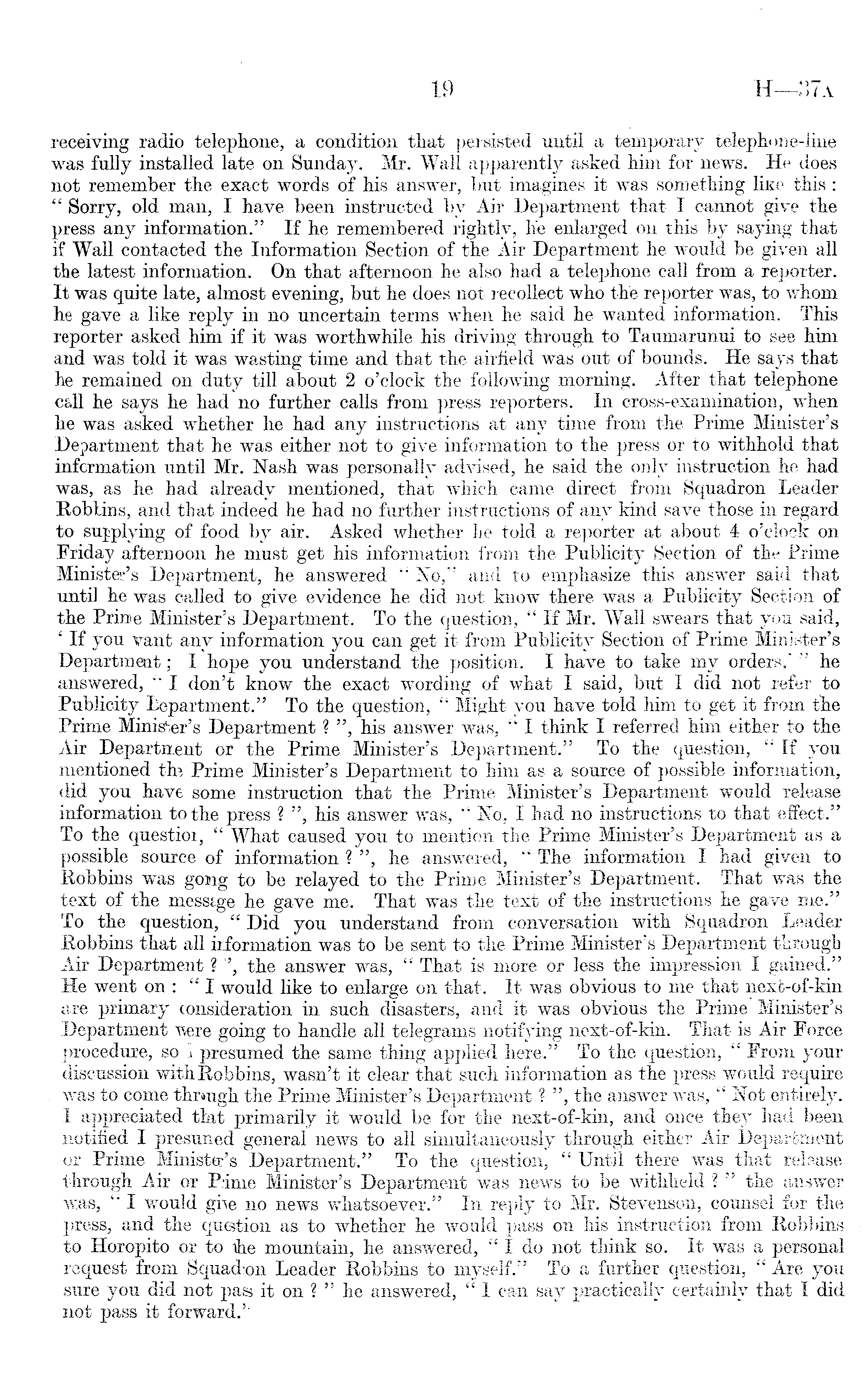 receiving radio telephone, a condition that persisted until a temporary telephone-line was fully installed late on Sunday. Mr. Wall apparently asked him for news. He does not remember the exact words of his answer, hut imagines it was something liiie this: " Sorry, old man, I have been instructed by Air Department that I cannot give the press any information." If he remembered rightly, he enlarged on this by saying that if Wall contacted the Information Section of the Air Department he would be given all the latest information. On that afternoon he also had a telephone call from a reporter. It was quite late, almost evening, but he does not recollect who the reporter was, to whom he gave a like reply in no uncertain terms when he said he wanted information. This reporter asked him if it was worthwhile his driving through to Taumarunui to see him and was told it was wasting time and that the airfield was out of bounds. He says that he remained on duty till about 2 o'clock the following morning. After that telephone call he says he had no further calls from press reporters. In cross-examination, when he was asked whether he had any instructions at any time from the Prime Minister's Department that he was either not to give information to the press or to withhold that information until Mr. Nash was personally advised, he said the only instruction he had was, as he had already mentioned, that which came direct from Squadron Leader Boblins, and that indeed he had no further instructions of any kind save those in regard to supplying of food by air. Asked whether he told a reporter at about 4 o'clock on Friday afternoon he must get his information from the Publicity Section of the Prime Minister's Department, he answered " No," and to emphasize this answer said that until he was called to give evidence he did not know there was a Publicity Section of the Prime Minister's Department. To the question, "If Mr. Wall swears that you said, ' If you vant any information you can get it from Publicity Section of Prime Minister's Department; I hope you understand the position. I have to take my orders,' "he answered, " I don't know the exact wording of what I said, but I did not refer to Publicity department." To the question, " Might you have told him to get it from the Prime Minister's Department ? ", his answer was, " I think I referred him either to the Air Department or the Prime Minister's Department." To the question, "If you mentioned th>, Prime Minister's Department to him as a source of possible information, did you have some instruction that the Prime Minister's Department would release information to the press ? ", his answer was, " No, I had no instructions to that effect." To the question, " What caused you to mention the Prime Minister's Department as a possible source of information ? ", he answered, " The information I had given to Bobbins was gong to be relayed to the Prime Minister's Department. That was the text of the message he gave me. That was the text of the instructions he gave me." To the question, " Did you understand from conversation with Squadron Leader Bobbins that all information was to be sent to the Prime Minister's Department through Air Department ? ", the answer was, " That is more or less the impression I gained." He went on : " I would like to enlarge on that. It was obvious to me that next-of-kin are primary consideration in such disasters, and it was obvious the Prime Minister's Department "were going to handle all telegrams notifying next-of-kin. That is Air Force procedure, so i presumed the same thing applied here." To the question, " From your discussion with Bobbins, wasn't it clear that such information as the press would require „ was to come through the Prime Minister's Department ? ", the answer was, " Not entirely. I appreciated tlat primarily it would be for the next-of-kin, and once they had been notified I presuned general news to all simultaneously through either Air Department or Prime Minister's Department." To the question, " Until there was that release through Air or P.'ime Minister's Department was news to be withheld ? " the answer was, " I would ghe no news whatsoever." In reply to Mr. Stevenson, counsel for the press, and the question as to whether he would pass on his instruction from Bobbins to Horopito or to ihe mountain, he answered, " I do not think so. It was a personal request from Squadron Leader Bobbins to myself." To a further question, " Are you sure you did not pas it on he answered, " I can say practically certainly that I did not pass it forward.''