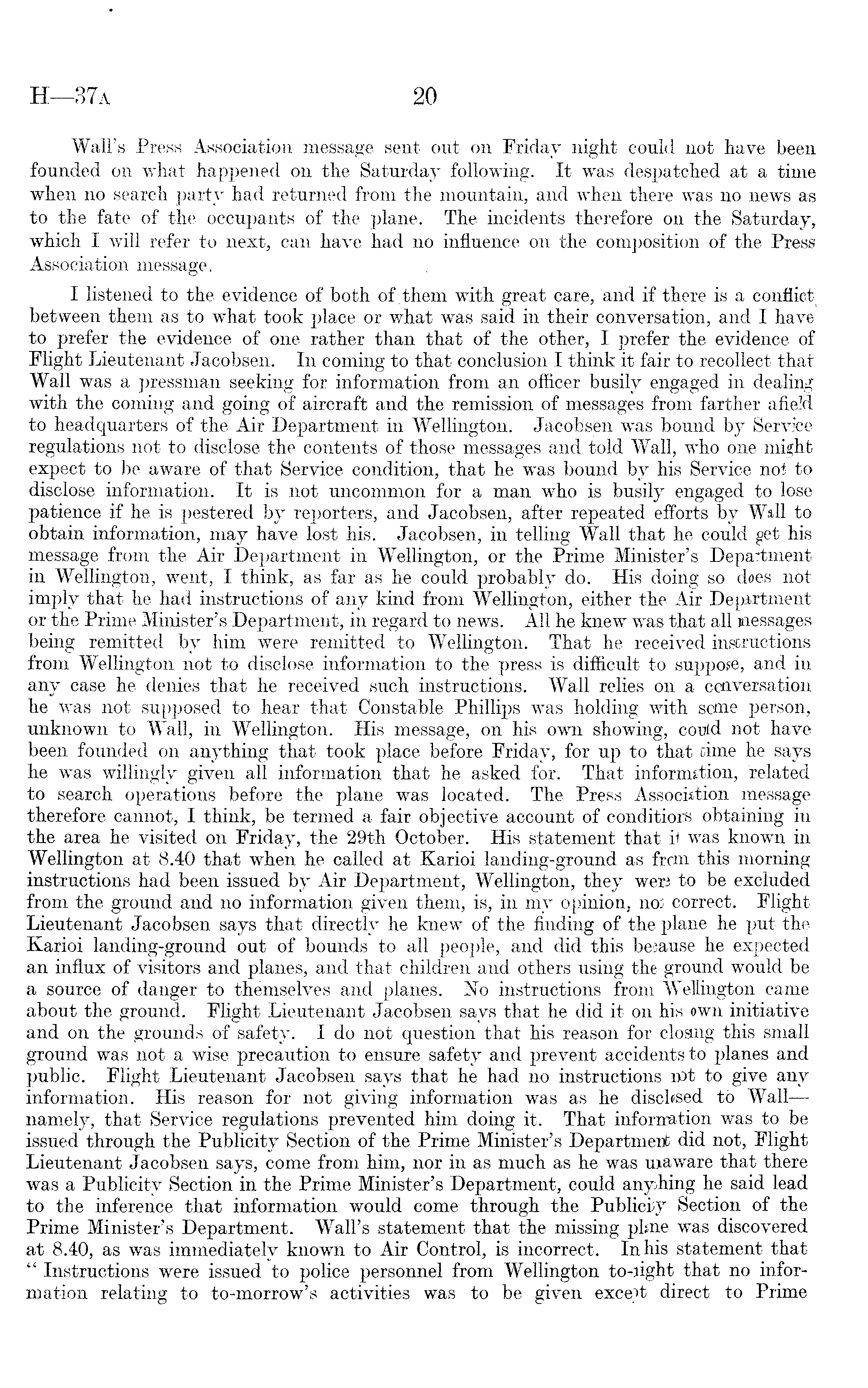 Wall's Press Association message sent out on Friday night could not have been founded on what happened on the Saturday following. It was despatched at a time when no search party had returned from the mountain, and when there was no news as to the fate of the occupants of the plane. The incidents therefore on the Saturday, which I will refer to next, can have had no influence on the composition of the Press Association message. I listened to the evidence of both of .them with great care, and if there is a conflict between them as to what took place or what was said in their conversation, and I have to prefer the evidence of one rather than that of the other, I prefer the evidence of Flight Lieutenant Jacobsen. In coming to that conclusion I think it fair to recollect that Wall was a pressman seeking for information from an officer busily engaged in dealing with the coming and going of aircraft and the remission of messages from farther afield to headquarters of the Air Department in Wellington. Jacobsen was bound by Service regulations not to disclose the contents of those messages and told Wall, who one might expect to be aware of that Service condition, that he was bound by his Service to disclose information. It is not uncommon for a man who is busily engaged to lose patience if he is pestered by reporters, and Jacobsen, after repeated efforts by Wall to obtain information, may have lost his. Jacobsen, in telling Wall that he could get his message from the Air Department in Wellington, or the Prime Minister's Department in Wellington, went, I think, as far as he could probably do. His doing so does not imply that he had instructions of any kind from Wellington, either the Air Department or the Prime Minister's Department, in regard to news. All he knew was that all messages being remitted by him were remitted to Wellington. That he received instructions from Wellington not to disclose information to the press is difficult to suppose, and in any case he denies that he received such instructions. Wall relies on a ccnversation he was not supposed to hear that Constable Phillips was holding with some person, unknown to Wall, in Wellington. His message, on his own showing, could not have been founded on anything that took place before Friday, for up to that time he says he was willingly given all information that he asked for. That information, related to search operations before the plane was located. The Press Association message therefore cannot, I think, be termed a fair objective account of conditiors obtaining in the area he visited on Friday, the 29th October. His statement that it was known in Wellington at 8.40 that when he called at Karioi landing-ground as from this morning instructions had been issued by Air Department, Wellington, they wers to be excluded from the ground and no information given them, is, in my opinion, no; correct. Flight Lieutenant Jacobsen says that directly he knew of the finding of the plane he put the Karioi landing-ground out of bounds to all people, and did this because he expected an influx of visitors and planes, and that children and others using the ground would be a source of danger to themselves and planes. No instructions from Wellington came about the ground. Flight Lieutenant Jacobsen says that he did it on his own initiative and on the grounds of safety. Ido not question that his reason for cloang this small ground was not a wise precaution to ensure safety and prevent accidents to planes and public. Flight Lieutenant Jacobsen says that he had no instructions rot to give any information. His reason for not giving information was as he disclosed to Wall—namely, that Service regulations prevented him doing it. That inforiration was to be issued through the Publicity Section of the Prime Minister's Department did not, Flight Lieutenant Jacobsen says, come from him, nor in as much as he was uxaware that there was a Publicity Section in the Prime Minister's Department, could anyhing he said lead to the inference that information would come through the Publicity Section of the Prime Minister's Department. Wall's statement that the missing plsne was discovered at 8.40, as was immediately known to Air Control, is incorrect. In his statement that " Instructions were issued to police personnel from Wellington to-light that no information relating to to-morrow's activities was to be given except direct to Prime