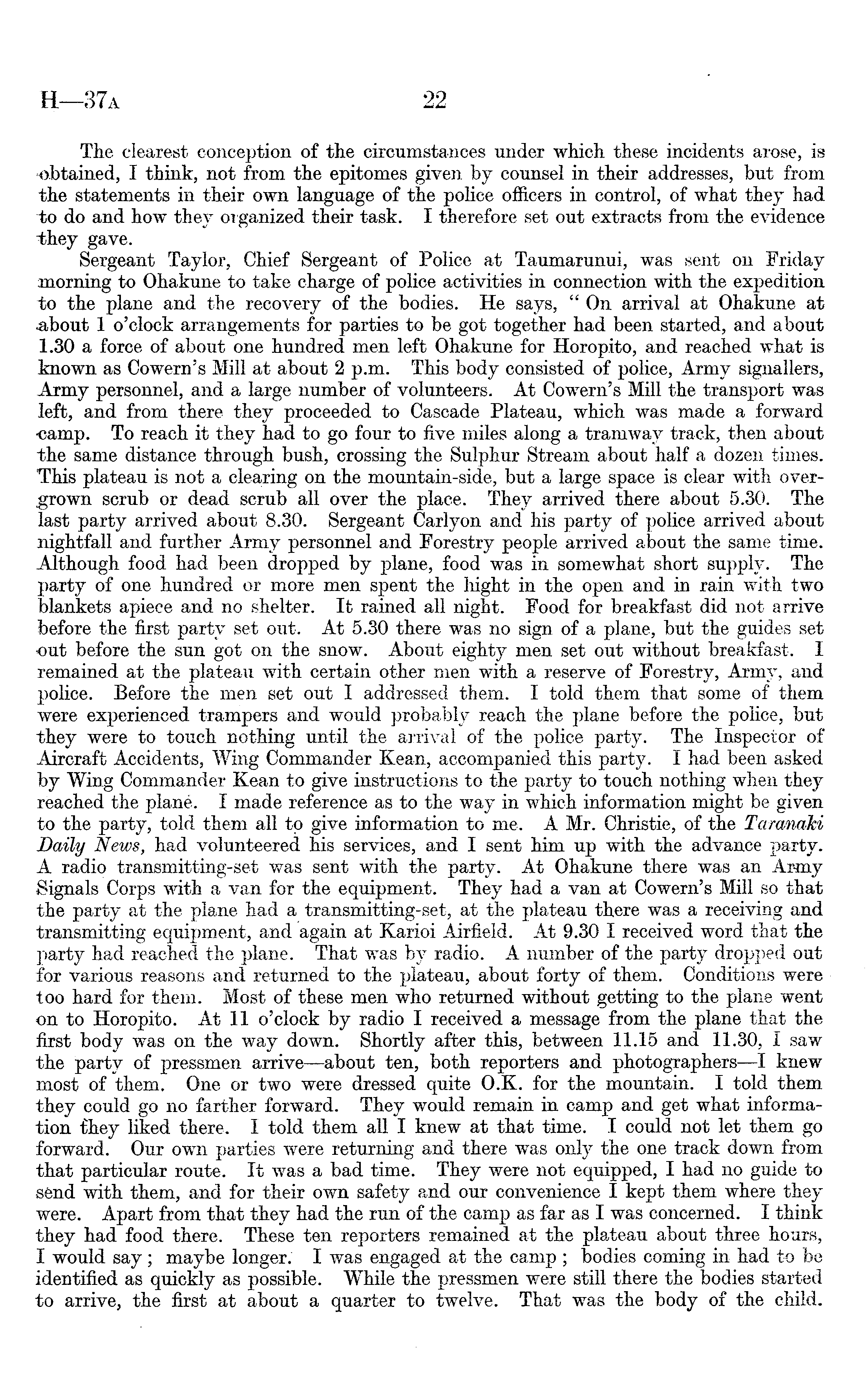 The clearest conception of the circumstances under which these incidents arose, is •obtained, I think, not from the epitomes given by counsel in their addresses, but from the statements in their own language of the police officers in control, of what they had to do and how they organized their task. I therefore set out extracts from the evidence they gave. Sergeant Taylor, Chief Sergeant of Police at Taumarunui, was sent on Friday morning to Ohakune to take charge of police activities in connection with the expedition to the plane and the recovery of the bodies. He says, "On arrival at Ohakune at About 1 o'clock arrangements for parties to be got together had been started, and about 1.30 a force of about one hundred men left Ohakune for Horopito, and reached what is known as Cowern's Mill at about 2 p.m. This body consisted of police, Army signallers, Army personnel, and a large number of volunteers. At Cowern's Mill the transport was left, and from there they proceeded to Cascade Plateau, which was made a forward ■camp. To reach it they had to go four to five miles along a tramway track, then about the same distance through bush, crossing the Sulphur Stream about half a dozen times. This plateau is not a clearing on the mountain-side, but a large space is clear with overgrown scrub or dead scrub all over the place. They arrived there about 5.30. The last party arrived about 8.30. Sergeant Carlyon and his party of police arrived about nightfall and further Army personnel and Forestry people arrived about the same time. Although food had been dropped by plane, food was in somewhat short supply. The party of one hundred or more men spent the hight in the open and in rain with two blankets apiece and no shelter. It rained all night. Food for breakfast did not arrive before the first party set out. At 5.30 there was no sign of a plane, but the guides set out before the sun got on the snow. About eighty men set out without breakfast. I remained at the plateau with certain other men with a reserve of Forestry, Army, and police. Before the men set out I addressed them. I told them that some of them were experienced trampers and would probably reach the plane before the police, but they were to touch nothing until the arrival of the police party. The Inspector of Aircraft Accidents, Wing Commander Kean, accompanied this party. I had been asked by Wing Commander Kean to give instructions to the party to touch nothing when they reached the plane. I made reference as to the way in which information might be given to the party, told them all to give information to me. A Mr. Christie, of the Tarandki Daily News, had volunteered his services, and I sent him up with the advance party. A radio transmitting-set was sent with the party. At Ohakune there was an Army Signals Corps with a van for the equipment. They had a van at Cowern's Mill so that the party at the plane had a transmitting-set, at the plateau there was a receiving and transmitting equipment, and again at Karioi Airfield. At 9.30 I received word that the party had reached the plane. That was by radio. A number of the party dropped out for various reasons and returned to the plateau, about forty of them. Conditions were too hard for them. Most of these men who returned without getting to the plane went on to Horopito. At 11 o'clock by radio I received a message from the plane that the first body was on the way down. Shortly after this, between 11.15 and 11.30, I saw the party of pressmen arrive—about ten, both reporters and photographers —I knew most of them. One or two were dressed quite O.K. for the mountain. I told them they could go no farther forward. They would remain in camp and get what information fhey liked there. I told them all I knew at that time. I could not let them go forward. Our own parties were returning and there was only the one track down from that particular route. It was a bad time. They were not equipped, I had no guide to send with them, and for their own safety and our convenience I kept them where they were. Apart from that they had the run of the camp as far as I was concerned. I think they had food there. These ten reporters remained at the plateau about three hours, I would say; maybe longer. I was engaged at the camp ; bodies coming in had to be identified as quickly as possible. While the pressmen were still there the bodies started to arrive, the first at about a quarter to twelve. That was the body of the child.