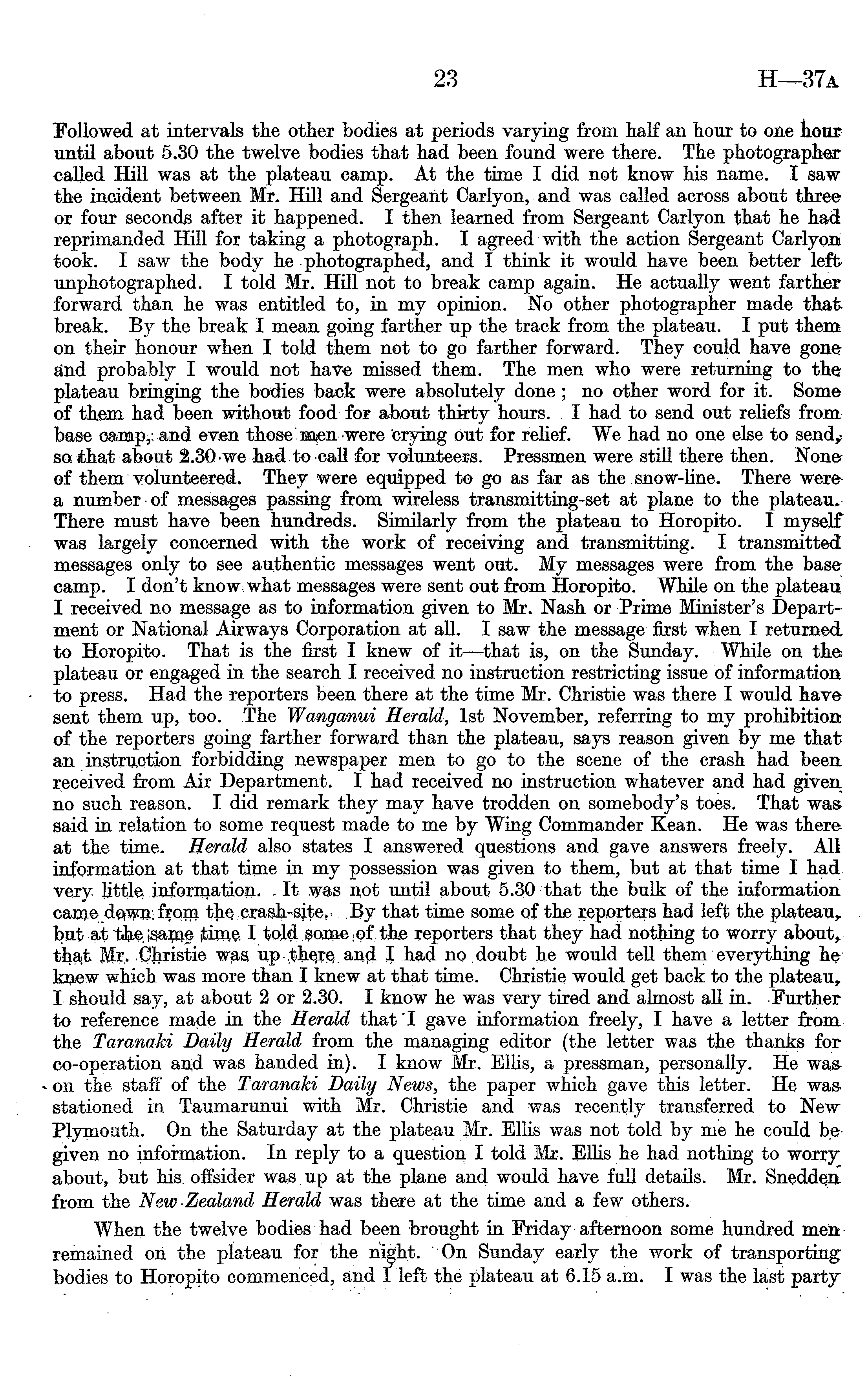 Followed at intervals the other bodies at periods varying from half an hour to one hour until about 5.30 the twelve bodies that had been found were there. The photographer called Hill was at the plateau camp. At the time I did not know his name. I saw the incident between Mr. Hill and Sergeant Carlyon, and was called across about three or four seconds after it happened. I then learned from Sergeant Carlyon that he had reprimanded Hill for taking a photograph. I agreed with the action Sergeant Carlyon took. I saw the body he photographed, and I think it would have been better left unphotographed. I told Mr. Hill not to break camp again. He actually went farther forward than he was entitled to, in my opinion. No other photographer made that break. By the break I mean going farther up the track from the plateau. I put them on their honour when I told them not to go farther forward. They could have gone and probably I would not have missed them. The men who were returning to the plateau bringing the bodies back were absolutely done ; no other word for it. Some of them had been without food for about thirty hours. I had to send out reliefs from base camp, and even those men were crying out for relief. We had no one else to send, so that about 2.30 we had to call for volunteers. Pressmen were still there then. None of them volunteered. They were equipped to go as far as the snow-line. There were a number of messages passing from wireless transmitting-set at plane to the plateau. There must have been hundreds. Similarly from the plateau to Horopito. I myself was largely concerned with the work of receiving and transmitting. I transmitted messages only to see authentic messages went out. My messages were from the base camp. I don't know what messages were sent out from Horopito. While on the plateau I received no message as to information given to Mr. Nash or Prime Minister's Department or National Airways Corporation at all. I saw the message first when I returned to Horopito. That is the first I knew of it—that is, on the Sunday. While on the plateau or engaged in the search I received no instruction restricting issue of information to press. Had the reporters been there at the time Mr. Christie was there I would have sent them up, too. The Wanganui Herald, Ist November, referring to my prohibition of the reporters going farther forward than the plateau, says reason given by me that an instruction forbidding newspaper men to go to the scene of the crash had been received from Air Department. I had received no instruction whatever and had given no such reason. I did remark they may have trodden on somebody's toes. That was said in relation to some request made to me by Wing Commander Kean. He was there at the time. Herald also states I answered questions and gave answers freely. All information at that time in my possession was given to them, but at that time I had very little information. It was not until about 5.30 that the bulk of the information came down from the crash-site. By that time some of the reporters had left the plateau, but at the same time I told some of the reporters that they had nothing to worry about, that Mr. Christie was up there and I had no doubt he would tell them everything he knew which was more than I knew at that time. Christie would get back to the plateau, I should say, at about 2or 2.30. I know he was very tired and almost all in. Further to reference made in the Herald that 'I gave information freely, I have a letter from the Taranaki Daily Herald from the managing editor (the letter was the thanks for co-operation and was handed in). I know Mr. Ellis, a pressman, personally. He was on the staff of the Taranaki Daily News, the paper which gave this letter. He was stationed in Taumarunui with Mr. Christie and was recently transferred to New Plymouth. On the Saturday at the plateau Mr. Ellis was not told by me he could be given no information. In reply to a question I told Mr. Ellis he had nothing to worry about, but his offsider was up at the plane and would have full details. Mr. Snedden from the New Zealand Herald was there at the time and a few others. W T hen the twelve bodies had been brought in Friday afternoon some hundred men remained on the plateau for the night. On Sunday early the work of transporting bodies to Horopito commenced, and I left the plateau at 6.15 a.m. I was the last party