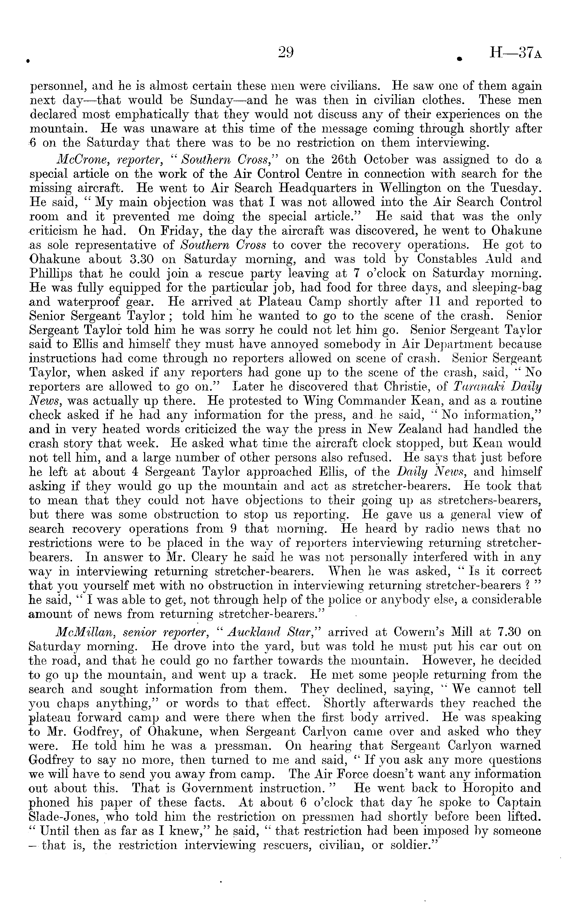 personnel, and he is almost certain these men were civilians. He saw one of them again next day —that would be Sunday—and he was then in civilian clothes. These men declared most emphatically that they would not discuss any of their experiences on the mountain. He was unaware at this time of the message coming through shortly after 6 on the Saturday that there was to be no restriction on them interviewing. McCrone, reporter, " Southern Cross," on the 26th October was assigned to do a special article on the work of the Air Control Centre in connection with search for the missing aircraft. He went to Air Search Headquarters in Wellington on the Tuesday. He said, " My main objection was that I was not allowed into the Air Search Control room and it prevented me doing the special article." He said that was the only •criticism he had. On Friday, the day the aircraft was discovered, he went to Ohakune as sole representative of Southern Cross to cover the recovery operations. He got to Ohakune about 3.30 on Saturday morning, and was told by Constables Auld and Phil lips that he could join a rescue party leaving at 7 o'clock on Saturday morning. He was fully equipped for the particular job, had food for three days, and sleeping-bag and waterproof gear. He arrived at Plateau Camp shortly after 11 and reported to Senior Sergeant Taylor; told him he wanted to go to the scene of the crash. Senior Sergeant Taylor told him he was sorry he could not let him go. Senior Sergeant Taylor said to Ellis and himself they must have annoyed somebody in Air Department because instructions had come through no reporters allowed on scene of crash. Senior Sergeant Taylor, when asked if any reporters had gone up to the scene of the crash, said, " No reporters are allowed to go on." Later he discovered that Christie, of Taranaki Daily News, was actually up there. He protested to Wing Commander Kean, and as a routine check asked if he had any information for the press, and. he said, " No information," and in very heated words criticized the way the press in New Zealand had handled the crash story that week. He asked what time the aircraft clock stopped, but Kean would not tell him, and a large number of other persons also refused. He says that just before he left at about 4 Sergeant Taylor approached Ellis, of the Daily News, and himself asking if they would go up the mountain and act as stretcher-bearers. He took that to mean that they could not have objections to their going up as stretchers-bearers, but there was some obstruction to stop us reporting. He gave us a general view of search recovery operations from 9 that morning. He heard by radio news that no restrictions were to be placed in the way of reporters interviewing returning stretcherbearers. In answer to Mr. Cleary he said he was not personally interfered with in any way in interviewing returning stretcher-bearers. When he was asked, "Is it correct that you yourself met with no obstruction in interviewing returning stretcher-bearers ? " he said, " I was able to get, not through help of the police or anybody else, a considerable amount of news from returning stretcher-bearers." McMillan, senior reporter, " Auckland Star," arrived at Cowern's Mill at 7.30 on Saturday morning. He drove into the yard, but was told he must put his car out on the road, and that he could go no farther towards the mountain. However, he decided to go up the mountain, and went up a track. He met some people returning from the search and sought information from them. They declined, saying, "We cannot tell you chaps anything," or words to that effect. Shortly afterwards they reached the plateau forward camp and were there when the first body arrived. He was speaking to Mr. Godfrey, of Ohakune, when Sergeant Carlyon came over and asked who they were. He told him he was a pressman. On hearing that Sergeant Carlyon warned Godfrey to say no more, then turned to me and said, " If you ask any more questions we will have to send you away from camp. The Air Force doesn't want any information out about this. That is Government instruction. " He went back to Horopito and phoned his paper of these facts. At about 6 o'clock that day "he spoke to Captain Slade-Jones, who told him the restriction on pressmen had shortly before been lifted. " Until then as far as I knew," he said, " that restriction had been imposed by someone - that is, the restriction interviewing rescuers, civilian, or soldier."