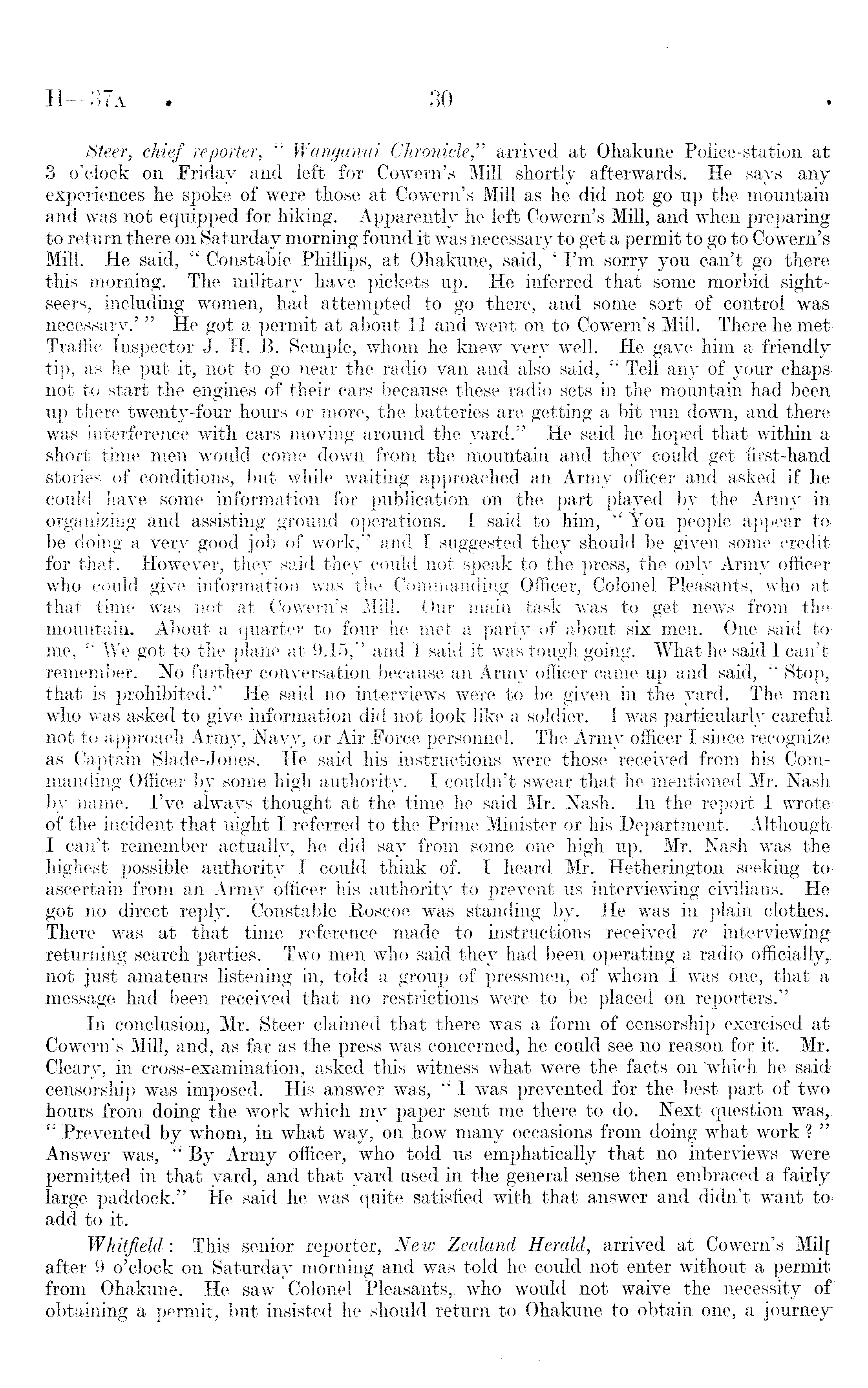 Steer, chief reporter, " Wanganui Chronicle," arrived at Ohakune .Police-station at 3 o'clock on Friday and left for Cowern's Mill shortly afterwards. He says any experiences lie spoke of were those at Cowern's Mill as lie did not go up the mountain and was not equipped for hiking. Apparently he left Cowern's Mill, and when preparing, to return there on Saturday morning found it was necessary to get a permit to go to Cowern'sMill. He said, " Constable Phillips, at Ohakune, said, ' I'm sorry you can't go there this morning. The military have pickets up. He inferred that some morbid sightseers, including women, had attempted to go there, and some sort of control was necessary.' " He got a permit at about 11 and went on to Cowern's Mill. There he met Traffic Inspector J. 11. B. Semple, whom he knew very well. He gave him a friendly tip, as he put it, not to go near the radio van and also said, " Tell any of your chaps not to start the engines of their cars because these radio sets in the mountain had been up there twenty-four hours or more, the batteries are getting a bit run down, and there was interference with cars moving around the yard." He said he hoped that within a short time men would come down from the mountain and they could get first-hand stories of conditions, but while waiting approached an Army officer and asked if hecould have some information for publication on the part played by the Army in organizing and assisting ground operations. I said to him, " You people appear tobe doing a very good job of work," and I suggested they should be given some credit for that. However, they said they could not speak to the press, the only Army officer who could give information was the Commanding Officer, Colonel Pleasants, who at that time was not at Cowern's Mill. Oar main task was to get news from themountain. About a quarter to four he met a party of about six men. One said to me, "We got to the plane at 9.15," and I said it was tough going. What he said I can't remember. No further conversation because an Army officer came up and said, " Stop,, that is prohibited." He said no interviews were to be given in. the yard. The man who was asked to give information did not look like a soldier. I was particularly careful not to approach Army, Navy, or Air Force personnel. The Army officer I since recognize as Captain Slade-Jones. He said his instructions were those received from his Commanding Officer by some high authority. I couldn't swear that he mentioned Mr. Nash by name. I've always thought at the time he said Mr. Nash. In the report I wrote of the incident that night I referred to the Prime Minister or his Department. Although' I can't remember actually, he did say from some one high up. Mr. Nash was the highest possible authority I could think of. I heard Mr. Hetherington seeking toascertain from an Army officer his authority to prevent us interviewing civilians. Hegot no direct reply. Constable Roscoe was standing by. He was in plain clothesThere was at that time reference made to instructions received re interviewing returning search parties. Two men who said they had been operating a radio officially,, not- just amateurs listening in, told a group of pressmen, of whom I was one, that a message had been received that no restrictions were to be placed on reporters." In conclusion, Mr. Steer claimed that there was a form of censorship exercised at Cowern's Mill, and, as far as the press was concerned, he could see no reason for it. Mr. Clearv, in cross-examination, asked this witness what were the facts on 'which he said censorship was imposed. His answer was, " I was prevented for the best part of two hours from doing the work which my paper sent me there to do. Next question was,. " Prevented by whom, in what way, on how many occasions from doing what work ? " Answer was, " By Army officer, who told us emphatically that no interviews were permitted in that yard, and that yard used in the general sense then embraced a fairly large paddock." He said he was quite satisfied with that answer and didn't want to* add to it. Whitfield: This senior reporter, New Zealand Herald, arrived at Cowern's Mil[ after 9 o'clock on Saturday morning and was told he could not enter without a permit from Ohakune. He saw Colonel Pleasants,, who would not waive the necessity of obtaining a permit, but insisted he should return to Ohakune to obtain one, a journey