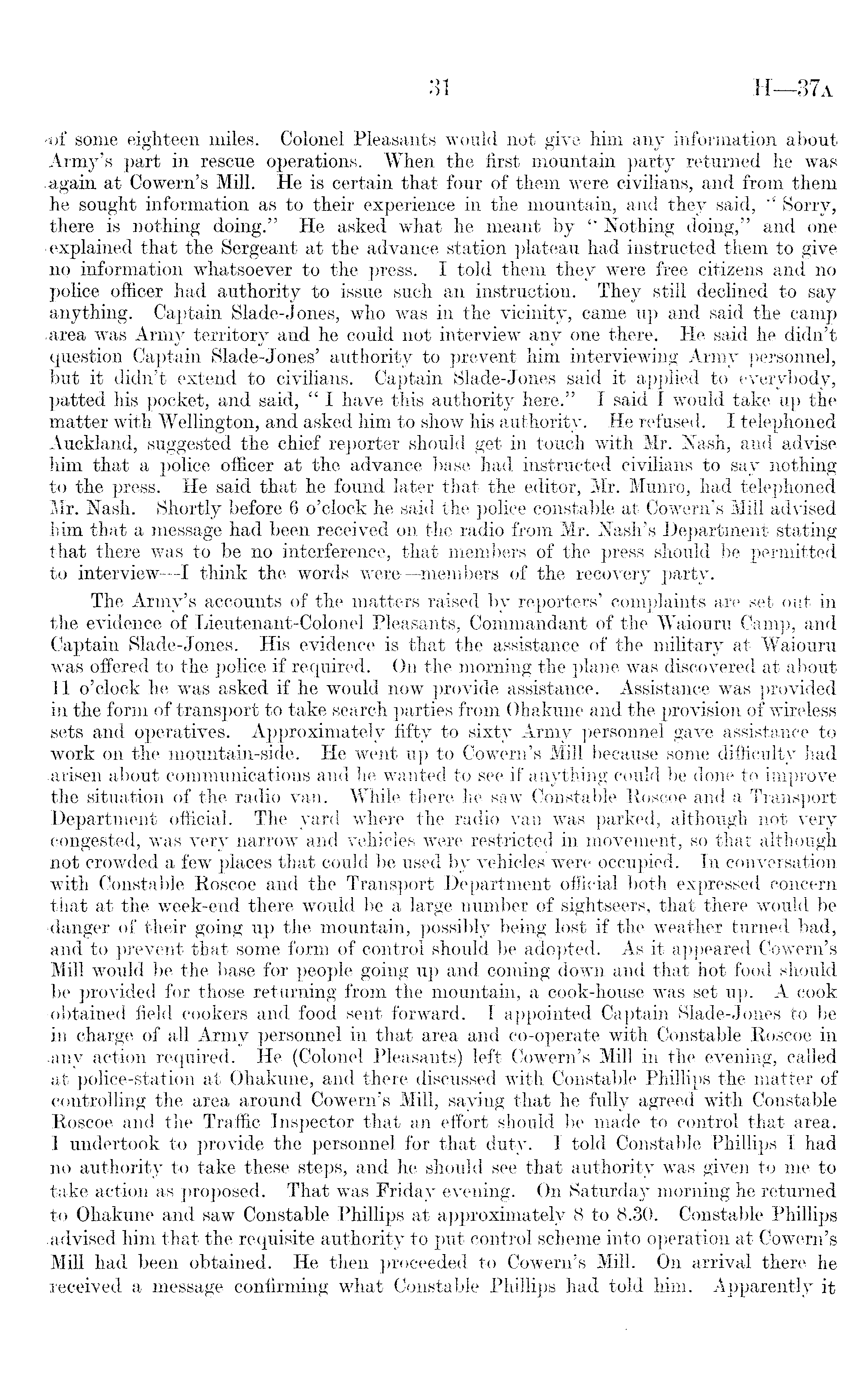 •of some eighteen miles. Colonel Pleasants would not give him any information about Army's part in rescue operations. When the first mountain party returned he was again at Cowern's Mill. He is certain that four of them were civilians, and from them he sought information as to their experience in the mountain, and they said, " Sorry, there is nothing doing." He asked what he meant by " Nothing doing," and one • explained that the Sergeant at the advance station plateau had instructed them to give no information whatsoever to the press. I told them they were free citizens and no police officer had authority to issue such an instruction. They still declined to say anything. Captain Slade-Jones, who was in the vicinity, came up and said the camp area was Army territory and he could not interview any one there. He said he didn't question Captain Slade-Jones' authority to prevent him interviewing Army personnel, but it didn't extend to civilians. Captain Slade-Jones said it applied to everybody, patted his pocket, and said, " I have this authority here." I said I would take up the matter with Wellington, and asked him to show his authority. He refused. I telephoned Auckland, suggested the chief reporter should get in touch with Mr. Nash, and advise him that a police officer at the advance base had instructed civilians to say nothing to the press. He said that he found later that the editor, Mr. Munro, had telephoned Mr. Nash. Shortly before 6 o'clock he said the police constable at Cowern's Mill advised him that a message had been received on the radio from Mr. Nash's Department stating that there was to be no interference, that members of the press should be permitted to interview —I think the words were —members of the recovery party. The Army's accounts of the matters raised by reporters' complaints are set out in the evidence of Lieutenant-Colonel Pleasants, Commandant of the Waiouru Camp, and Captain Slade-Jones. His evidence is that the assistance of the military at Waiouru was offered to the police if required. On the morning the plane was discovered at about 11 o'clock he was asked if he would now provide assistance. Assistance was provided in the form of transport to take search parties from Ohakune and the provision of wireless sets and operatives. Approximately fifty to sixty Army personnel gave assistance to work on the mountain-side. He went up to Cowern's Mill because some difficulty had arisen about communications and he wanted to see if anything could be done to improve the situation of the radio van. While there he saw Constable Roscoe and a Transport Department official. The yard where the radio van was parked, although not very congested, was very narrow and vehicles were restricted in movement, so that although not crowded a few places that could be used by vehicles were occupied. In conversation with Constable Roscoe and the Transport Department official both expressed concern that at the week-end there would be a large number of sightseers, that there would be -danger of their going up the mountain, possibly being lost if the weather turned bad, -and to prevent that some form of control should be adopted. As it appeared Cowern's Mill would be the base for people going up and coming down and that hot food should be provided for those returning from the mountain, a cook-house was set up. A cook obtained field cookers and food sent forward. I appointed Captain Slade-Jones to be in charge of all Army personnel in that area and co-operate with Constable Roscoe in -any action required. He (Colonel Pleasants) left Cowern's Mill in the evening, called at police-station at Ohakune, and there discussed with Constable Phillips the matter of controlling the area around Cowern's Mill, saying that he fully agreed with Constable Roscoe and the Traffic Inspector that an effort should be made to control that area. 1 undertook to provide the personnel for that duty. I told Constable Phillips I had no authority to take these steps, and he should see that authority was given to me to take action as proposed. That was Friday evening. On Saturday morning he returned to Ohakune and saw Constable Phillips at approximately Bto 8.30. Constable Phillips .advised him that the requisite authority to put control scheme into operation at Cowern's Mill had been obtained. He then proceeded to Cowern's Mill. On arrival there he received a message confirming what Constable Phillips had told him. Apparently it