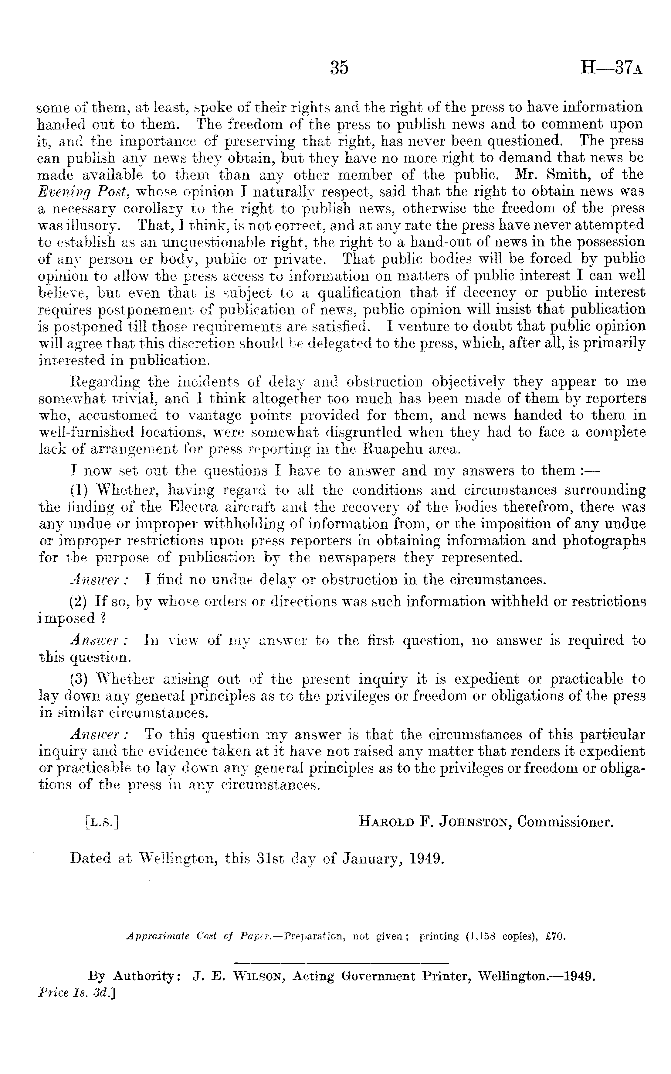 some of them, at least, spoke of their rights and the right of the press to have information handed out to them. The freedom of the press to publish news and to comment upon it, and the importance of preserving that right, has never been questioned. The press can publish any news they obtain, but they have no more right to demand that news be made available to them than any other member of the public. Mr. Smith, of the Evening Post, whose opinion I naturally respect, said that the right to obtain news was a necessary corollary to the right to publish news, otherwise the freedom of the press was illusory. That, I think, is not correct, and at any rate the press have never attempted to establish as an unquestionable right, the right to a hand-out of news in the possession of any person or body, public or private. That public bodies will be forced by public opinion to allow the press access to information on matters of public interest I can well believe, but even that is subject to a qualification that if decency or public interest requires postponement of publication of news, public opinion will insist that publication is postponed till those requirements are satisfied. I venture to doubt that public opinion will agree that this discretion should be delegated to the press, which, after all, is primarily interested in publication. Regarding the incidents of delay and obstruction objectively they appear to me somewhat trivial, and I think altogether too much has been made of them by reporters who, accustomed to vantage points provided for them, and news handed to them in well-furnished locations, were somewhat disgruntled when they had to face a complete lack of arrangement for press reporting in the Ruapehu area. I now set out the questions I have to answer and my answers to them : (1) Whether, having regard to all the conditions and circumstances surrounding the finding of the Electra aircraft and the recovery of the bodies therefrom, there was any undue or improper withholding of information from, or the imposition of any undue or improper restrictions upon press reporters in obtaining information and photographs for the purpose of publication by the newspapers they represented. Answer : I find no undue delay or obstruction in the circumstances. (2) If so, by whose orders or directions was such information withheld or restrictions imposed ? Answer: In view of my answer to the first question, no answer is required to this question. (3) Whether arising out of the present inquiry it is expedient or practicable to lay down any general principles as to the privileges or freedom or obligations of the press in similar circumstances. Answer: To this question my answer is that the circumstances of this particular inquiry and the evidence taken at it have not raised any matter that renders it expedient or practicable to lay down any general principles as to the privileges or freedom or obligations of the press in any circumstances. [l.s.] Hakold F. Johnston, Commissioner. Dated at Wellington, this 31st day of January, 1949.