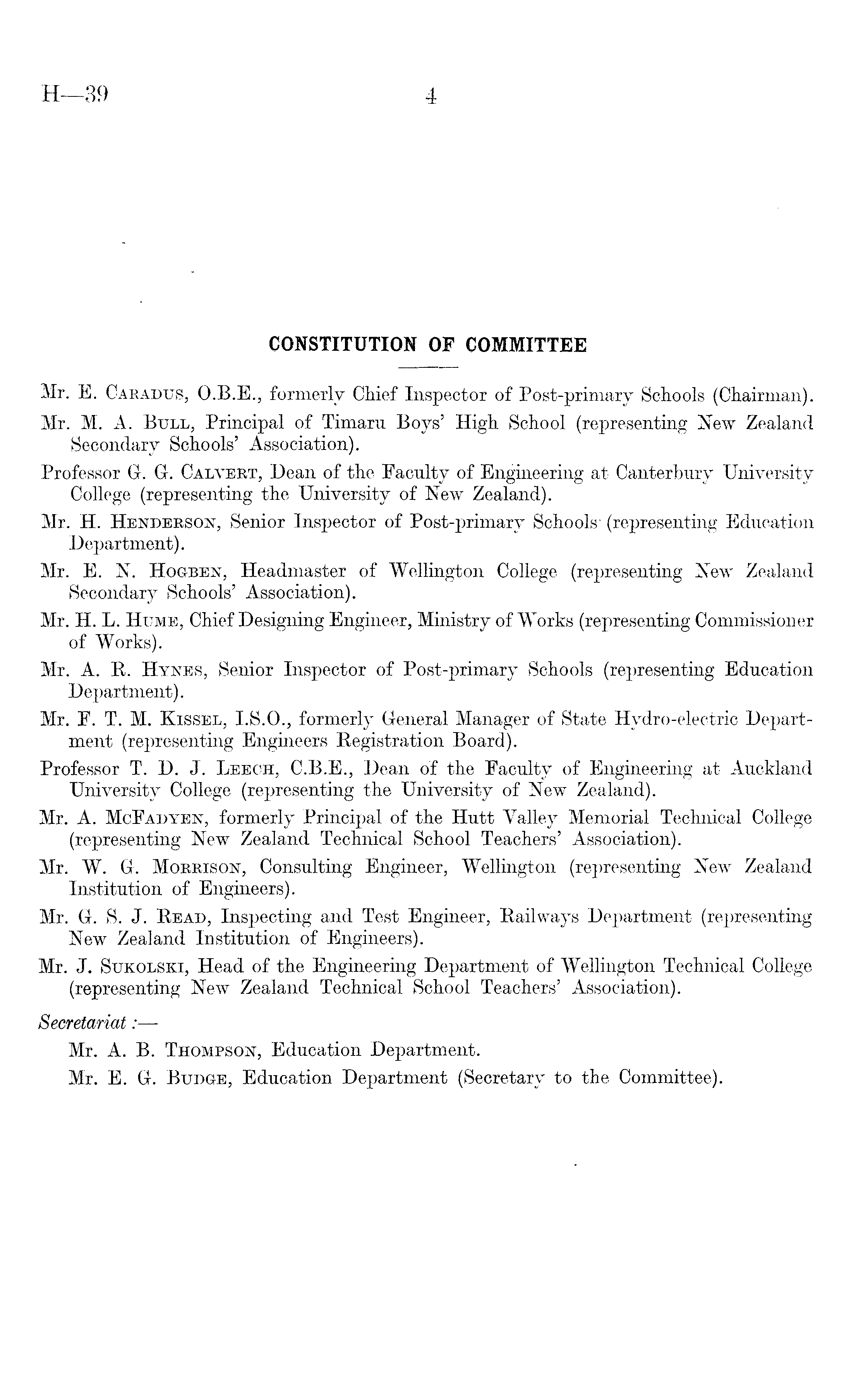 Mr. E. Caradus, 0.8. E., formerly Chief Inspector of Post-primary Schools (Chairman). Mr. M. A. Bull, Principal of Timaru Boys' High School (representing New Zealand Secondary Schools' Association). Professor G. G. Calvert, Dean of the Faculty of Engineering at Canterbury University College (representing the University of New Zealand). Mr. H. Henderson, Senior Inspector of Post-primary Schools' (representing Education Department). Mr. E. N. Hogben, Headmaster of Wellington College (representing New Zealand Secondary Schools' Association). Mr. H. L. Hume, Chief Designing Engineer, Ministry of Works (representing Commissioner of Works). Mr. A. R. Hynes, Senior Inspector of Post-primary Schools (representing Education Department). Mr. F. T. M. Kissel, 1.5.0., formerly General Manager of State Hydro-electric Department (representing Engineers Registration Board). Professor T. D. J. Leech, C.8.E., Dean of the Faculty of Engineering at Auckland University College (representing the University of New Zealand). Mr. A. McFadyen, formerly Principal of the Hutt Valley Memorial Technical College (representing New Zealand Technical School Teachers' Association). Mr. W. G. Morrison, Consulting Engineer, Wellington (representing New Zealand Institution of Engineers). Mr. G. S. J. Read, Inspecting and Test Engineer, Railways Department (representing New Zealand Institution of Engineers). Mr. J. Sukolski, Head of the Engineering Department of Wellington Technical College (representing New Zealand Technical School Teachers' Association). Secretariat: — Mr. A. B. Thompson, Education Department. Mr. E. G. Budge, Education Department (Secretary to the Committee).