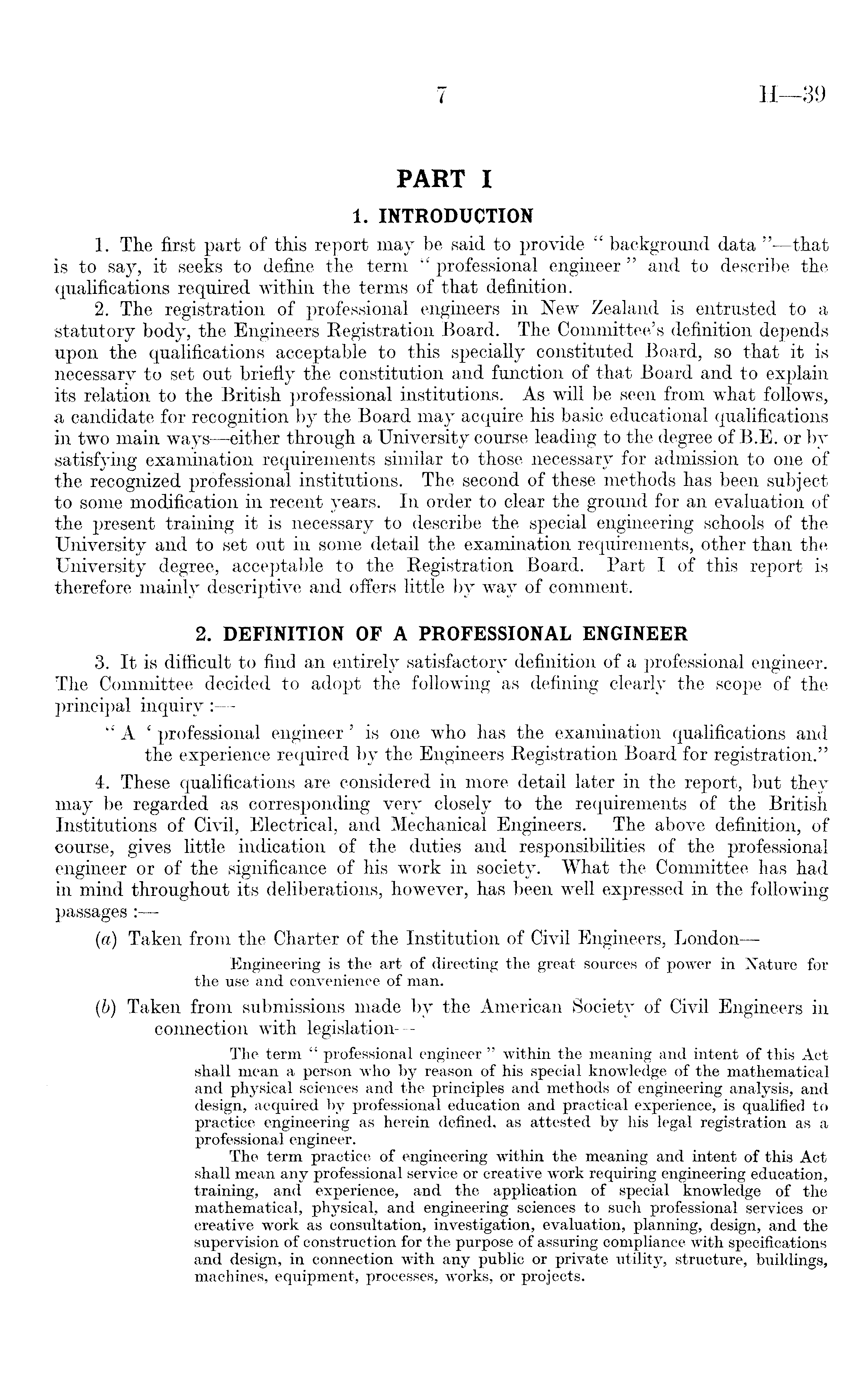 PART I 1. INTRODUCTION 1. The first part of this report may be said to provide " background data " —that is to say, it seeks to define the term " professional engineer " and to describe the qualifications required within the terms of that definition. 2. The registration of professional engineers in New Zealand is entrusted to a statutory body, the Engineers Registration Board. The Committee's definition depends upon the qualifications acceptable to this specially constituted Board, so that it is necessary to set out briefly the constitution and function of that Board and to explain its relation to the British professional institutions. As will be seen from what follows, a candidate for recognition by the Board may acquire his basic educational qualifications in two main ways —either through a University course leading to the degree of B.E. or by satisfying examination requirements similar to those necessary for admission to one of the recognized professional institutions. The second of these methods has been subject to some modification in recent years. In order to clear the ground for an evaluation of the present training it is necessary to describe the special engineering schools of the University and to set out in some detail the examination requirements, other than the University degree, acceptable to the Registration Board. Part I of this report is therefore mainly descriptive and offers little by way of comment. 2. DEFINITION OF A PROFESSIONAL ENGINEER 3. It is difficult to find an entirely satisfactory definition of a professional engineer. The Committee decided to adopt the following as defining clearly the scope of the principal inquiry : "A ' professional engineer' is one who has the examination qualifications and the experience required by the Engineers Registration Board for registration." 4. These qualifications are considered in more detail later in the report, but they may be regarded as corresponding very closely to the requirements of the British Institutions of Civil, Electrical, and Mechanical Engineers. The above definition, of course, gives little indication of the duties and responsibilities of the professional engineer or of the significance of his work in society. What the Committee has had in mind throughout its deliberations, however, has been well expressed in the following passages : (a) Taken from the Charter of the Institution of Civil Engineers, London— Engineering is the art of directing the great sources of power in Nature for the use and convenience of man. (b) Taken from submissions made by the American Society of Civil Engineers in connection with legislation— The term " professional engineer " within the meaning and intent of this Act shall mean a person who by reason of his special knowledge of the mathematical and physical sciences and the principles and methods of engineering analysis, and design, acquired by professional education and practical experience, is qualified to practice engineering as herein defined, as attested by his legal registration as a professional engineer. The term practice of engineering within the meaning and intent of this Act shall mean any professional service or creative work requiring engineering education, training, and experience, and the application of special knowledge of the mathematical, physical, and engineering sciences to such professional services or creative work as consultation, investigation, evaluation, planning, design, and the supervision of construction for the purpose of assuring compliance with specifications and design, in connection with any public or private utility, structure, buildings, machines, equipment, processes, works, or projects.