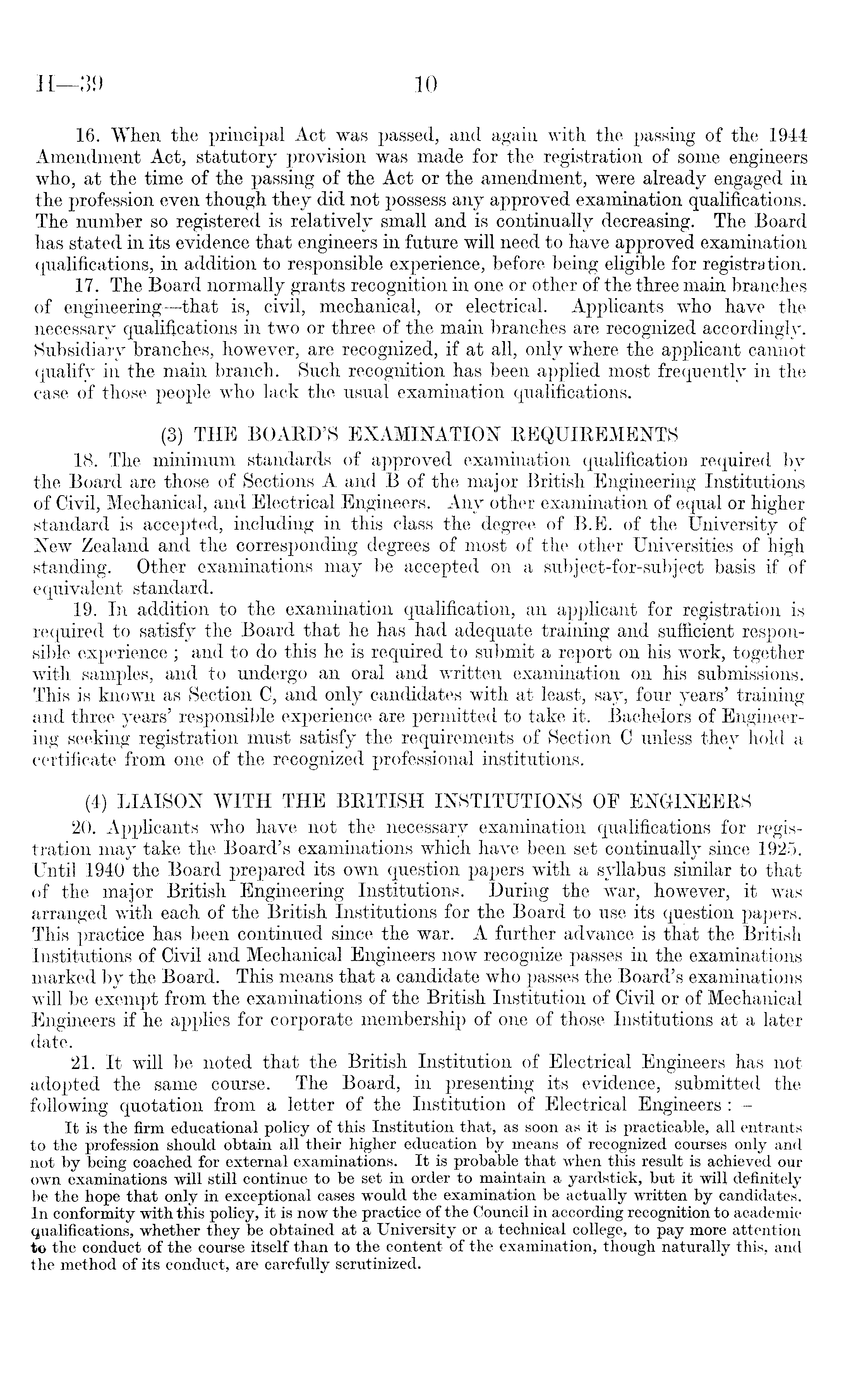 16. When the principal Act was passed, and again with the passing of the 1944 Amendment Act, statutory provision was made for the registration of some engineers who, at the time of the passing of the Act or the amendment, were already engaged in the profession even though they did not possess any approved examination qualifications. The number so registered is relatively small and is continually decreasing. The Board has stated in its evidence that engineers in future will need to have approved examination qualifications, in addition to responsible experience, before being eligible for registration. 17. The Board normally grants recognition in one or other of the three main branches of engineering—that is, civil, mechanical, or electrical. Applicants who have the necessary qualifications in two or three of the main branches are recognized accordingly. Subsidiary branches, however, are recognized, if at all, only where the applicant cannot qualify in the main branch. Such recognition has been applied most frequently in the case of those people who lack the usual examination qualifications. (3) THE BOARD'S EXAMINATION REQUIREMENTS 18. The minimum standards of approved examination qualification required by the Board are those of Sections A and B of the major British Engineering Institutions of Civil, Mechanical, and Electrical Engineers. Any other examination of equal or higher standard is accepted, including in this class the degree of B.E. of the University of New Zealand and the corresponding degrees of most of the other Universities of high standing. Other examinations may be accepted on a subject-for-subject basis if of equivalent standard. 19. In addition to the examination qualification, an applicant for registration is required to satisfy the Board that he has had adequate training and sufficient responsible experience ; and to do this he is required to submit a report on his work, together with samples, and to undergo an oral and written examination on his submissions. This is known as Section C, and only candidates with at least, say, four years' training and three years' responsible experience are permitted to take it. Bachelors of Engineering seeking registration must satisfy the requirements of Section C unless they hold a certificate from one of the recognized professional institutions. (4) LIAISON WITH THE BRITISH INSTITUTIONS OF ENGINEERS 20. Applicants who have not the necessary examination qualifications for registration may take the Board's examinations which have been set continually since 1925. Until 1940 the Board prepared its own question papers with a syllabus similar to that of the major British Engineering Institutions. During the war, however, it was arranged with each of the British Institutions for the Board to use its question papers. This practice has been continued since the war. A further advance is that the British Institutions of Civil and Mechanical Engineers now recognize passes in the examinations marked by the Board. This means that a candidate who passes the Board's examinations will be exempt from the examinations of the British Institution of Civil or of Mechanical Engineers if he applies for corporate membership of one of those Institutions at a later date. 21. It will be noted that the British Institution of Electrical Engineers has not adopted the same course. The Board, in presenting its evidence, submitted the following quotation from a letter of the Institution of Electrical Engineers : —- It is the firm educational policy of this Institution that, as soon as it is practicable, all entrants to the profession should obtain all their higher education by means of recognized courses only and not by being coached for external examinations. It is probable that when this result is achieved our own examinations will still continue to be set in order to maintain a yardstick, but it will definitely be the hope that only in exceptional cases would the examination be actually written by candidates. In conformity with this policy, it is now the practice of the Council in according recognition to academic qualifications, whether they be obtained at a University or a technical college, to pay more attention to the conduct of the course itself than to the content of the examination, though naturally this, and the method of its conduct, are carefully scrutinized.