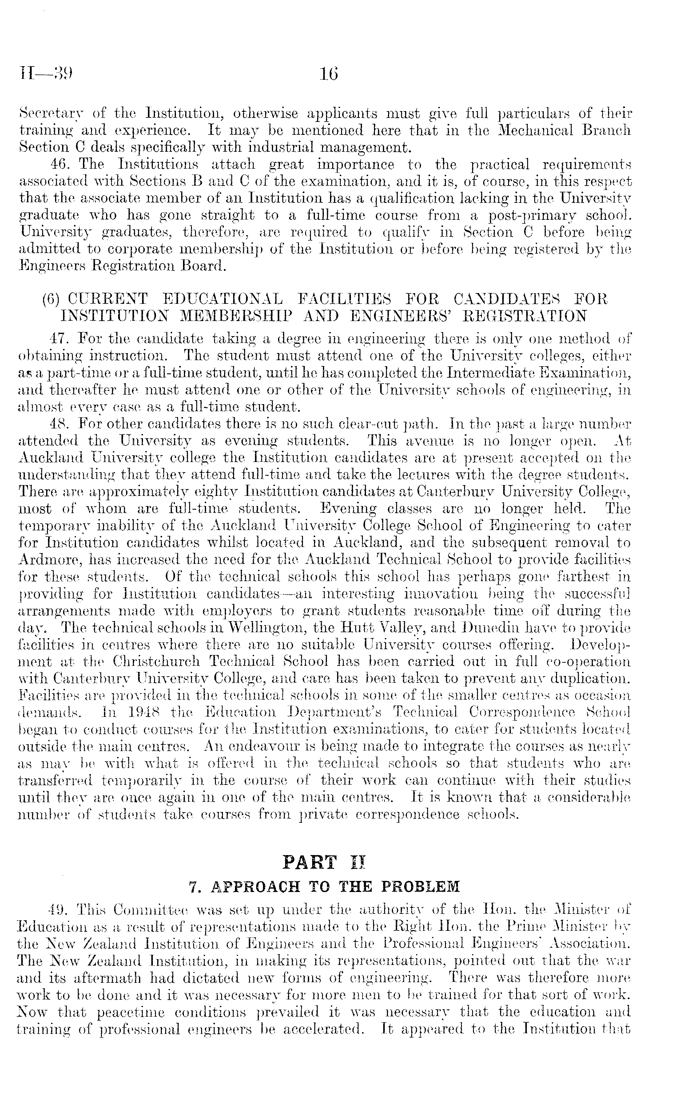 Secretary of the Institution, otherwise applicants must give full particulars of their training and experience. It may be mentioned here that in the Mechanical Branch Section C deals specifically with industrial management. 46. The Institutions attach great importance to the practical requirements associated with Sections B and C of the examination, and it is, of course, in this respect that the associate member of an Institution has a qualification lacking in the University graduate who has gone straight to a full-time course from a post-primary school. University graduates, therefore, are required to qualify in Section C before being admitted to corporate membership of the Institution or before being registered by the Engineers Registration Board. (6) CURRENT EDUCATIONAL FACILITIES FOR CANDIDATES FOR INSTITUTION MEMBERSHIP AND ENGINEERS' REGISTRATION 47. For the candidate taking a degree in engineering there is only one method of obtaining instruction. The student must attend one of the University colleges, either as a part-time or a full-time student, until he has completed the Intermediate Examination, and thereafter he must attend one or other of the University schools of engineering, in almost eyery case as a full-time student. 48. For other candidates there is no such clear-cut path. In the past a large number attended the University as evening students. This avenue is no longer open. At Auckland University college the Institution candidates are at present accepted on the understanding that they attend full-time and take the lectures with the degree students. There are approximately eighty Institution candidates at Canterbury University College, most of whom are full-time students. Evening classes are no longer held. The temporary inability of the Auckland University College School of Engineering to cater for Institution candidates whilst located in Auckland, and the subsequent removal to Ardmore, has increased the need for the Auckland Technical School to provide facilities for these students. Of the technical schools this school has perhaps gone farthest in providing for Institution candidates —an interesting innovation being the successful arrangements made with employers to grant students reasonable time off during the day. The technical schools in Wellington, the Hutt Yalley, and Dunedin have to provide facilities in centres where there are no suitable University courses offering. Development at the Christchurch Technical School has been carried out in full co-operation with Canterbury University College, and care has been taken to prevent any duplication. Facilities are provided in the technical schools in some of the smaller centres as occasion demands. In 1948 the Education Department's Technical Correspondence School began to conduct courses for the Institution examinations, to cater for students located outside the main centres. An endeavour is being made to integrate the courses as nearly as may be with what is offered in the technical schools so that students who are transferred temporarily in the course of their work can continue with their studies until they are once again in one of the main centres. It is known that a considerable number of students take courses from private correspondence schools. PART II 7. APPROACH TO THE PROBLEM 49. This Committee was set up under the authority of the Hon. the Minister of Education as a result of representations made to the Right Hon. the Prime Minister by the New Zealand Institution of Engineers and the Professional Engineers' Association. The New Zealand Institution, in making its representations, pointed out that the war and its aftermath had dictated new forms of engineering. There was therefore more work to be done and it was necessary for more men to be trained for that sort of work. Now that peacetime conditions prevailed it was necessary that the education and training of professional engineers be accelerated. It appeared to the Institution that