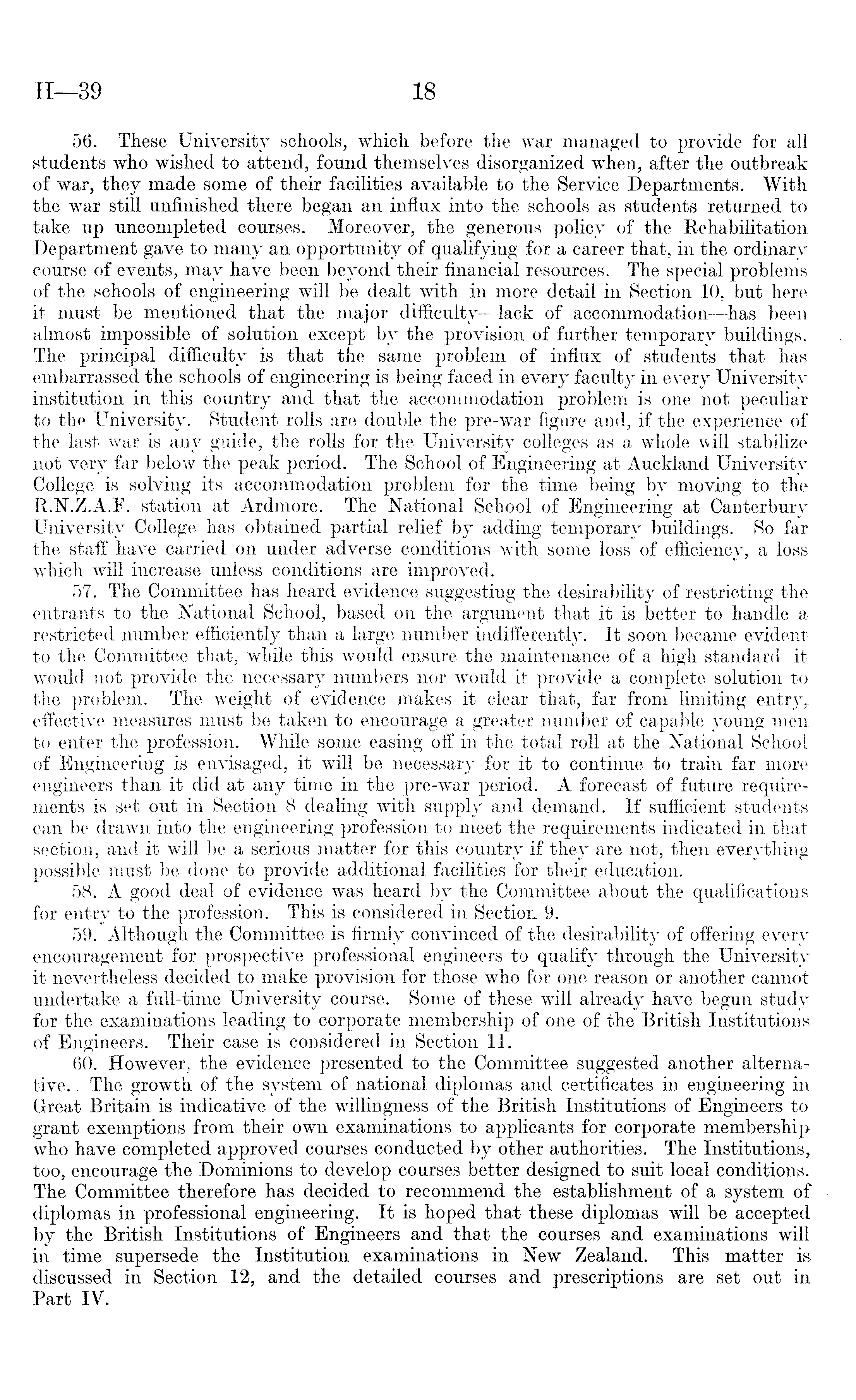 56. These University schools, which before the war managed to provide for all students who wished to attend, found themselves disorganized when, after the outbreak of war, they made some of their facilities available to the Service Departments. With the war still unfinished there began an influx into the schools as students returned to take up uncompleted courses. Moreover, the generous policy of the Rehabilitation Department gave to many an opportunity of qualifying for a career that, in the ordinary course of events, may have been beyond their financial resources. The special problems of the schools of engineering will be dealt with in more detail in Section 10, but here it must be mentioned that the major difficulty—lack of accommodation —has been almost impossible of solution except by the provision of further temporary buildings. The principal difficulty is that the same problem of influx of students that has embarrassed the schools of engineering is being faced in every faculty in every University institution in this country and that the accommodation problem is one not peculiar to the University. Student rolls are double the pre-war figure and, if the experience of the last war is any guide, the rolls for the University colleges as a whole v-ill stabilize not very far below the peak period. The School of Engineering at Auckland University College is solving its accommodation problem for the time being by moving to the R.N.Z.A.F. station at Ardmore. The National School of Engineering at Canterbury University College has obtained partial relief by adding temporary buildings. So far the staff have carried on under adverse conditions with some loss of efficiency, a loss which will increase unless conditions are improved. 57. The Committee has heard evidence suggesting the desirability of restricting the entrants to the National School, based on the argument that it is better to handle a restricted number efficiently than a large number indifferently. It soon became evident to the Committee that, while this would ensure the maintenance of a high standard itwould not provide the necessary numbers nor would it provide a complete solution to the problem. The weight of evidence makes it clear that, far from limiting entry ? effective measures must be taken to encourage a greater number of capable young men to enter the profession. While some easing off in the total roll at the National School of Engineering is envisaged, it will be necessary for it to continue to train far more engineers than it did at any time in "the pre-war period. A forecast of future requirements is set out in Section 8 dealing with supply and demand. If sufficient students can be drawn into the engineering profession to meet the requirements indicated in that section, and it will be a serious matter for this country if they are not, then everything possible must be done to provide additional facilities for their education. 58. A good deal of evidence was heard by the Committee about the qualifications for entry to the profession. This is considered in Section 9. • 59. Although the Committee is firmly convinced of the desirability of offering every encouragement for prospective professional engineers to qualify through the University it nevertheless decided to make provision for those who for one reason or another cannot undertake a full-time University course. Some of these will already have begun study for the examinations leading to corporate membership of one of the British Institutions of Engineers. Their case is considered in Section 11. 60. However, the evidence presented to the Committee suggested another alternative. „ The growth of the system of national diplomas and certificates in engineering in Great Britain is indicative of the willingness of the British Institutions of Engineers to grant exemptions from their own examinations to applicants for corporate membership who have completed approved courses conducted by other authorities. The Institutions, too, encourage the Dominions to develop courses better designed to suit local conditions. The Committee therefore has decided to recommend the establishment of a system of diplomas in professional engineering. It is hoped that these diplomas will be accepted by the British Institutions of Engineers and that the courses and examinations will in time supersede the Institution examinations in New Zealand. This matter is discussed in Section 12, and the detailed courses and prescriptions are set out in Part IV.