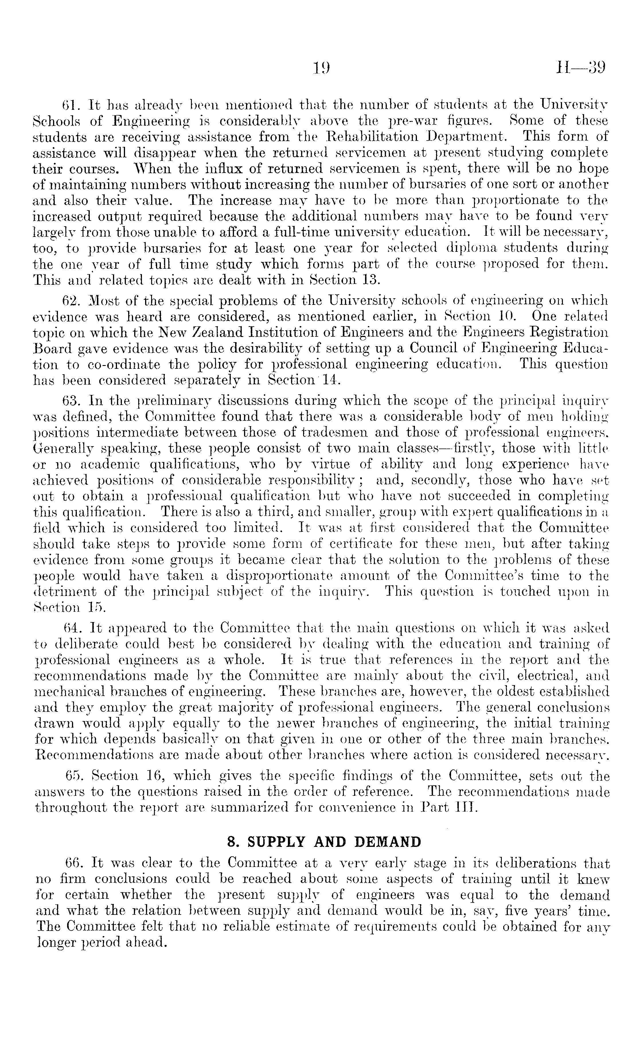 61. It has already been mentioned that the number of students at the University Schools of Engineering is considerably above the pre-war figures. Some of these students are receiving assistance from the Rehabilitation Department. This form of assistance will disappear when the returned servicemen at present studying complete their courses. When the influx of returned servicemen is spent, there will be no hope of maintaining numbers without increasing the number of bursaries of one sort or another and also their value. The increase may have to be more than proportionate to the increased output required because the additional numbers may have to be found very largely from those unable to afford a full-time university education. It will be necessary, too, to provide bursaries for at least one year for selected diploma students during the one year of full time study which forms part of the course proposed for them. This and related topics are dealt with in Section 13. 62. Most of the special problems of the University schools of engineering on which evidence was heard are considered, as mentioned earlier, in Section 10. One related topic on which the New Zealand Institution of Engineers and the Engineers Registration Board gave evidence was the desirability of setting up a Council of Engineering Education to co-ordinate the policy for professional engineering education. This question has been considered separately in Section 14. 63. In the preliminary discussions during which the scope of the principal inquiry was defined, the Committee found that there was a considerable body of men holding positions intermediate between those of tradesmen and those of professional engineers. Generally speaking, these people consist of two main classes —firstly, those with little or no academic qualifications, who by virtue of ability and long experience have achieved positions of considerable responsibility; and, secondly, those who have set out to obtain a professional qualification but who have not succeeded in completing this qualification. There is also a third, and smaller, group with expert qualifications in a field which is considered too limited. It was at first considered that the Committee should take steps to provide some form of certificate for these men, but after taking evidence from some groups it became clear that the solution to the problems of these people would have taken a disproportionate amount of the Committee's time to the detriment of the principal subject of the inquiry. This question is touched upon in Section 15. 64. It appeared to the Committee that the main questions on which it was asked to deliberate could best be considered by dealing with the education and training of professional engineers as a whole. It is true that references in the report and the recommendations made by the Committee are mainly about the civil, electrical, and mechanical branches of engineering. These branches are, however, the oldest established and they employ the great majority of professional engineers. The general conclusions drawn would apply equally to the newer branches of engineering, the initial training for which depends basically on that given in one or other of the three main branches. Recommendations are made about other branches where action is considered necessary. 65. Section 16, which gives the specific findings of the Committee, sets out the answers to the questions raised in the order of reference. The recommendations made throughout the report are summarized for convenience in Part 111. 8. SUPPLY AND DEMAND 66. It was clear to the Committee at a very early stage in its deliberations that no firm conclusions could be reached about some aspects of training until it knew for certain whether the present supply of engineers was equal to the demand and what the relation between supply and demand would be in, say, five years' time. The Committee felt that no reliable estimate of requirements could be obtained for any longer period ahead.