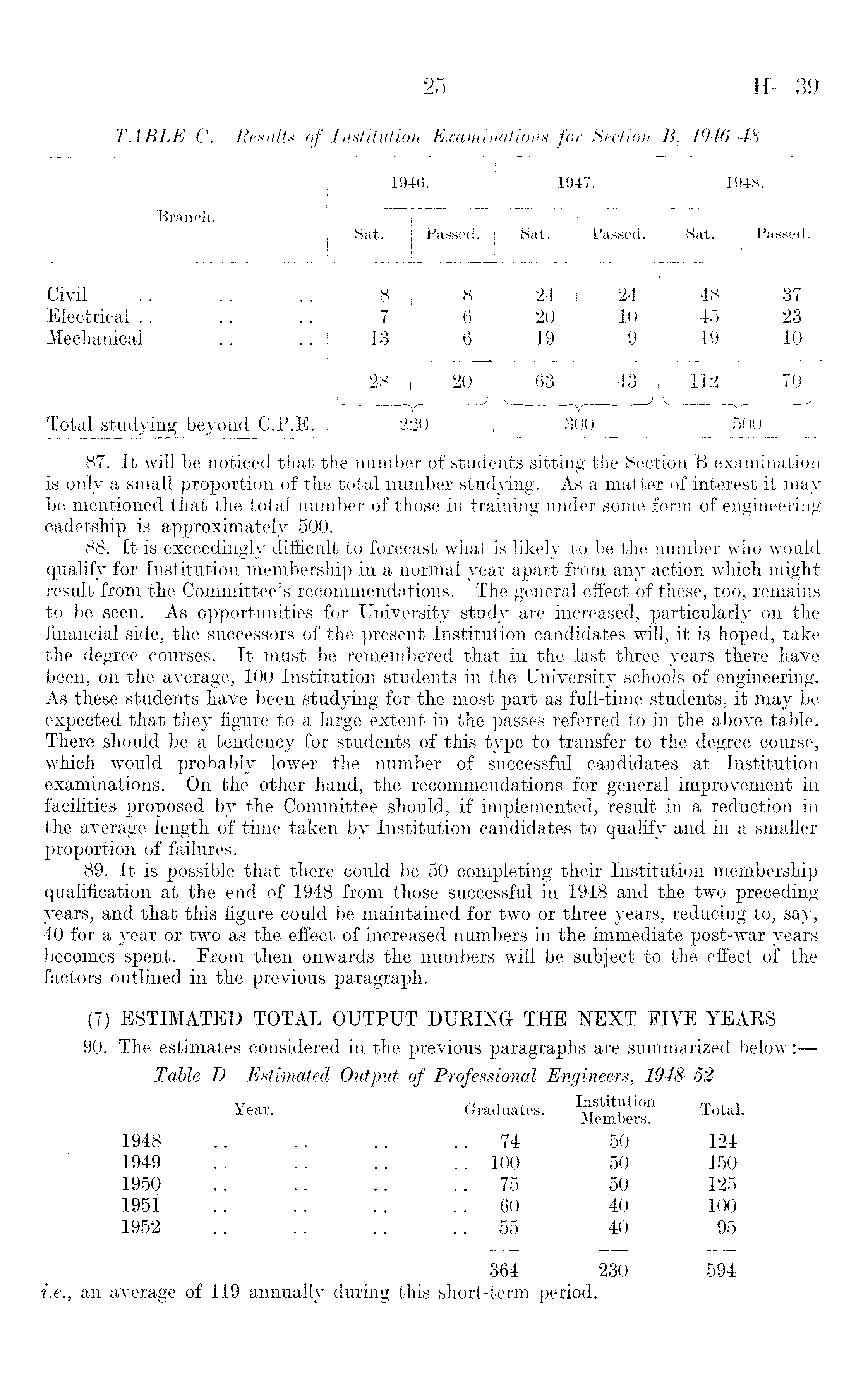 87. It will be noticed that the number of students sitting the Section B examination is only a small proportion of the total number studying. As a matter of interest it may be mentioned that the total number of those in training under some form of engineering cadetship is approximately 500. 88. It is exceedingly difficult to forecast what is likely to be the number who would qualify for Institution membership in a normal year apart from any action which might result from the Committee's recommendations. The general effect of these, too, remains to be seen. As opportunities for University study are increased, particularly on the financial side, the successors of the present Institution candidates will, it is hoped, take the degree courses. It must be remembered that in the last three years there have been, on the average, 100 Institution students in the University schools of engineering. As these students have been studying for the most part as full-time students, it may be expected that they figure to a large extent in the passes referred to in the above table. There should be a tendency for students of this type to transfer to the degree course, which would probably lower the number of successful candidates at Institution examinations. On the other hand, the recommendations for general improvement in facilities proposed by the Committee should, if implemented, result in a reduction in the average length of time taken by Institution candidates to qualify and in a smaller proportion of failures. 89. It is possible that there could be 50 completing their Institution membership qualification at the end of 1948 from those successful in 1948 and the two preceding years, and that this figure could be maintained for two or three years, reducing to, say, 40 for a year or two as the effect of increased numbers in the immediate post-war years becomes spent. From then onwards the numbers will be subject to the effect of the factors outlined in the previous paragraph. (7) ESTIMATED TOTAL OUTPUT DURING THE NEXT FIVE YEARS 90. The estimates considered in the previous paragraphs are summarized below:— Table D—Estimated Output of Professional Engineers, 1948-52 Year - Graduates. Total. 1948 .. .. .. .. 74 50 124 1949 .. .. .. .. 100 50 150 1950 .. .. .. .. 75 50 125 1951 .... .. .. 60 40 100 1952 .. .. .. .. 55 40 95 364 230 594 i.e., an average of 119 annually during this short-term period.