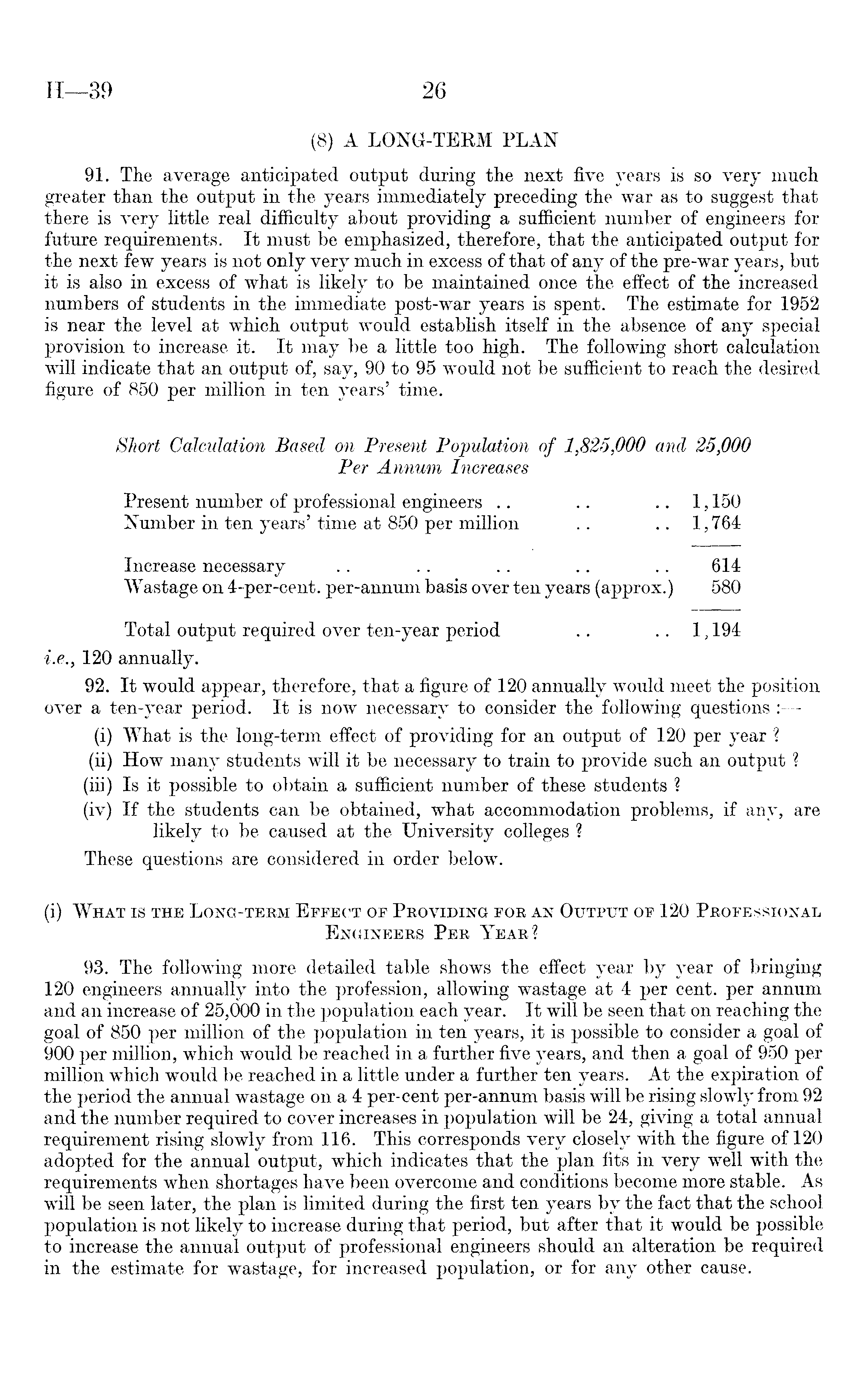 (8) A LONG-TERM PLAN 91. The average anticipated output during the next five years is so very much greater than the output in the years immediately preceding the war as to suggest that there is very little real difficulty about providing a sufficient number of engineers for future requirements. It must be emphasized, therefore, that the anticipated output for the next few years is not only very much in excess of that of any of the pre-war years, but it is also in excess of what is likely to be maintained once the effect of the increased numbers of students in the immediate post-war years is spent. The estimate for 1952 is near the level at which output would establish itself in the absence of any special provision to increase it. It may be a little too high. The following short calculation will indicate that an output of, say, 90 to 95 would not be sufficient to reach the desired figure of 850 per million in ten years' time. Short Calculation Based on Present Population of 1,825,000 and 25,000 Per Annum Increases Present number of professional engineers .. .. 1,150 Number in ten years'time at 850 per million .. .. 1,764 Increase necessary .. .. .. .. .. 614 Wastage on 4-per-cent. per-annum basis over ten years (approx.) 580 Total output required over ten-year period .. 1,194 i.e., 120 annually. 92. It would appear, therefore, that a figure of 120 annually would meet the position over a ten-year period. It is now necessary to consider the following questions : (i) What is the long-term effect of providing for an output of 120 per year ? (ii) How many students will it be necessary to train to provide such an output ? (iii) Is it possible to obtain a sufficient number of these students ? (iv) If the students can be obtained, what accommodation problems, if any, are likely to be caused at the University colleges ? These questions are considered in order below. (i) What is the Long-term Effect of Providing for an Output of 120 Professional Engineers Per Year? 93. The following more detailed table shows the effect year by year of bringing 120 engineers annually into the profession, allowing wastage at 4 per cent, per annum and an increase of 25,000 in the population each year. It will be seen that on reaching the goal of 850 per million of the population in ten years, it is possible to consider a goal of 900 per million, which would be reached in a further five years, and then a goal of 950 per million which would be reached in a little under a further ten years. At the expiration of the period the annual wastage on a 4 per-cent per-annum basis will be rising slowly from 92 and the number required to cover increases in population will be 24, giving a total annual requirement rising slowly from 116. This corresponds very closely with the figure of 120 adopted for the annual output, which indicates that the plan fits in very well with the requirements when shortages have been overcome and conditions become more stable. As will be seen later, the plan is limited during the first ten years by the fact that the school population is not likely to increase during that period, but after that it would be possible to increase the annual output of professional engineers should an alteration be required in the estimate for wastage, for increased population, or for any other cause.
