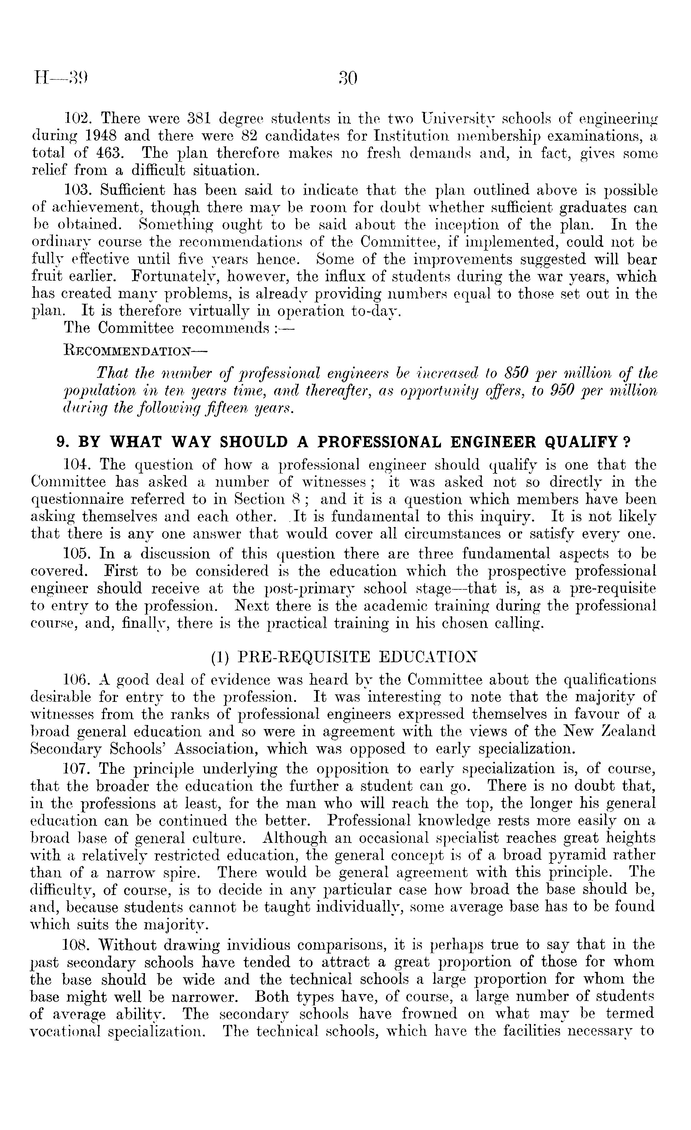 102. There were 381 degree students in the two University schools of engineering during 1948 and there were 82 candidates for Institution membership examinations, a total of 463. The plan therefore makes no fresh demands and, in fact, gives some relief from a difficult situation. 103. Sufficient has been said to indicate that the plan outlined above is possible of achievement, though there may be room for doubt whether sufficient graduates can be obtained. Something ought to be said about the inception of the plan. In the ordinary course the recommendations of the Committee, if implemented, could not be fully effective until five years hence. Some of the improvements suggested will bear fruit earlier. Fortunately, however, the influx of students during the war years, which has created many problems, is already providing numbers equal to those set out in the plan. It is therefore virtually in operation to-day. The Committee recommends : Recommendation—That the number of professional engineers be increased to 850 per million of the population in ten years time, and thereafter, as opportunity offers, to 950 per million during the following fifteen years. 9. BY WHAT WAY SHOULD A PROFESSIONAL ENGINEER QUALIFY ? 104. The question of how a professional engineer should qualify is one that the Committee has asked a number of witnesses ; it was asked not so directly in the questionnaire referred to in Section 8 ; and it is a question which members have been asking themselves and each other. It is fundamental to this inquiry. It is not likely that there is any one answer that would cover all circumstances or satisfy every one. 105. In a discussion of this question there are three fundamental aspects to be covered. First to be considered is the education which the prospective professional engineer should receive at the post-primary school stage —that is, as a pre-requisite to entry to the profession. Next there is the academic training during the professional course, and, finally, there is the practical training in his chosen calling. (1) PRE-REQUISITE EDUCATION 106. A good deal of evidence was heard by the Committee about the qualifications desirable for entry to the profession. It was interesting to note that the majority of witnesses from the ranks of professional engineers expressed themselves in favour of a broad general education and so were in agreement with the views of the New Zealand Secondary Schools' Association, which was opposed to early specialization. 107. The principle underlying the opposition to early specialization is, of course, that the broader the education the further a student can go. There is no doubt that, in the professions at least, for the man who will reach the top, the longer his general education can be continued the better. Professional knowledge rests more easily on a broad base of general culture. Although an occasional specialist reaches great heights with a relatively restricted education, the general concept is of a broad pyramid rather than of a narrow spire. There would be general agreement with this principle. The difficulty, of course, is to decide in any particular case how broad the base should be, and, because students cannot be taught individually, some average base has to be found which suits the majority. 108. Without drawing invidious comparisons, it is perhaps true to say that in the past secondary schools have tended to attract a great proportion of those for whom the base should be wide and the technical schools a large proportion for whom the base might well be narrower. Both types have, of course, a large number of students of average ability. The secondary schools have frowned on what may be termed vocational specialization. The technical schools, which have the facilities necessary to