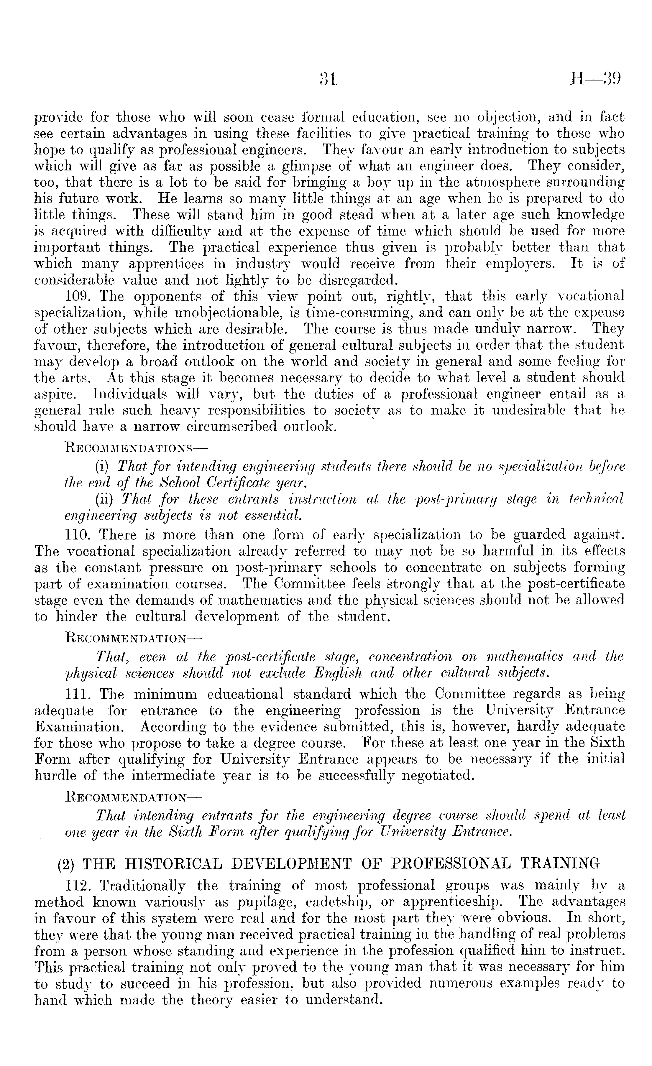 provide for those who will soon cease formal education, see no objection, and in fact see certain advantages in using these facilities to give practical training to those who hope to qualify as professional engineers. They favour an early introduction to subjects which will give as far as possible a glimpse of what an engineer does. They consider, too, that there is a lot to be said for bringing a boy up in the atmosphere surrounding his future work. He learns so many little things at an age when he is prepared to do little things. These will stand him in good stead when at a later age such knowledge is acquired with difficulty and at the expense of time which should be used for more important things. The practical experience thus given is probably better than that which many apprentices in industry would receive from their employers. It is of considerable value and not lightly to be disregarded. 109. The opponents of this view point out, rightly, that this early vocational specialization, while unobjectionable, is time-consuming, and can only be at the expense of other subjects which are desirable. The course is thus made unduly narrow. They favour, therefore, the introduction of general cultural subjects in order that the student may develop a broad outlook on the world and society in general and some feeling for the arts. At this stage it becomes necessary to decide to what level a student should aspire. Individuals will vary, but the duties of a professional engineer entail as a general rule such heavy responsibilities to society as to make it undesirable that he should have a narrow circumscribed outlook. Recommendations — (i) That for intending engineering students there should be no specialization before the end of the School Certificate year. (ii) That for these entrants instruction at the post-primary stage in technical engineering subjects is not essential. 110. There is more than one form of early specialization to be guarded against. The vocational specialization already deferred to may not be so harmful in its effects as the constant pressure on post-primary schools to concentrate on subjects forming part of examination courses. The Committee feels strongly that at the post-certificate stage even the demands of mathematics and the physical sciences should not be allowed to hinder the cultural development of the student. Recommendation— That, even at the post-certificate stage, concentration on mathematics and the physical sciences should not exclude English and other cultural subjects. 111. The minimum educational standard which the Committee regards as being adequate for entrance to the engineering profession is the University Entrance Examination. According to the evidence submitted, this is, however, hardly adequate for those who propose to take a degree course. For these at least one year in the Sixth Form after qualifying for University Entrance appears to be necessary if the initial hurdle of the intermediate year is to be successfully negotiated. Recommendation — That intending entrants for the engineering degree course should spend at least one year in the Sixth Form after qualifying for University Entrance. (2) THE HISTORICAL DEVELOPMENT OF PROFESSIONAL TRAINING 112. Traditionally the training of most professional groups was mainly by a method known variously as pupilage, cadetship, or apprenticeship. The advantages in favour of this system were real and for the most part they were obvious. In short, they were that the young man received practical training in the handling of real problems from a person whose standing and experience in the profession qualified him to instruct. This practical training not only proved to the young man that it was necessary for him to study to succeed in his profession, but also provided numerous examples ready to hand which made the theory easier to understand.