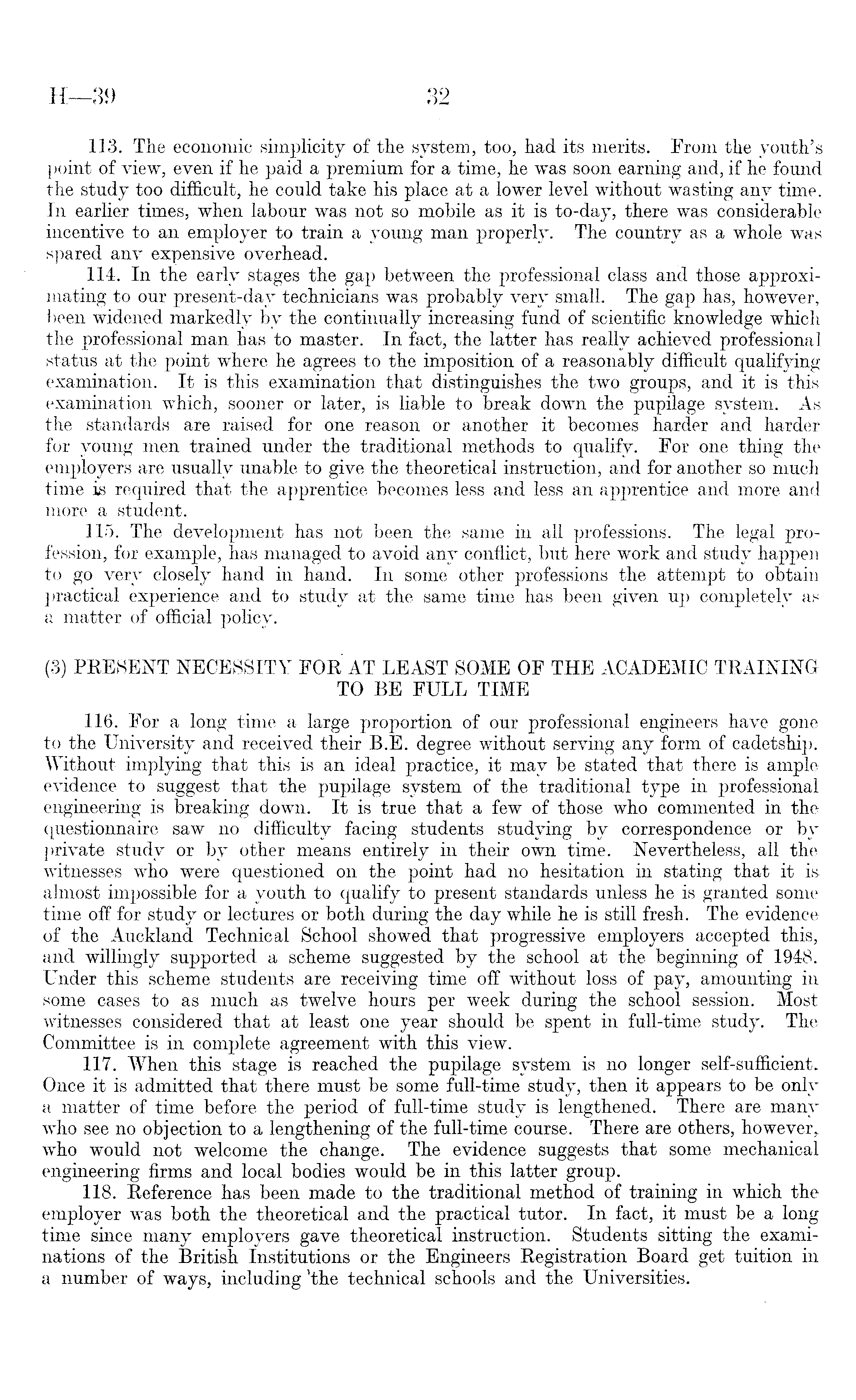113. The economic simplicity of the system, too, had its merits. From the youth's point of view, even if he paid a premium for a time, he was soon earning and, if he found the study too difficult, he could take his place at a lower level without wasting any time. In earlier times, when labour was not so mobile as it is to-day, there was considerable incentive to an employer to train a young man properly. The country as a whole was spared anv expensive overhead. 114. In the early stages the gap between the professional class and those approximating to our present-day technicians was probably very small. The gap has, however, been widened markedly by the continually increasing fund of scientific knowledge which the professional man has to master. In fact, the latter has really achieved professional status at the point where he agrees to the imposition of a reasonably difficult qualifying examination. It is this examination that distinguishes the two groups, and it is this examination which, sooner or later, is liable to break down the pupilage system. As the standards are raised for one reason or another it becomes harder and harder for young men trained under the traditional methods to qualify. For one thing the employers are usually unable to give the theoretical instruction, and for another so much time is required that the apprentice becomes less and less an apprentice and more and more a student. 115. The development has not been the same in all professions. The legal profession, for example, has managed to avoid any conflict, but here work and study happen to go very closely hand in hand. In some other professions the attempt to obtain practical experience and to study at the same time has been given up completely as a matter of official policy. (3) PRESENT NECESSITY FOR AT LEAST SOME OF THE ACADEMIC TRAINING TO BE FULL TIME 116. For a long time a large proportion of our professional engineers have gone to the University and received their B.E. degree without serving any form of cadetship. Without implying that this is an ideal practice, it may be stated that there is ample evidence to suggest that the pupilage system of the traditional type in professional engineering is breaking down. It is true that a few of those who commented in the questionnaire saw no difficulty facing students studying by correspondence or by private study or by other means entirely in their own time. Nevertheless, all the witnesses who were questioned on the point had no hesitation in stating that it is almost impossible for a youth to qualify to present standards unless he is granted some time off for study or lectures or both during the day while he is still fresh. The evidence of the Auckland Technical School showed that progressive employers accepted this, and willingly supported a scheme suggested by the school at the beginning of 1948. Under this scheme students are receiving time off without loss of pay, amounting in some cases to as much as twelve hours per week during the school session. Most witnesses considered that at least one year should be spent in full-time study. The Committee is in complete agreement with this view. 117. When this stage is reached the pupilage system is no longer self-sufficient. OncQ it is admitted that there must be some full-time study, then it appears to be only a matter of time before the period of full-time study is lengthened. There are many who see no objection to a lengthening of the full-time course. There are others, however,, who would not welcome the change. The evidence suggests that some mechanical engineering firms and local bodies would be in this latter group. 118. Reference has been made to the traditional method of training in which the employer was both the theoretical and the practical tutor. In fact, it must be a long time since many employers gave theoretical instruction. Students sitting the examinations of the British Institutions or the Engineers Registration Board get tuition in a number of ways, including'the technical schools and the Universities.
