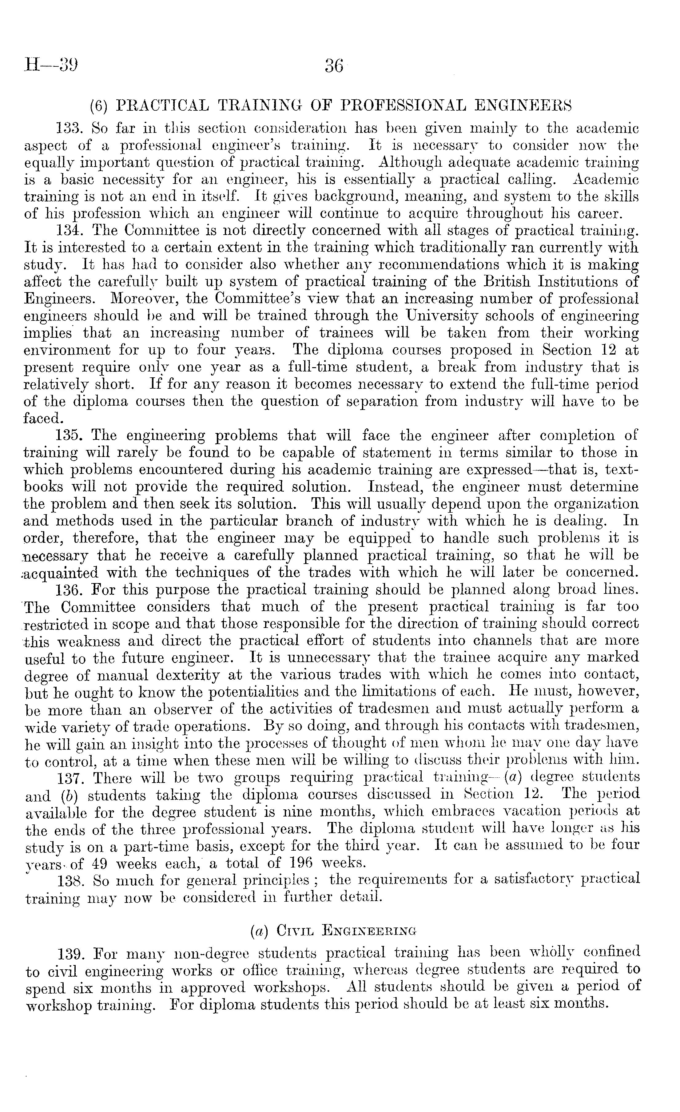 (6) PRACTICAL TRAINING OF PROFESSIONAL ENGINEERS 133. So far in this section consideration has been given mainly to the academic aspect of- a professional engineer's training. It is necessary to consider now the equally important question of practical training. Although adequate academic training is a basic necessity for an engineer, his is essentially a practical calling. Academic training is not an end in itself. It gives background, meaning, and system to the skills of his profession which an engineer will continue to acquire throughout his career. 134. The Committee is not directly concerned with all stages of practical training. It is interested to a certain extent in the training which traditionally ran currently with study. It has had to consider also whether any recommendations which it is making affect the carefully built up system of practical training of the British Institutions of Engineers. Moreover, the Committee's view that an increasing number of professional engineers should be and will be trained through the University schools of engineering implies that an increasing number of trainees will be taken from their working environment for up to four years. The diploma courses proposed in Section 12 at present require only one year as a full-time student, a break from industry that is relatively short. If for any reason it becomes necessary to extend the full-time period of the diploma courses then the question of separation from industry will have to be faced. 135. The engineering problems that will face the engineer after completion of training will rarely be found to be capable of statement in terms similar to those in which problems encountered during his academic training are expressed —that is, textbooks will not provide the required solution. Instead, the engineer must determine the problem and then seek its solution. This will usually depend upon the organization and methods used in the particular branch of industry with which he is dealing. In order, therefore, that the engineer may be equipped to handle such problems it is necessary that he receive a carefully planned practical training, so that he will be •acquainted with the techniques of the trades with which he will later be concerned. 136. For this purpose the practical training should be planned along broad lines. 'The Committee considers that much of the present practical training is far too restricted in scope and that those responsible for the direction of training should correct this weakness and direct the practical effort of students into channels that are more useful to the future engineer. It is unnecessary that the trainee acquire any marked degree of manual dexterity at the various trades with which he comes into contact, but he ought to know the potentialities and the limitations of each. He must, however, be more than an observer of the activities of tradesmen and must actually perform a wide variety of trade operations. By so doing, and through his contacts with tradesmen, he will gain an insight into the processes of thought of men whom he may one day have to control, at a time when these men will be willing to discuss their problems with him. 137. There will be two groups requiring practical training—(a) degree students and (b) students taking the diploma courses discussed in Section 12. The period available for the degree student is nine months, which embraces vacation periods at the ends of the three professional years. The diploma student will have longer as his study is on a part-time basis, except for the third year. It can be assumed to be four years-of 49 weeks each, a total of 196 weeks. 138. So much for general principles ; the requirements for a satisfactory practical training may now be considered in further detail. (a) Civil Engineering 139. For many non-degree students practical training has been wholly confined to civil engineering works or office training, whereas degree students are required to spend six months in approved workshops. All students should be given a period of workshop training. For diploma students this period should be at least six months.