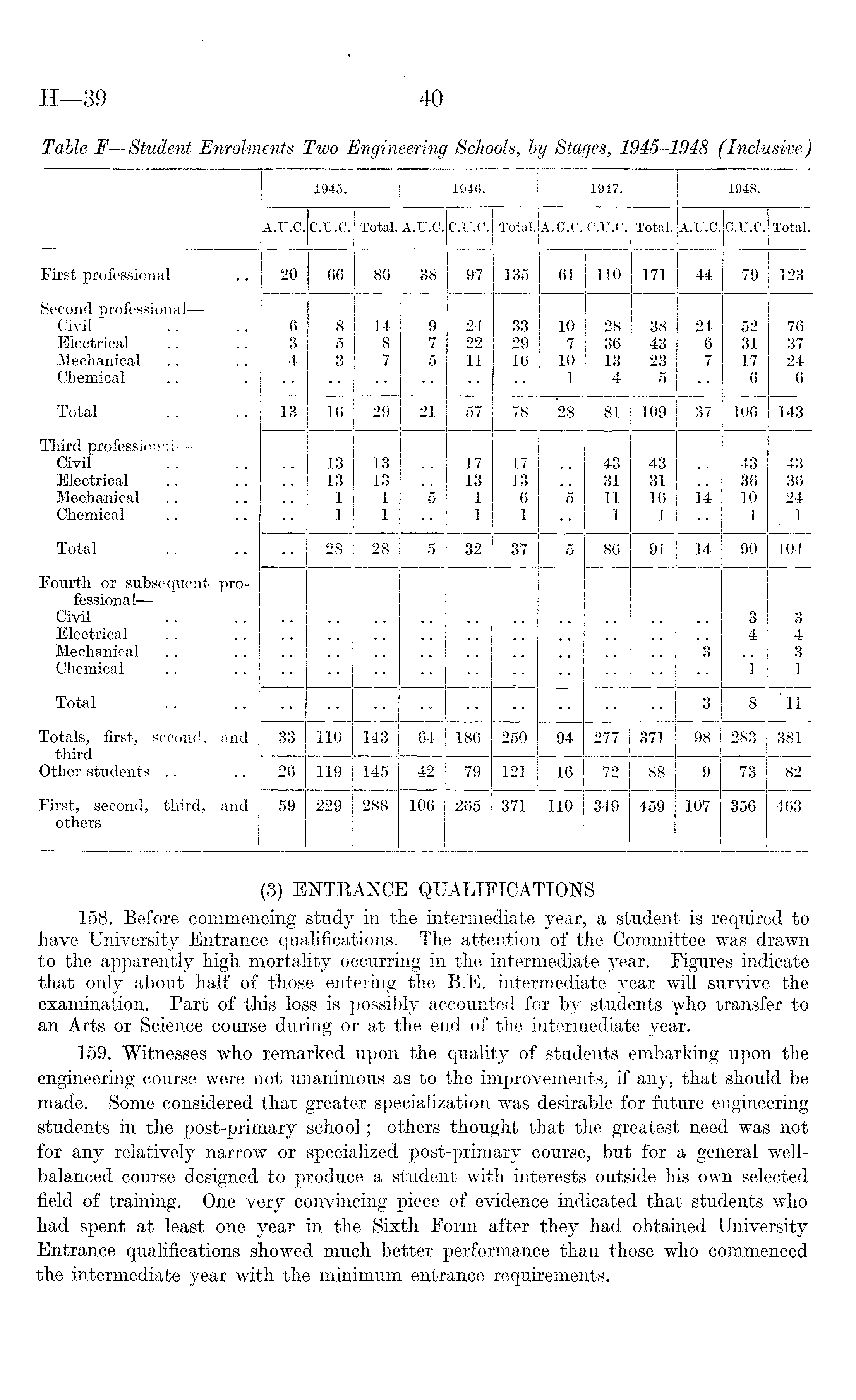Table F —Student Enrolments Two Engineering Schools, by Stages, 1945-1948 (Inclusive)