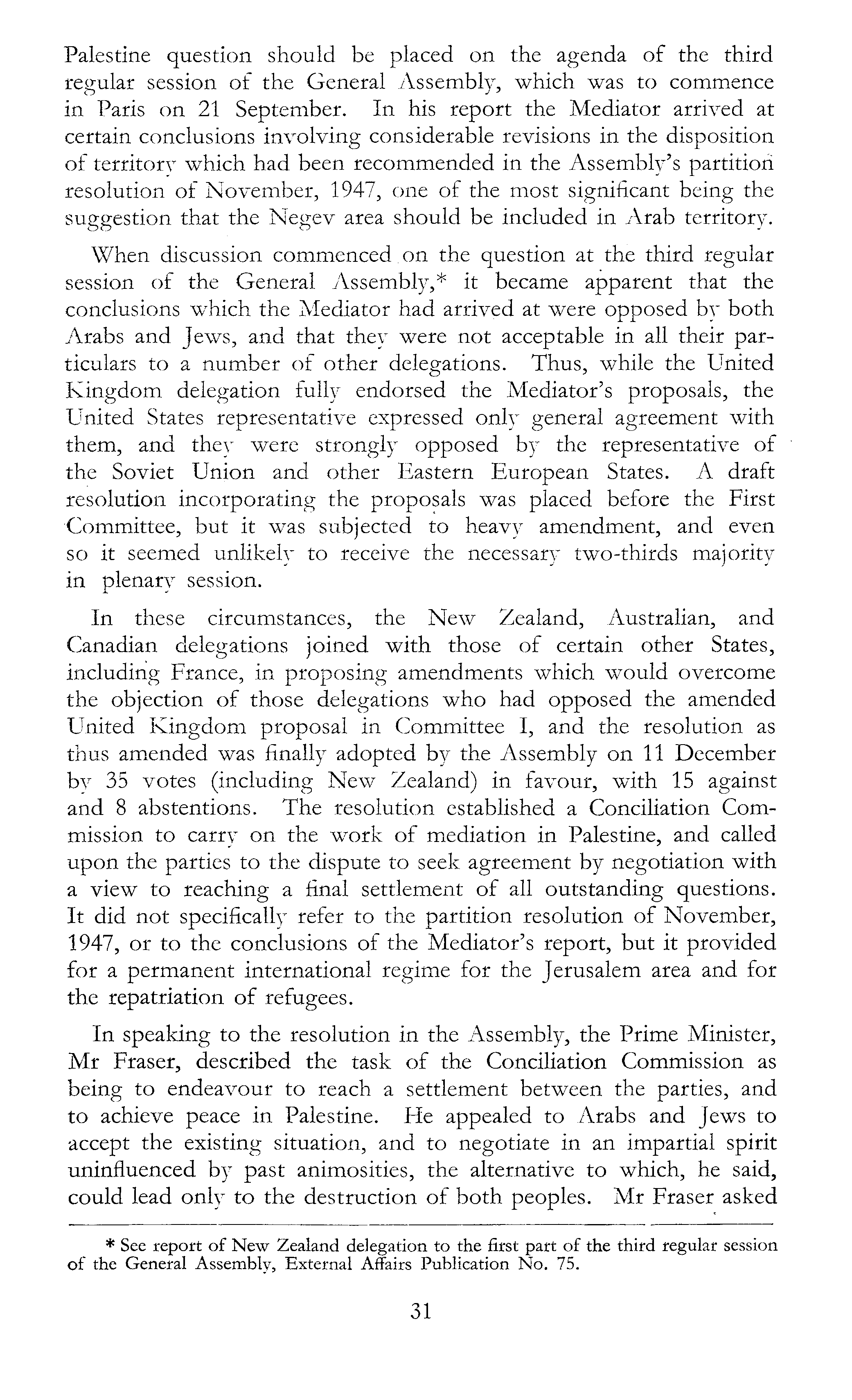 Palestine question should be placed on the agenda of the third regular session of the General Assembly, which was to commence in Paris on 21 September. In his report the Mediator arrived at certain conclusions involving considerable revisions in the disposition of territory which had been recommended in the Assembly's partition resolution of November, 1947, one of the most significant being the suggestion that the Negev area should be included in Arab territory. When discussion commenced ,on the question at the third regular session of the General Assembly,* it became apparent that the conclusions which the Mediator had arrived at were opposed by both Arabs and Jews, and that they were not acceptable in all their particulars to a number of other delegations. Thus, while the United Kingdom delegation fully endorsed the Mediator's proposals, the United. States representative expressed only general agreement with them, and they were strongly opposed by the representative of the Soviet Union and. other Eastern European States. A draft resolution incorporating the proposals was placed before the First Committee, but it was subjected to heavy amendment, and even so it seemed unlikely to receive the necessary two-thirds majority in plenary session. In these circumstances, the New Zealand, Australian, and Canadian delegations joined with those of certain other States, including France, in proposing amendments which would overcome the objection of those delegations who had opposed the amended United Kingdom proposal in Committee I, and the resolution as thus amended was finally adopted by the Assembly on 11 December by 35 votes (including New Zealand) in favour, with 15 against and 8 abstentions. The resolution established a Conciliation Commission to carry on the work of mediation in Palestine, and called upon the parties to the dispute to seek agreement by negotiation with a view to reaching a final settlement of all outstanding questions. It did not specifically refer to the partition resolution of November, 1947, or to the conclusions of the Mediator's report, but it provided for a permanent international regime for the Jerusalem area and for the repatriation of refugees. In speaking to the resolution in the Assembly, the Prime Minister, Mr Fraser, described the task of the Conciliation Commission as being to endeavour to reach a settlement between the parties, and to achieve peace in Palestine. He appealed to Arabs and Jews to accept the existing situation, and to negotiate in an impartial spirit uninfluenced by past animosities, the alternative to which, he said, could lead only to the destruction of both peoples. Mr Fraser asked