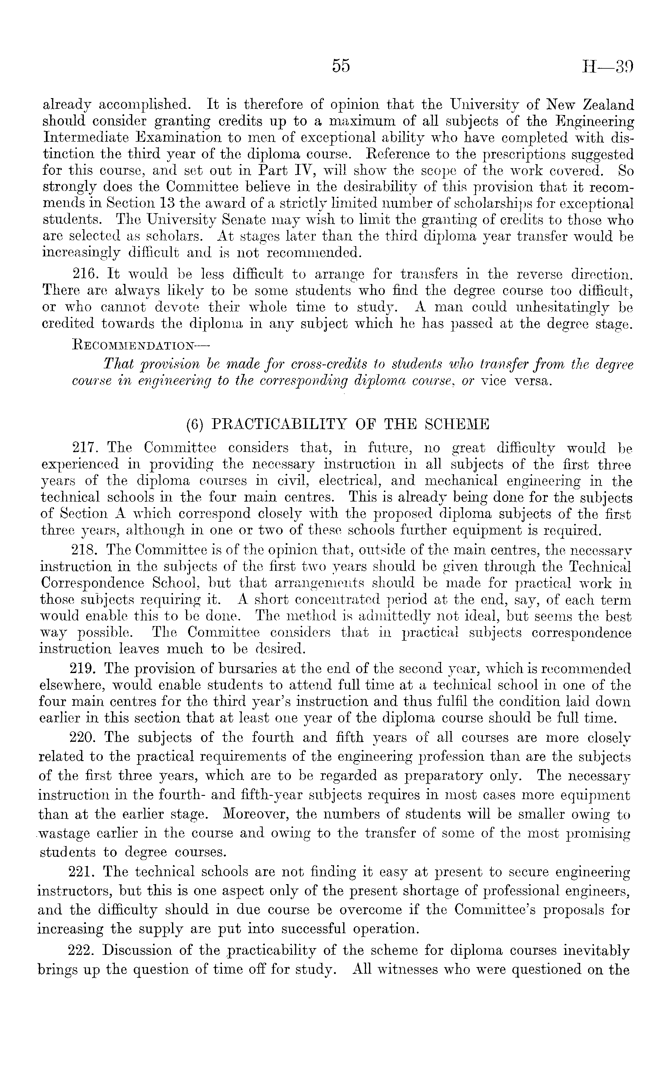 already accomplished. It is therefore of opinion that the University of New Zealand should consider granting credits up to a maximum of all subjects of the Engineering Intermediate Examination to men of exceptional ability who have completed with distinction the third year of the diploma course. Reference to the prescriptions suggested for this course, and set out in Part IV, will show the scope of the work covered. So strongly does the Committee believe in the desirability of this provision that it recommends in Section 13 the award of a strictly limited number of scholarships for exceptional students. The University Senate may wish to limit the granting of credits to those who are selected as scholars. At stages later than the third diploma year transfer would be increasingly difficult and is not recommended. 216. It would be less difficult to arrange for transfers in the reverse direction. There are always likely to be some students who find the degree course too difficult, or who cannot devote their whole time to study. A man could unhesitatingly be credited towards the diploma in any subject which he has passed at the degree stage. Recommendation— That provision be made for cross-credits to students who transfer from the degree course in engineering to the corresponding diploma course, or vice versa. (6) PRACTICABILITY OF THE SCHEME 217. The Committee considers that, in future, no great difficulty would be experienced in providing the necessary instruction in all subjects of the first three years of the diploma courses in civil, electrical, and mechanical engineering in the technical schools in the four main centres. This is already being done for the subjects of Section A which correspond closely with the proposed diploma subjects of the first three years, although in one or two of these schools further equipment is required. 218. The Committee is of the opinion that, outside of the main centres, the necessary instruction in the subjects of the first two years should be given through the Technical Correspondence School, but that arrangements should be made for practical work in those subjects requiring it. A short concentrated period at the end, say, of each term' would enable this to be done. The method is admittedly not ideal, but seems the best way possible. The Committee considers that in practical subjects correspondence instruction leaves much to be desired. 219. The provision of bursaries at the end of the second year, which is recommended elsewhere, would enable students to attend full time at a technical school in one of the four main centres for the third year's instruction and thus fulfil the condition laid down earlier in this section that at least one year of the diploma course should be full time. 220. The subjects of the fourth and fifth years of all courses are more closely related to the practical requirements of the engineering profession than are the subjects of the first three years, which are to be regarded as preparatory only. The necessary instruction in the fourth- and fifth-year subjects requires in most cases more equipment than at the earlier stage. Moreover, the numbers of students will be smaller owing to .wastage earlier in the course and owing to the transfer of some of the most promising students to degree courses. 221. The technical schools are not finding it easy at present to secure engineering instructors, but this is one aspect only of the present shortage of professional engineers, and the difficulty should in due course be overcome if the Committee's proposals for increasing the supply are put into successful operation. 222. Discussion of the of the scheme for diploma courses inevitably brings up the question of time off for study. All witnesses who were questioned on the