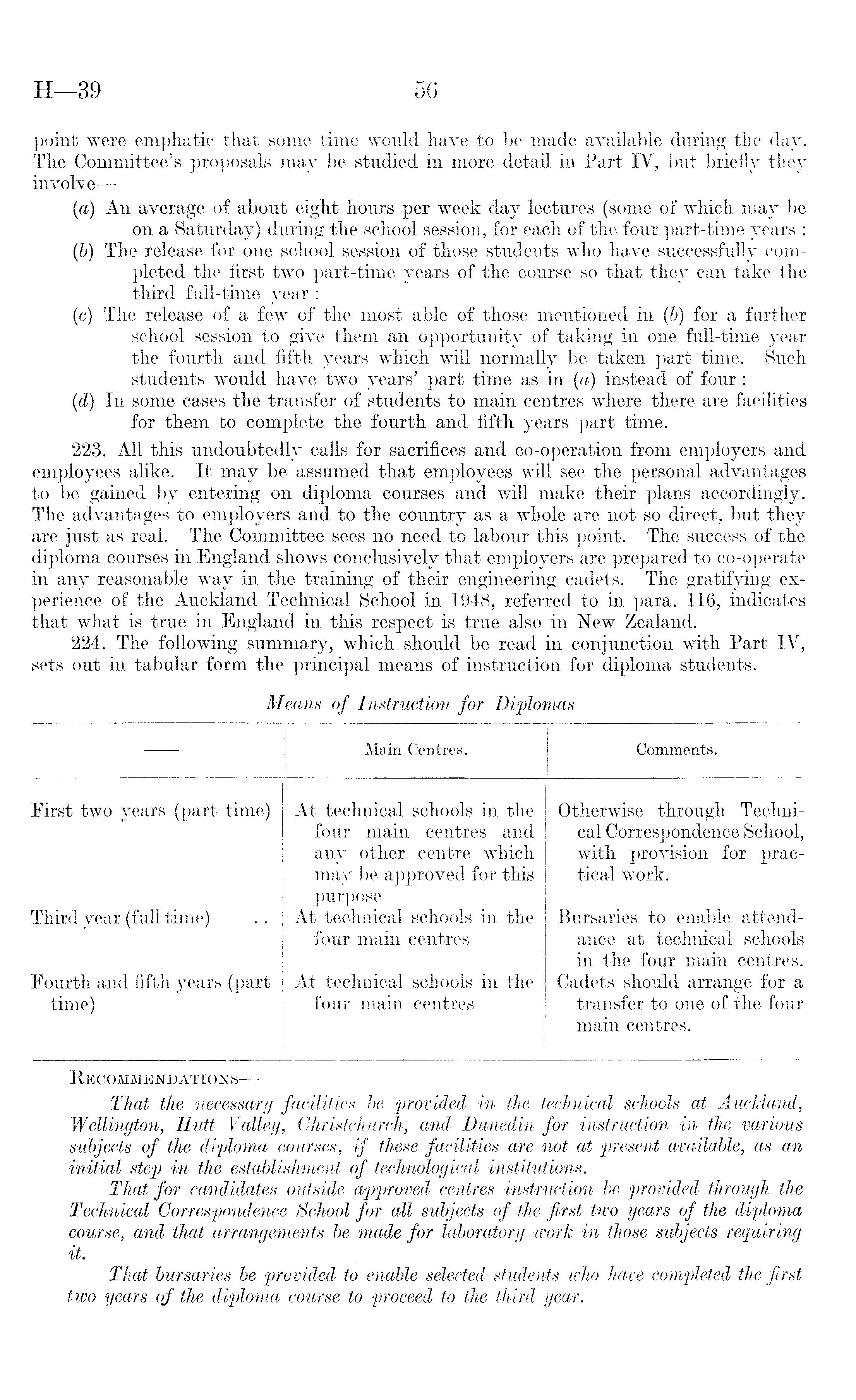 Recommendations — That the necessary facilities be provided in the technical schools at Auckland, Wellington, Hutt Valley, Christchurch, and Dunedin for instruction in the various subjects of the diploma courses, if these facilities are not at present available, as an initial step in the establishment of technological institutions. That for candidates outside approved centres instruction be provided through the Technical Correspondence School for all subjects of the first two years of the diploma course, and that arrangements be made for laboratory work in those subjects requiring it. That bursaries be provided to enable selected students who have completed the first two years of the diploma course to proceed to the third year.