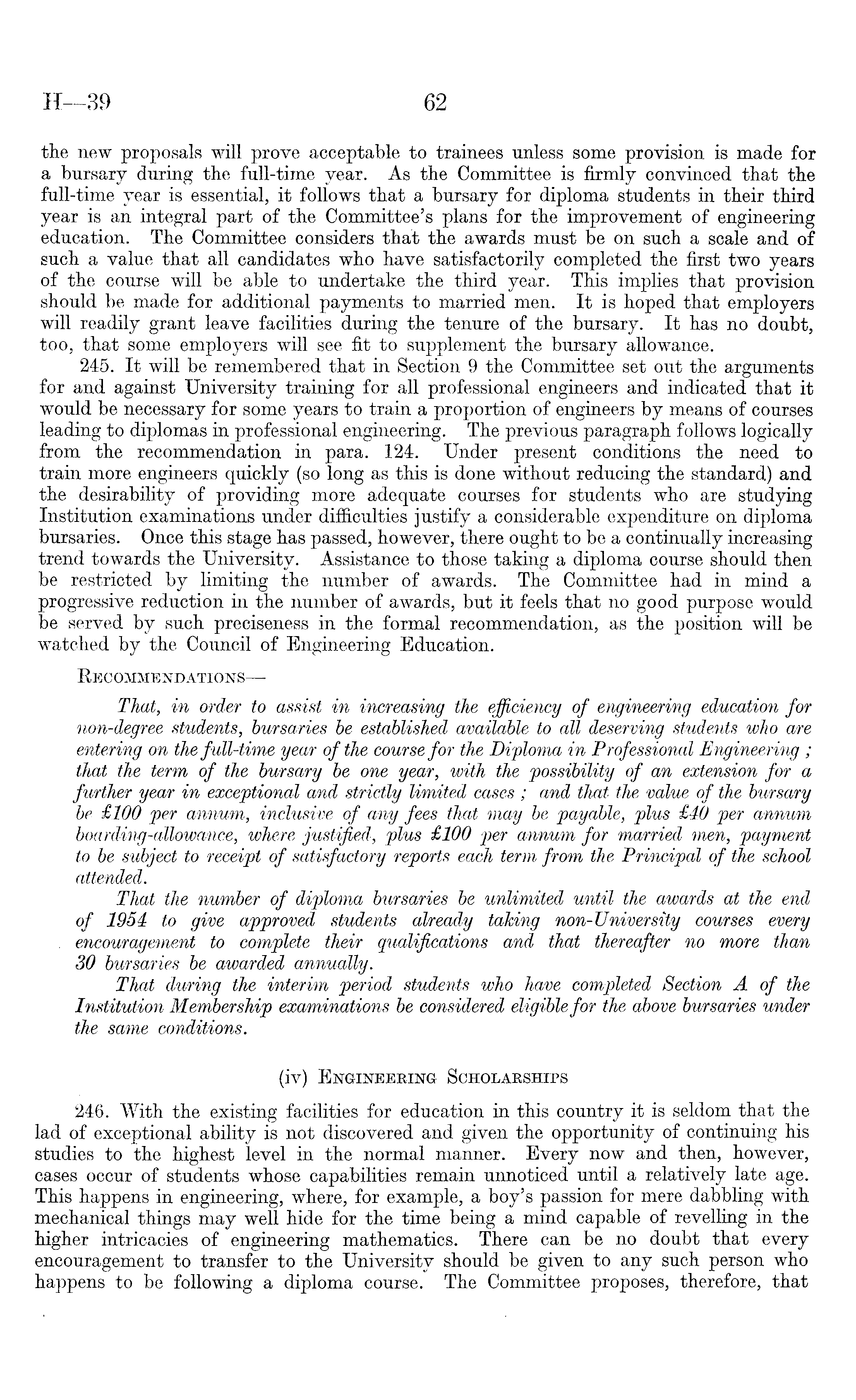 the new proposals will prove acceptable to trainees unless some provision is made for a bursary during the full-time year. As the Committee is firmly convinced that the full-time year is essential, it follows that a bursary for diploma students in their third year is an integral part of the Committee's plans for the improvement of engineering education. The Committee considers that the awards must be on such a scale and of such a value that all candidates who have satisfactorily completed the first two years of the course will be able to undertake the third year. This implies that provision should be made for additional payments to married men. It is hoped that employers will readily grant leave facilities during the tenure of the bursary. It has no doubt, too, that some employers will see fit to supplement the bursary allowance. 245. It will be remembered that in Section 9 the Committee set out the arguments for and against University training for all professional engineers and indicated that it would be necessary for some years to train a proportion of engineers by means of courses leading to diplomas in professional engineering. The previous paragraph follows logically from the recommendation in para. 124. Under present conditions the need to train more engineers quickly (so long as this is done without reducing the standard) and the desirability of providing more adequate courses for students who are studying Institution examinations under difficulties justify a considerable expenditure on diploma bursaries. Once this stage has passed, however, there ought to be a continually increasing trend towards the University. Assistance to those taking a diploma course should then be restricted by limiting the number of awards. The Committee had in mind a progressive reduction in the number of awards, but it feels that no good purpose would be served by such preciseness in the formal recommendation, as the position will be watched by the Council of Engineering Education. Recommendations— That, in order to assist in increasing the efficiency of engineering education for non-degree students, bursaries be established available to all deserving students who are entering on the full-time year of the course for the Diploma in Professional Engineering ; that the term of the bursary be one year, with the possibility of an extension for a further year in exceptional and strictly limited cases ; and that the value of the bursary be £lOO per annum, inclusive of any fees that may be payable, plus £4O per annum boarding-allowance, where justified, plus £lOO per annum for married men, payment to be subject to receipt of satisfactory reports each term from the Principal of the school attended. That the number of diploma bursaries be unlimited until the awards at the end of 1954 to give approved students already taking non-University courses every . encouragement to complete their qualifications and that thereafter no more than 30 bursaries be awarded annually. That during the interim period students who have completed Section A of the Institution Membership examinations be considered eligible for the above bursaries under the same conditions. (iv) Engineering Scholarships 246. With the existing facilities for education in this country it is seldom that the lad of exceptional ability is not discovered and given the opportunity of continuing his studies to the highest level in the normal manner. Every now and then, however, cases occur of students whose capabilities remain unnoticed until a relatively late age. This happens in engineering, where, for example, a boy's passion for mere dabbling with mechanical things may well hide for the time being a mind capable of revelling in the higher intricacies of engineering mathematics. There can be no doubt that every encouragement to transfer to the University should be given to any such person who happens to be following a diploma course. The Committee proposes, therefore, that