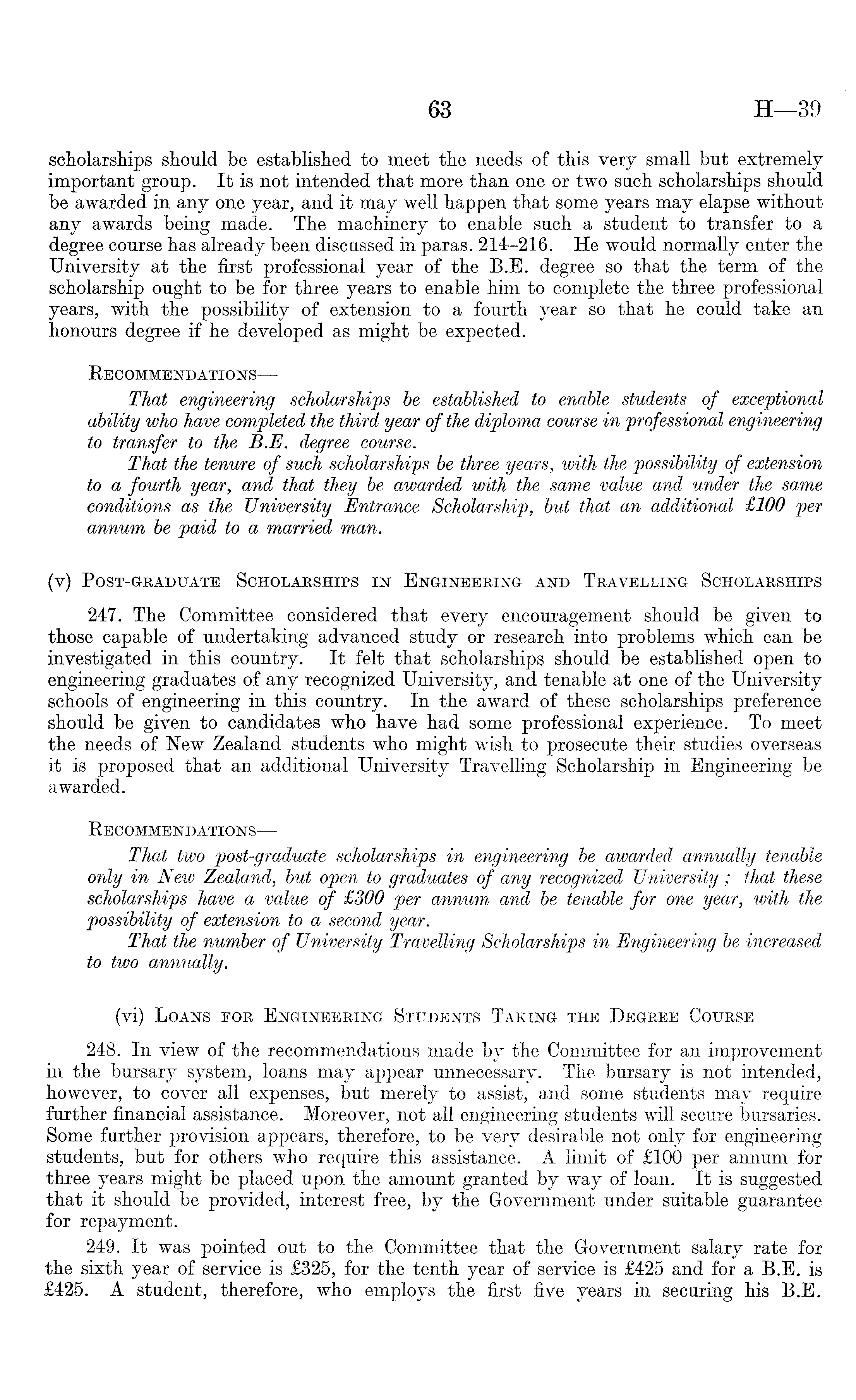 scholarships should be established to meet the needs of this very small but extremely important group. It is not intended that more than one or two such scholarships should be awarded in any one year, and it may well happen that some years may elapse without any awards being made. The machinery to enable such a student to transfer to a degree course has already been discussed in paras. 214-216. He would normally enter the University at the first professional year of the B.E. degree so that the term of the scholarship ought to be for three years to enable him to complete the three professional years, with the possibility of extension to a fourth year so that he could take an honours degree if he developed as might be expected. Recommendations — That engineering scholarships be established to enable students of exceptional ability who have completed the third year of the diploma course in professional engineering to transfer to the B.E. degree course. That the tenure of such scholarships be three years, with the possibility of extension to a fourth year, and that they be awarded with the same value and under the same conditions as the University Entrance Scholarship, but that an additional £lOO per annum be paid to a married man. (v) Post-graduate Scholarships in Engineering and Travelling Scholarships 247. The Committee considered that every encouragement should be given to those capable of undertaking advanced study or research into problems which can be investigated in this country. It felt that scholarships should be established open to engineering graduates of any recognized University, and tenable at one of the University schools of engineering in this country. In the award of these scholarships preference should be given to candidates who have had some professional experience. To meet the needs of New Zealand students who might wish to prosecute their studies overseas it is proposed that an additional University Travelling Scholarship in Engineering be awarded. Recommendations — That two post-graduate scholarships in engineering be awarded annually tenable only in New Zealand, but open to graduates of any recognized University; that these scholarships have a value of £3OO per annum and be tenable for one year, with the possibility of extension to a second year. That the number of University Travelling Scholarships in Engineering be increased to two annually. (vi) Loans for Engineering Students Taking the Degree Course 248. In view of the recommendations made by the Committee for an improvement in the bursary system, loans may appear unnecessary. The bursary is not intended, however, to cover all expenses, but merely to assist, and some students may require further financial assistance. Moreover., not all engineering students will secure bursaries. Some further provision appears, therefore, to be very desirable not only for engineering students, but for others who require this assistance. A limit of £lOO per annum for three years might be placed upon the amount granted by way of loan. It is suggested that it should be provided, interest free, by the Government under suitable guarantee for repayment. 249. It was pointed out to the Committee that the Government salary rate for the sixth year of service is £325, for the tenth year of service is £425 and for a B.E. is £425. A student, therefore, who employs the first five years in securing his B.E.