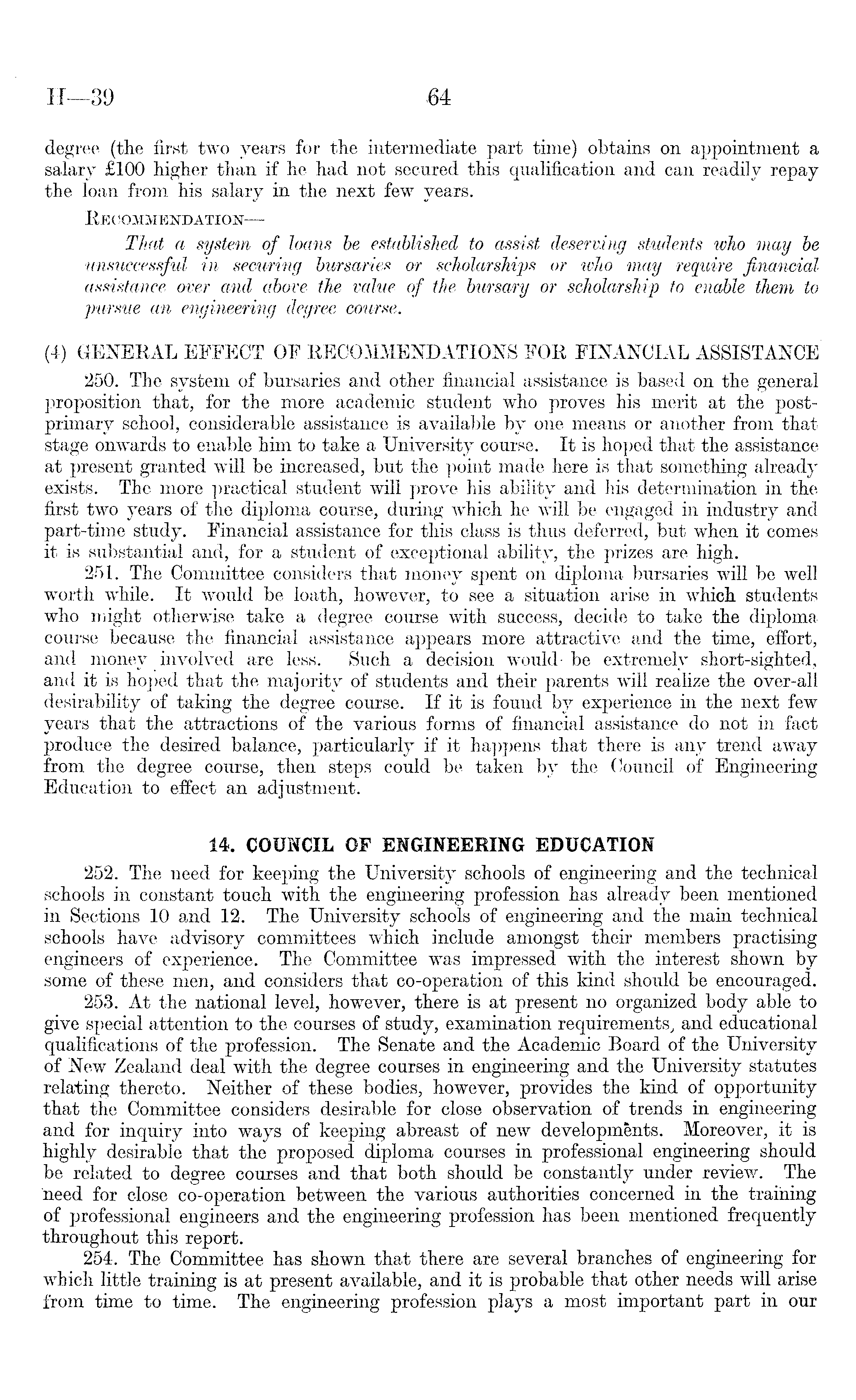 degree (the first two years for the intermediate part time) obtains on appointment a salary £lOO higher than if he had not secured this qualification and can readily repay the loan from his salary in the next few years. Recommendation— That a system of loans be established to assist deserving students who may be unsuccessful in securing bursaries or scholarships or ivho may require financial assistance over and above the value of the bursary or scholarship to enable them to jpursue an engineering degree course. (4) GENERAL EFFECT OF RECOMMENDATIONS FOR FINANCIAL ASSISTANCE 250. The system of bursaries and other financial assistance is based on the general proposition that, for the more academic student who proves his merit at the postprimary school, considerable assistance is available by one means or another from that stage onwards to enable him to take a University course. It is hoped that the assistance at present granted will be increased, but the point made here is that something already exists. The more practical student will prove his ability and his determination in the first two years of the diploma course, during which he will be engaged in industry and part-time study. Financial assistance for this class is thus deferred, but when it comes it is substantial and, for a student of exceptional ability, the prizes are high. 251. The Committee considers that money spent on diploma bursaries will be well worth while. It would be loath, however, to see a situation arise in which students who might otherwise take a degree course with success, decide to take the diploma course because the financial assistance appears more attractive and the time, effort, and money involved are less. Such a decision would be extremely short-sighted, and it is hoped that the majority of students and their parents will realize the over-all desirability of taking the degree course. If it is found by experience in the next few years that the attractions of the various forms of financial assistance do not in fact produce the desired balance, particularly if it happens that there is any trend away from the degree course, then steps could be taken by the Council of Engineering Education to effect an adjustment. 14. COUNCIL OF ENGINEERING EDUCATION 252. The need for keeping the University schools of engineering and the technical schools in constant touch with the engineering profession has already been mentioned in Sections 10 and 12. The University schools of engineering and the main technical schools have advisory committees which include amongst their members practising engineers of experience. The Committee was impressed with the interest shown by some of these men, and considers that co-operation of this kind should be encouraged. 253. At the national level, however, there is at present no organized body able to give special attention to the courses of study, examination requirements, and educational qualifications of the profession. The Senate and the Academic Board of the University of New Zealand deal with the degree courses in engineering and the University statutes relating thereto. Neither of these bodies, however, provides the kind of opportunity that the Committee considers desirable for close observation of trends in engineering and for inquiry into ways of keeping abreast of new developments. Moreover, it is highly desirable that the proposed diploma courses in professional engineering should be related to degree courses and that both should be constantly under review. The need for close co-operation between the various authorities concerned in the training of professional engineers and the engineering profession has been mentioned frequently throughout this report. 254. The Committee has shown that there are several branches of engineering for which little training is at present available, and it is probable that other needs will arise from time to time. The engineering profession plays a most important part in our