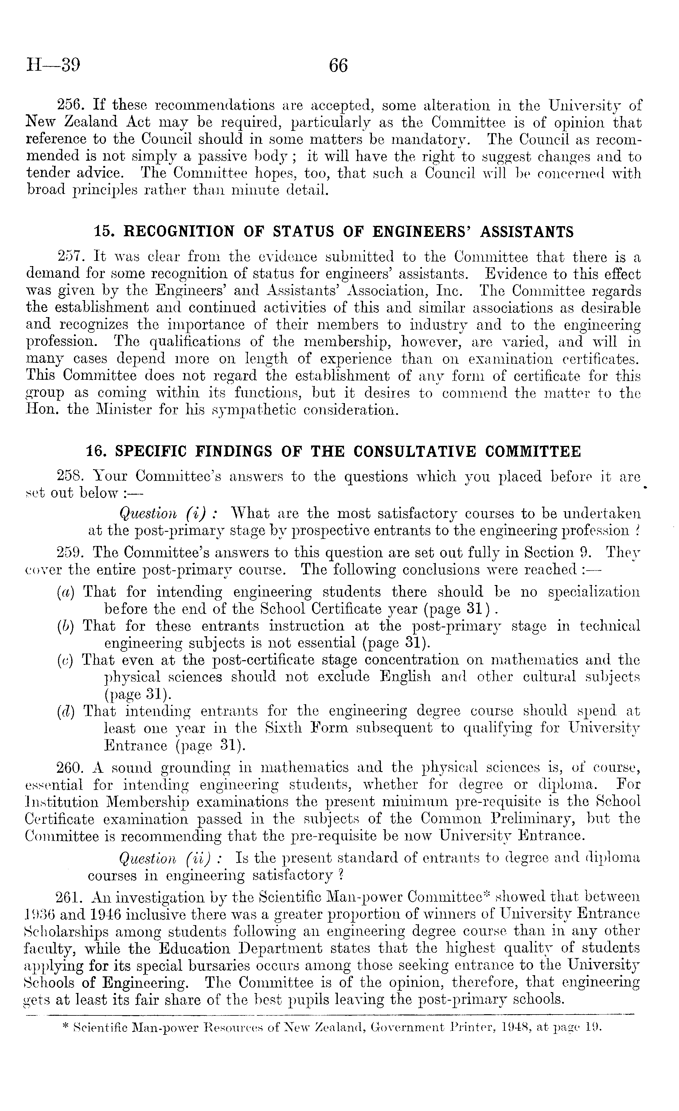 256. If these recommendations are accepted, some alteration in the University of New Zealand Act may be required, particularly as the Committee is of opinion that reference to the Council should in some matters be mandatory. The Council as recommended is riot simply a passive body; it will have the right to suggest changes and to tender advice. The Committee hopes, too, that such a Council will be concerned with broad principles rather than minute detail. 15. RECOGNITION OF STATUS OF ENGINEERS' ASSISTANTS 257. It was clear from the evidence submitted to the Committee that there is a demand for some recognition of status for engineers' assistants. Evidence to this effect was given by the Engineers' and Assistants' Association, Inc. The Committee regards the establishment and continued activities of this and similar associations as desirable and recognizes the importance of their members to industry and to the engineering profession. The qualifications of the membership, however, are varied, and will in many cases depend more on length of experience than on examination certificates. This Committee does not regard the establishment of any form of certificate for this group as coming within its functions, but it desires to commend the matter to the Hon. the Minister for his sympathetic consideration. 16. SPECIFIC FINDINGS OF THE CONSULTATIVE COMMITTEE 258. Your Committee's answers to the questions which you placed before it are set out below : Question (i) : What are the most satisfactory courses to be undertaken at the post-primary stage by prospective entrants to the engineering profession ? 259. The Committee's answers to this question are set out fully in Section 9. They cover the entire post-primary course. The following conclusions were reached: — (a) That for intending engineering students there should be no specialization before the end of the School Certificate year (page 31). (b) That for these entrants instruction at the post-primary stage in technical engineering subjects is not essential (page 31). (c) That even at the post-certificate stage concentration on mathematics and the physical sciences should not exclude English and other cultural subjects (page 31). (d) That intending entrants for the engineering degree course should spend at least one year in the Sixth Form subsequent to qualifying for University Entrance (page 31). 260. A sound grounding in mathematics and the physical sciences is, of course, essential for intending engineering students, whether for degree or diploma. For Institution Membership examinations the present minimum pre-requisite is the School Certificate examination passed in the subjects of the Common Preliminary, but the Committee is recommending that the pre-requisite be now University Entrance. Question (ii) : Is the present standard of entrants to degree and diploma courses in engineering satisfactory ? 261. An investigation by the Scientific Man-power Committee* showed that between 1936 and 1946 inclusive there was a greater proportion of winners of University Entrance Scholarships among students following an engineering degree course than in any other faculty, while the Education Department states that the highest quality of students applying for its special bursaries occurs among those seeking entrance to the University Schools of Engineering. The Committee is of the opinion, therefore, that engineering gets at least its fair share of the best pupils leaving the post-primary schools.