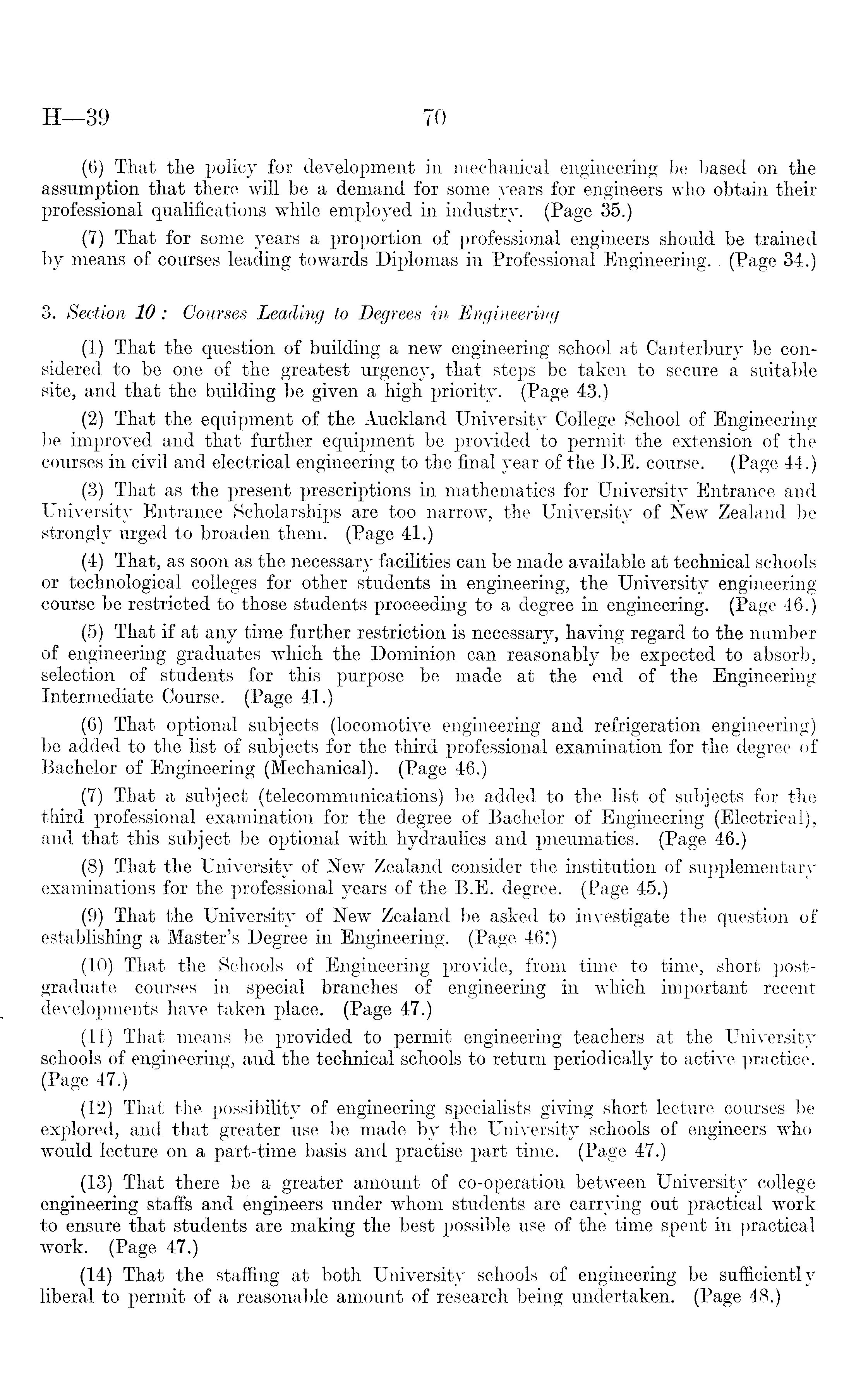 (6) That the policy for development in mechanical engineering be based on the assumption that there will be a demand for some years for engineers who obtain their professional qualifications while employed in industry. (Page 35.) (7) That for some years a proportion of professional engineers should be trained by means of courses leading towards Diplomas in Professional Engineering. . (Page 34.) 3. Section 10: Courses Leading to Degrees in Engineering (1) That the question of building a new engineering school at Canterbury be considered to be one of the greatest urgency, that steps be taken to secure a suitable site, and that the building be given a high priority. (Page 43.) (2) That the equipment of the Auckland University College School of Engineering be improved and that further equipment be provided to permit the extension of the courses in civil and electrical engineering to the final year of the B.E. course. (Page 44.) (3) That as the present prescriptions in mathematics for University Entrance and University Entrance Scholarships are too narrow, the University of New Zealand be strongly urged to broaden them. (Page 41.) (4) That, as soon as the necessary facilities can be made available at technical schools or technological colleges for other students in engineering, the University engineering course be restricted to those students proceeding to a degree in engineering. (Page 46.) (5) That if at any time further restriction is necessary, having regard to the number of engineering graduates which the Dominion can reasonably be expected to absorb, selection of students for this purpose be made at the end of the Engineering Intermediate Course. (Page 41.) (6) That optional subjects (locomotive engineering and refrigeration engineering) be added to the list of subjects for the third professional examination for the degree of Bachelor of Engineering (Mechanical). (Page 46.) (7) That a subject (telecommunications) be added to the list of subjects for the third professional examination for the degree of Bachelor of Engineering (Electrical), and that this subject be optional with hydraulics and pneumatics. (Page 46.) (8) That the University of New Zealand consider the institution of supplementary examinations for the professional years of the B.E. degree. (Page 45.) (9) That the University of New Zealand be asked to investigate the question of establishing a Master's Degree in Engineering. (Page 46?) (10) That the Schools of Engineering provide, from time to time, short postgraduate courses in special branches of engineering in which important recent developments have taken place. (Page 47.) (11) That means be provided to permit engineering teachers at the University schools of engineering, and the technical schools to return periodically to active practice. (Page 47.) (12) That the possibility of engineering specialists giving short lecture courses be explored, and that greater use be made by the University schools of engineers who would lecture on a part-time basis and practise part time. (Page 47.) (13) That there be a greater amount of co-operation between University college engineering staffs and engineers under whom students are carrying out practical work to ensure that students are making the best possible use of the time spent in practical work. (Page 47.) (14) That the staffing at both University schools of engineering be sufficiently liberal to permit of a reasonable amount of research being undertaken. (Page 48.)