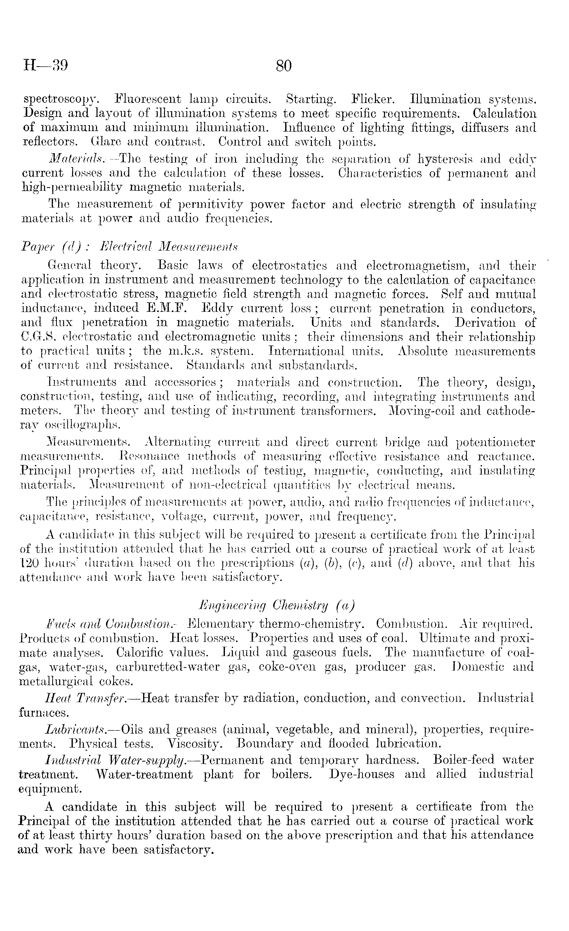 spectroscopy. Fluorescent lamp circuits. Starting. Flicker. Illumination systems. Design and layout of illumination systems to meet specific requirements. Calculation of maximum and minimum illumination. Influence of lighting fittings, diffusers and reflectors. Glare and contrast. Control and switch points. Materials. —The testing of iron including the separation of hysteresis and eddy current losses and the calculation of these losses. Characteristics of permanent and high-permeability magnetic materials. The measurement of permitivity power factor and electric strength of insulating materials at power and audio frequencies. Paper (d) : Electrical Measurements General theory. Basic laws of electrostatics and electromagnetism, and their application in instrument and measurement technology to the calculation of capacitance and electrostatic stress, magnetic field strength and magnetic forces. Self and mutual inductance, induced E.M.F. Eddy current loss ; current penetration in conductors, and flux penetration in magnetic materials. Units and standards. Derivation of C.G.S. electrostatic and electromagnetic units ; their dimensions and their relationship to practical units; the m.k.s. system. International units. Absolute measurements of current and resistance. Standards and substandards. Instruments and accessories; materials and construction. The theory, design, construction, testing, and use of indicating, recording, and integrating instruments and meters. The theory and testing of instrument transformers. Moving-coil and cathoderay oscillographs. Measurements. Alternating current and direct current bridge and potentiometer measurements. Resonance methods of measuring effective resistance and reactance. Principal properties of, and methods of testing, magnetic, conducting, and insulating materials. Measurement of non-electrical quantities by electrical means. The principles of measurements at power, audio, and radio frequencies of inductance, capacitance, resistance, voltage, current, power, and frequency. A candidate in this subject will be required to present a certificate from the Principal of the institution attended that he has carried out a course of practical work of at least 120 hours' duration based on the prescriptions (a), (b), (c), and (d) above, and that his attendance and work have been satisfactory. Engineering Chemistry (a) Fuels and Combustion. —Elementary thermo-chemistry. Combustion. Air required. Products of combustion. Heat losses. Properties and uses of coal. Ultimate and proximate analyses. Calorific values. Liquid and gaseous fuels. The manufacture of coalgas, water-gas, carburetted-water gas, coke-oven gas, producer gas. Domestic and metallurgical cokes. Heat Transfer. —Heat transfer by radiation, conduction, and convection. Industrial furnaces. Lubricants. —Oils and greases (animal, vegetable, and mineral), properties, requirements. Physical tests. Viscosity. Boundary and flooded lubrication. Industrial Water-supply.—Permanent and temporary hardness. Boiler-feed water treatment. Water-treatment plant for boilers. Dye-houses and allied industrial equipment. A candidate in this subject will be required to present a certificate from the Principal of the institution attended that he has carried out a course of practical work of at least thirty hours' duration based on the above prescription and that his attendance and work have been satisfactory.