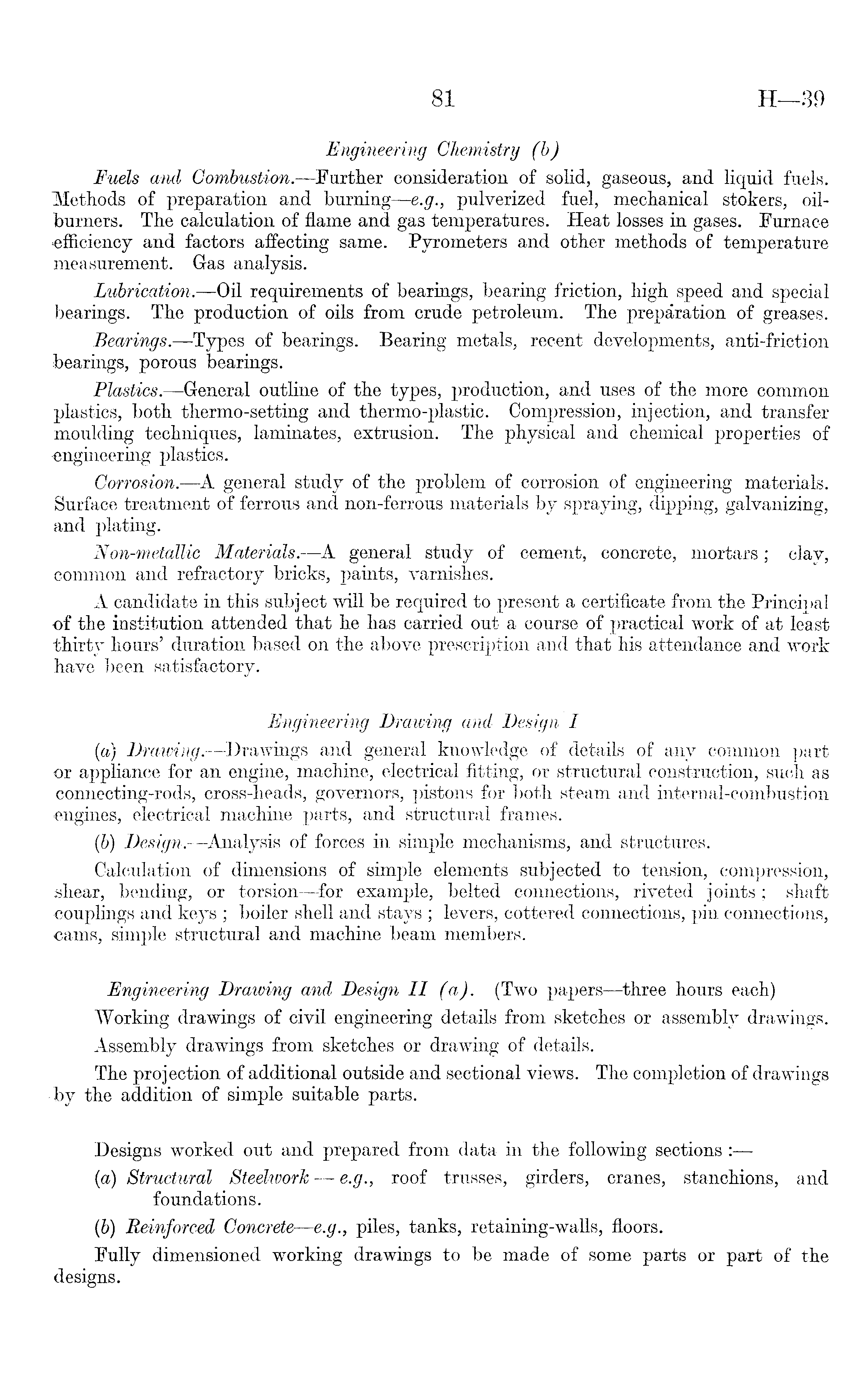 Engineering Chemistry (b) Fuels and Combustion. —Further consideration of solid, gaseous, and liquid fuels. Methods of preparation and burning—e.g., pulverized fuel, mechanical stokers, oilburners. The calculation of flame and gas temperatures. Heat losses in gases. Furnace ■efficiency and factors affecting same. Pyrometers and other methods of temperature measurement. Gas analysis. Lubrication. —Oil requirements of bearings, bearing friction, high speed and special bearings. The production of oils from crude petroleum. The preparation of greases. Bearings.—Types of bearings. Bearing metals, recent developments, anti-friction bearings, porous bearings. Plastics.—General outline of the types, production, and uses of the more common plastics, both thermo-setting and thermo-plastic. Compression, injection, and transfer moulding techniques, laminates, extrusion. The physical and chemical properties of •engineering plastics. Corrosion. —A general study of the problem of corrosion of engineering materials. Surface treatment of ferrous and non-ferrous materials by spraying, dipping, galvanizing, and plating. Non-metallic Materials.—A general study of cement, concrete, mortars; clay, common and refractory bricks, paints, varnishes. A candidate in this subject will be required to present a certificate from the Principal of the institution attended that he has carried out a course of practical work of at least thirty hours' duration based on the above prescription and that his attendance and work have been satisfactory. Engineering Drawing and Design I (a) Drawing. —Drawings and general knowledge of details of any common part or appliance for an engine, machine, electrical fitting, or structural construction, such as connecting-rods, cross-heads, governors, pistons for both steam and internal-combustion engines, electrical machine parts, and structural frames. (b) Design.—Analysis of forces in simple mechanisms, and structures. Calculation of dimensions of simple elements subjected to tension, compression, shear, bending, or torsion—for example, belted connections, riveted joints; shaft couplings and keys ; boiler shell and stays ; levers, cottered connections, pin connections, cams, simple structural and machine beam members. Engineering Drawing and Design II (a). (Two papers —three hours each) Working drawings of civil engineering details from sketches or assembly drawings. Assembly drawings from sketches or drawing of details. The projection of additional outside and sectional views. The completion of drawings -by the addition of simple suitable parts. Designs worked out and prepared from data in the following sections : {a) Structural Steelwork e.g., roof trusses, girders, cranes, stanchions, and foundations. (6) Reinforced Concrete —e.g., piles, tanks, retaining-walls, floors. Fully dimensioned working drawings to be made of some parts or part of the designs.