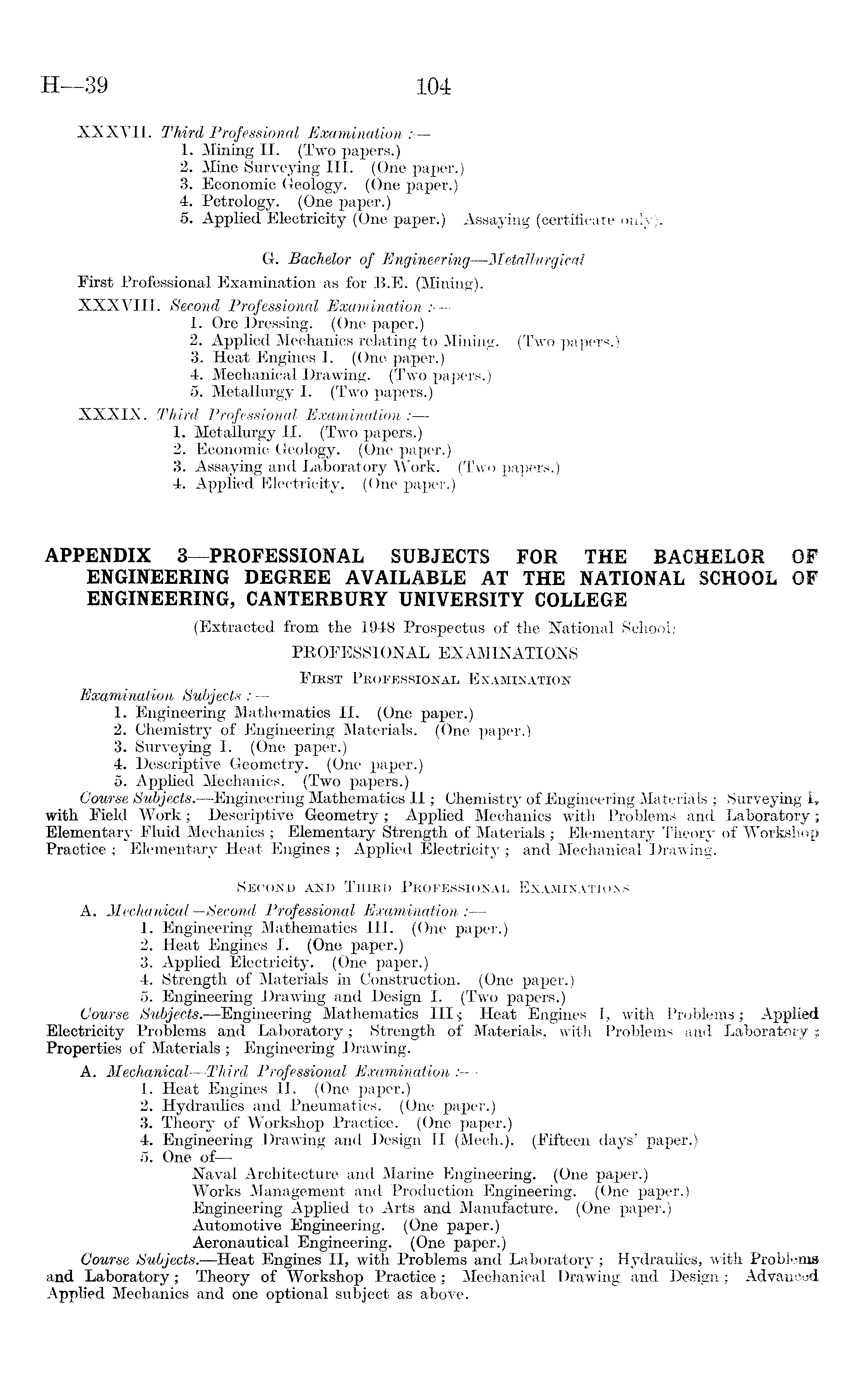XXXVII. Third Professional Examination : 1. Mining 11. (Two papers.) 2. Mine Surveying 111. (One paper.) 3. Economic Geology. (One paper.) 4. Petrology. (One paper.) 5. Applied Electricity (One paper.) Assaying (certificate only). G. Bachelor of Engineering—Metallurgical First Professional Examination as for B.E. (Mining). XXXVIII. Second Professional Examination : 1. Ore Dressing. (One paper.) 2. Applied Mechanics relating to Mining. (Two papers.) 3. Heat Engines I. (One paper.) 4. Mechanical Drawing. (Two papers.) 5. Metallurgy I. (Two papers.) XXXIX. Third Professional Examination : 1. Metallurgy 11. (Two papers.) 2. Economic Geology. (One paper.) 3. Assaying and Laboratory Work. (Two papers.) 4. Applied Electricity. (One paper.) APPENDIX 3—PROFESSIONAL SUBJECTS FOR THE BACHELOR OF ENGINEERING DEGREE AVAILABLE AT THE NATIONAL SCHOOL OF ENGINEERING, CANTERBURY UNIVERSITY COLLEGE (Extracted from the 1948 Prospectus of the National School) PROFESSIONAL EXAMINATIONS First Professional Examination Examination Subjects : 1. Engineering Mathematics 11. (One paper.) 2. Chemistry of Engineering Materials. (One paper.) 3. Surveying I. (One paper.) 4. Descriptive Geometry. (One paper.) 5. Applied Mechanics. (Two papers.) Course Subjects.—Engineering Mathematics II; Chemistry of Engineering Materials ; Surveying I, with Field Work; Descriptive Geometry; Applied Mechanics with Problems and Laboratory; Elementary Fluid Mechanics ; Elementary Strength of Materials ; Elementary Theory of Workshop Practice ; Elementary Heat Engines ; Applied Electricity ; and Mechanical Drawing. Second and Third Professional Examinations A. Mechanical —Second Professional Examination : 1. Engineering Mathematics 111. (One paper.) 2. Heat Engines I. (One paper.) 3. Apjflied Electricity. (One paper.) 4. Strength of Materials in Construction. (One paper.) 5. Engineering Drawing and Design I. (Two papers.) Course Subjects.—Engineering Mathematics 111 >; Heat Engines I, with Problems; Applied Electricity Problems and Laboratory; Strength of Materials, with Problems and Laboratory ; Properties of Materials ; Engineering Drawing. A. Mechanical —Third Professional Examination : 1. Heat Engines 11. (One paper.) 2. Hydraulics and Pneumatics. (One paper.) 3. Theory of Workshop Practice. (One paper.) 4. Engineering Drawing and Design II (Mech.). (Fifteen days' paper.) 5. One of— Naval Architecture and Marine Engineering. (One paper.) Works Management and Production Engineering. (One paper.) Engineering Applied to Arts and Manufacture. (One paper.) Automotive Engineering. (One paper.) Aeronautical Engineering. (One paper.) Course Subjects.—Heat Engines 11, with Problems and Laboratory; Hydraulics, with Problems and Laboratory; Theory of Workshop Practice ; Mechanical Drawing and Design ; Advanced Applied Mechanics and one optional subject as above.