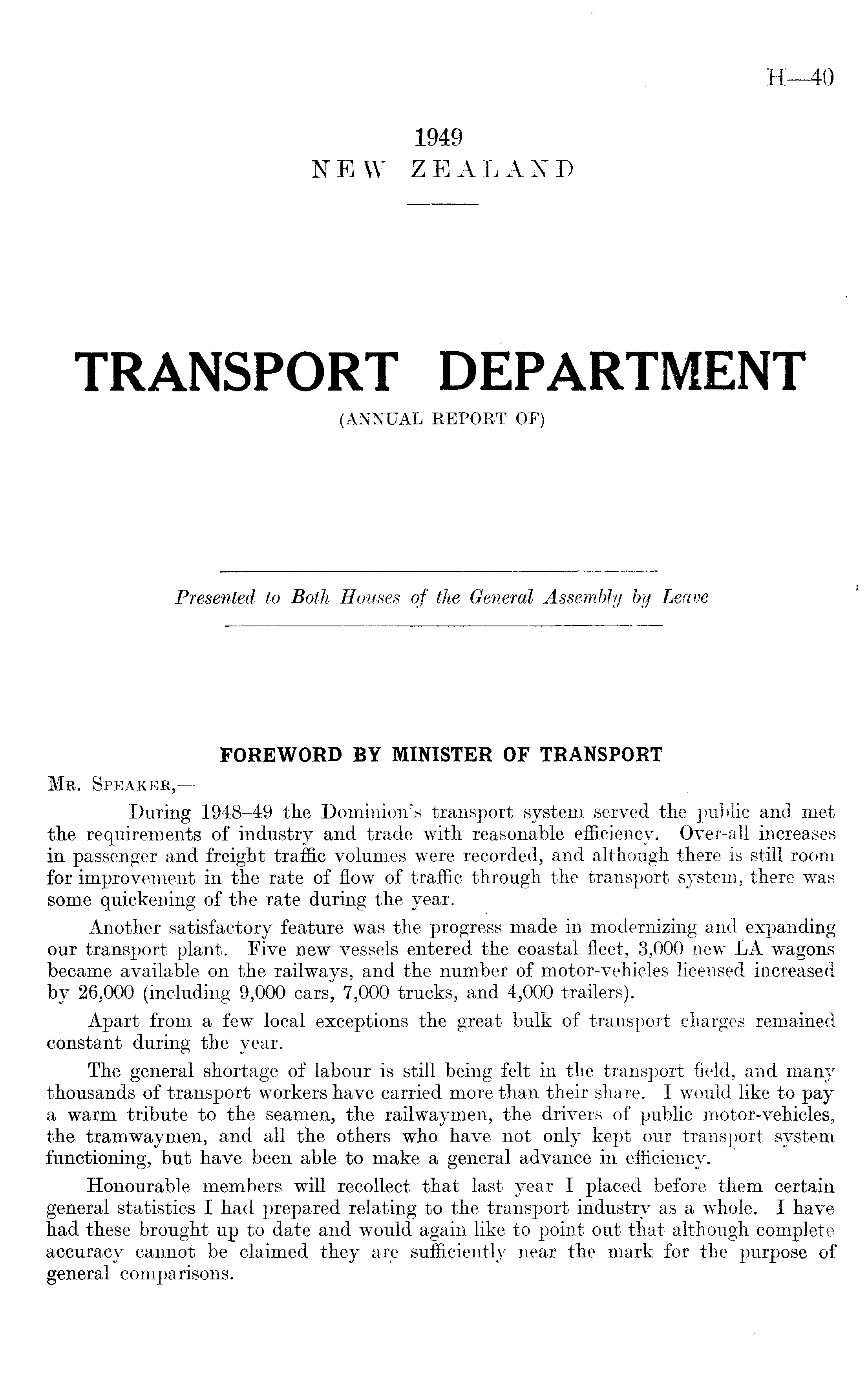 FOREWORD BY MINISTER OF TRANSPORT Me. Speaker,— During 1948-49 the Dominion's transport system served the public and met the requirements of industry and trade with reasonable efficiency. Over-all increases in passenger and freight traffic volumes were recorded, and although there is still room for improvement in the rate of flow of traffic through the transport system, there was some quickening of the rate during the year. Another satisfactory feature was the progress made in modernizing and expanding our transport plant. Five new vessels entered the coastal fleet, 3,000 new LA wagons became available on the railways, and the number of motor-vehicles licensed increased by 26,000 (including 9,000 cars, 7,000 trucks, and 4,000 trailers). Apart from a few local exceptions the great bulk of transport charges remained constant during the year. The general shortage of labour is still being felt in the transport field, and many .thousands of transport workers have carried more than their share. I would like to pay a warm tribute to the seamen, the railwaymen, the drivers of public motor-vehicles, the tramwaymen, and all the others who have not only kept our transport system functioning, but have been able to make a general advance in efficiency. Honourable members will recollect that last year I placed before them certain general statistics I had prepared relating to the transport industry as a whole. I have had these brought up to date and would again like to point out that although complete accuracy cannot be claimed they are sufficiently near the mark for the purpose of general comparisons.