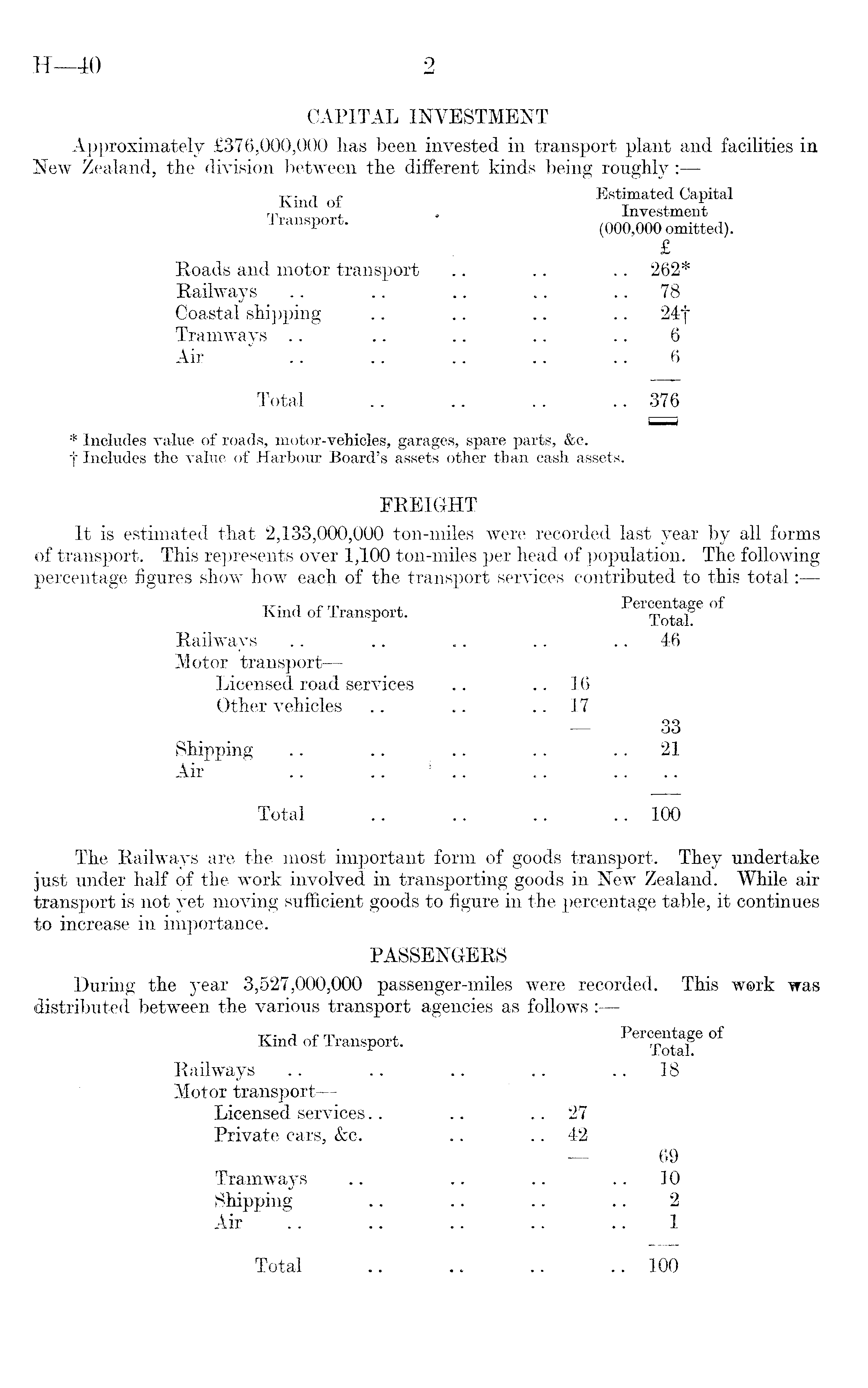 CAPITAL INVESTMENT Approximately £376,000,000 has been invested in transport plant and facilities in New Zealand, the division between the different kinds being roughly:— Kind of Estimated Capital m , , Investment lrans P° rt - (000,000 omitted). £ Roads and motor transport .. .. .. 262* Railways .. .. .. .. 78 Coastal shipping .. .. .. .. 24f Tramways .. .. .. .. .. 6 Air .. .. .. .. .. 6 Total .. .. .. .. 376 * Includes value of roads, motor-vehicles, garages, spare parts, &c. ■f Includes the value of Harbour Board's assets other than cash assets. FREIGHT It is estimated that 2,133,000,000 ton-miles were Recorded last year by all forms of transport. This represents over 1,100 ton-miles per head of population. The following percentage figures show how each of the transport services contributed to this total:— Kind of Transport. Railways .. .. .. .. 46 Motor transport— Licensed road services .. .. 16 Other vehicles .. .. .. 17 33 Shipping .. .. .. .. 21 Air .. .. ' Total .. .. .. .. 100 The Railways are the most important form of .goods transport. They undertake just under half of the work involved in transporting goods in New Zealand. While air transport is not yet moving sufficient goods to figure in the percentage table, it continues to increase in importance. PASSENGERS During the year 3,527,000,000 passenger-miles were recorded. This work was distributed between the various transport agencies as follows : Kind of Transport. Railways .. .. .. .. 18 Motor transport — Licensed services.. .. 27 Private cars, &c. .. .. 42 69 Tramways .. .. .. 10 Shipping .. .. .. .. 2 Air .. .. .. .. .. 1 Total .. .. .. .. 100