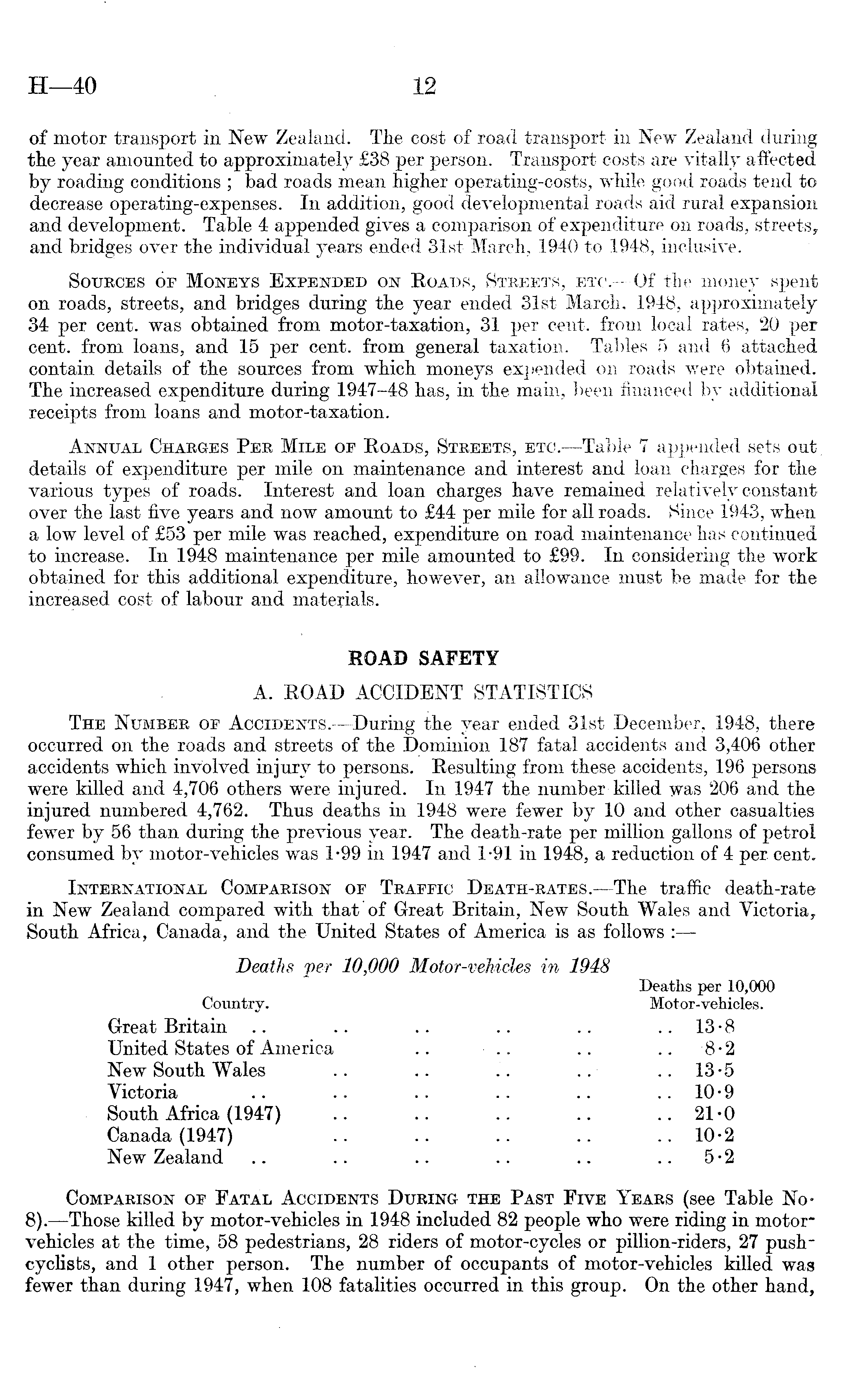 of motor transport in New Zealand. The cost of road transport in New Zealand during the year amounted to approximately £3B per person. Transport costs are vitally affected by roading conditions ; bad roads mean higher operating-costs, while good roads tend to decrease operating-expenses. In addition, good developmental roads aid rural expansion and development. Table 4 appended gives a comparison of expenditure on roads, streets, and bridges over the individual years ended 31st March, 1940 to 1948, inclusive. Sources of Moneys Expended on Roads, Streets, etc. —Of the money spent on roads, streets, and bridges during the year ended 31st March, 1948, approximately 34 per cent, was obtained from motor-taxation, 31 per cent, from local rates, 20 per cent, from loans, and 15 per cent, from general taxation. Tables 5 and 6 attached contain details of the sources from which moneys expended on roads were obtained. The increased expenditure during 1947-48 has, in the main, been financed by additional receipts from loans and motor-taxation. Annual Charges Per Mile oe Roads, Streets, etc. —Table 7 appended sets out details of expenditure per mile on maintenance and interest and loan charges for the various types of roads. Interest and loan charges have remained relatively constant over the last five years and now amount to £44 per mile for all roads. Since 1943, when a low level of £53 per mile was reached, expenditure on road maintenance has continued to increase. In 1948 maintenance per mile amounted to £99. In considering the work obtained for this additional expenditure, however, an allowance must be made for the increased cost of labour and materials. ROAD SAFETY A. ROAD ACCIDENT STATISTICS The Number op Accidents. —During the year ended 31st December, 1948, there occurred on the roads and streets of the Dominion 187 fatal accidents and 3,406 other accidents which involved injury to persons. Resulting from these accidents, 196 persons were killed and 4,706 others were injured. In 1947 the number killed was 206 and the injured numbered 4,762. Thus deaths in 1948 were fewer by 10 and other casualties fewer by 56 than during the previous year. The death-rate per million gallons of petrol consumed by motor-vehicles was 1-99 in 1947 and 1-91 in 1948, a reduction of 4 per cent. International Comparison of Traffic Death-rates.—The traffic death-rate in New Zealand compared with that of Great Britain, New South Wales and Victoria, South Africa, Canada, and the United States of America is as follows Deaths per 10,000 Motor-vehicles in 1948 Deaths per 10,000 Country. Motor-vehicles. Great Britain .. .. .. .. .. ..13*8 United States of America .. .. .. .. 8-2 New South Wales .. .. .. .. .. 13-5 Victoria .. .. .. .. .. .. 10 • 9 . South Africa (1947) .. .. .. .. ..21-0 Canada (1947) .. .. .. .. .. 10-2 New Zealand .. .. .. .. .. ..5-2 Comparison of Fatal Accidents During the Past Five Years (see Table No--8). —Those killed by motor-vehicles in 1948 included 82 people who were riding in motorvehicles at the time, 58 pedestrians, 28 riders of motor-cycles or pillion-riders, 27 pushcyclists, and 1 other person. The number of occupants of motor-vehicles killed was fewer than during 1947, when 108 fatalities occurred in this group. On the other hand,